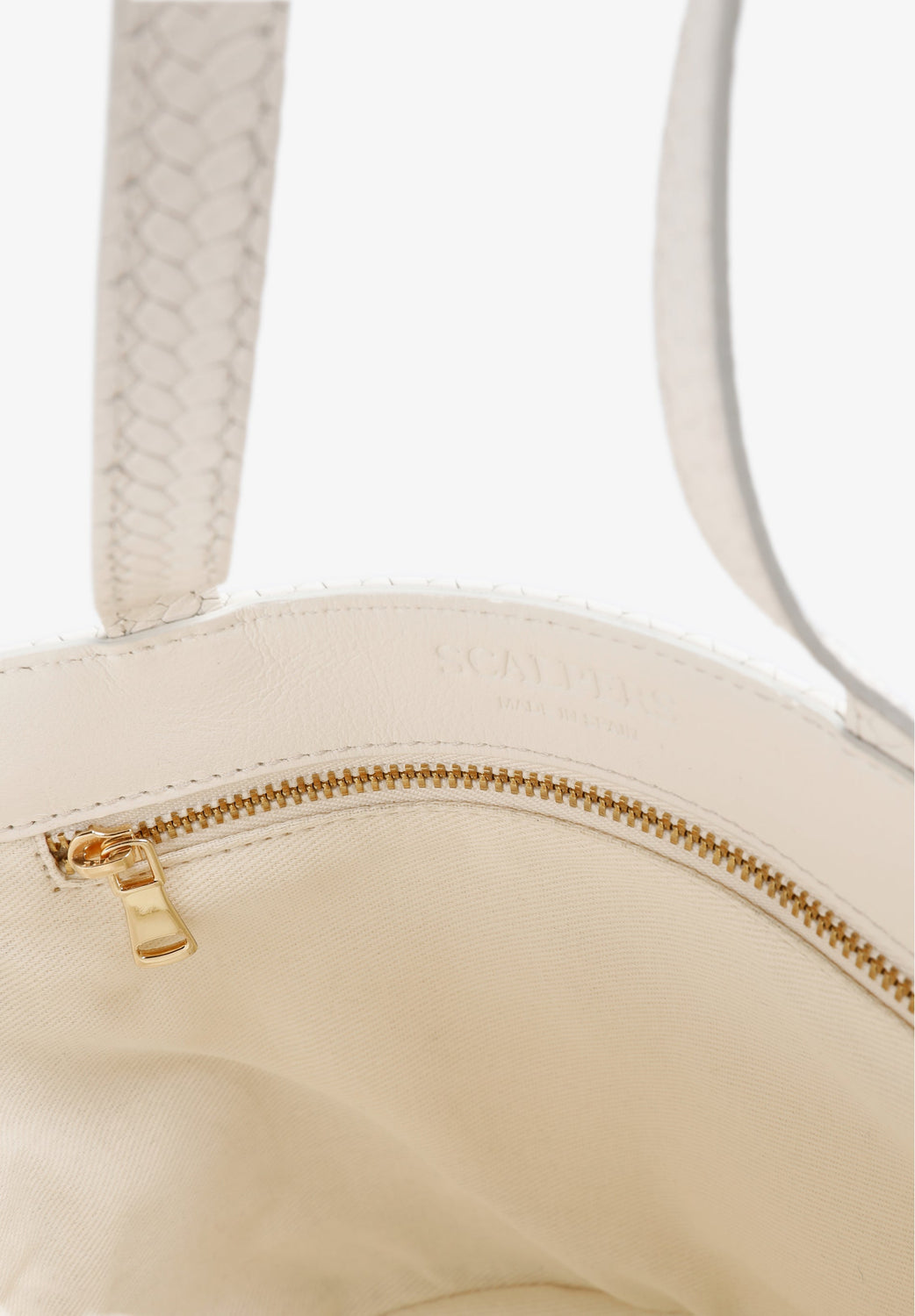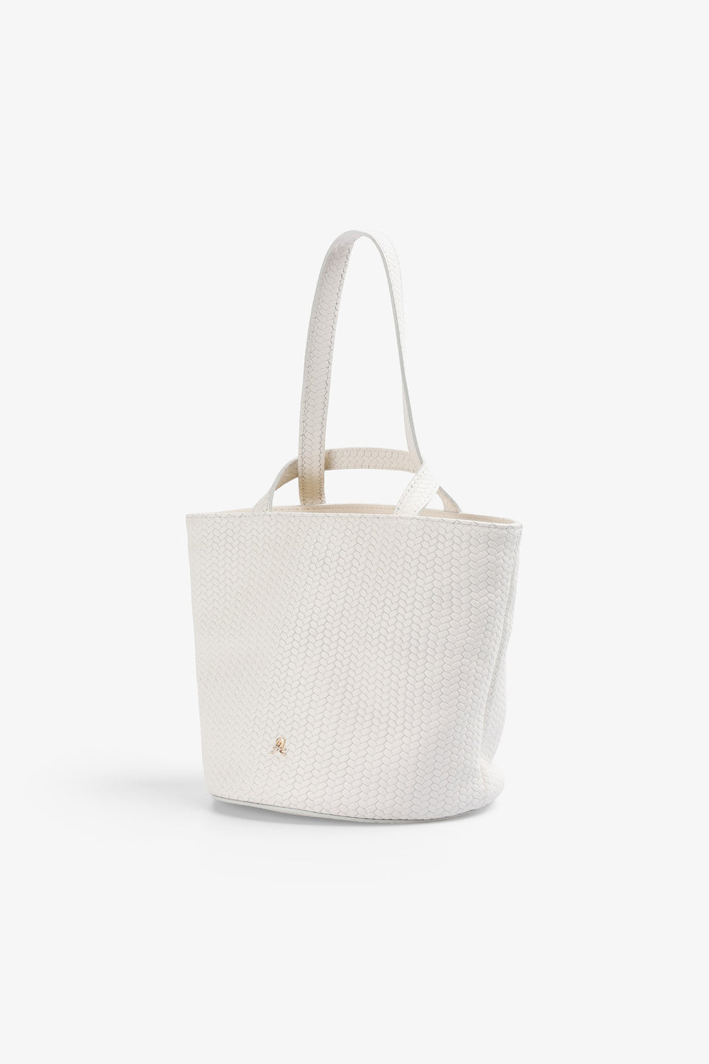 Bolso cubo confeccionado en 100% piel trenzada. Forro interior con bolsillo con cremallera. Detalle de logo metalizado en frontal. Asa corta.