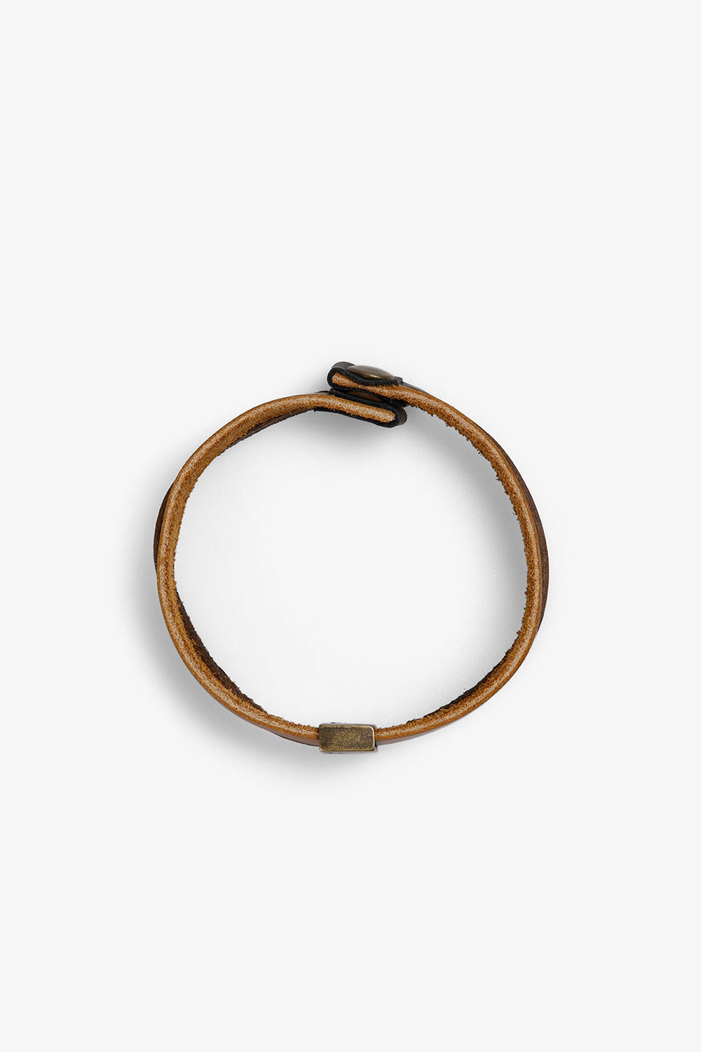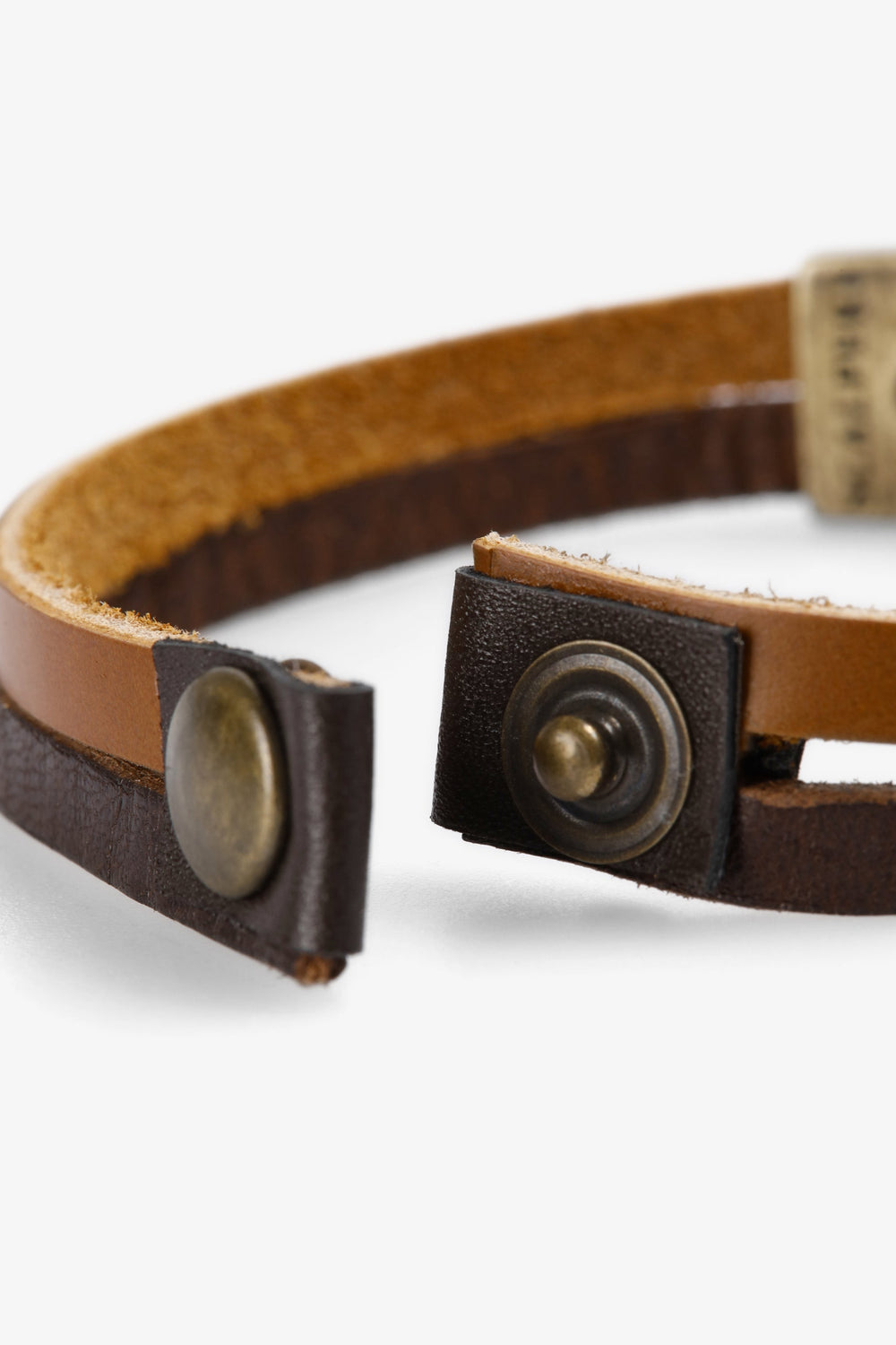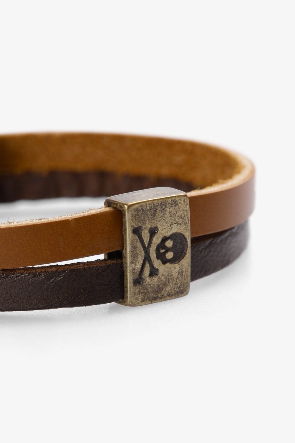 Pulsera doble color confeccionada en 100% piel. Detalle de calavera frontal y cierre mediante botón.