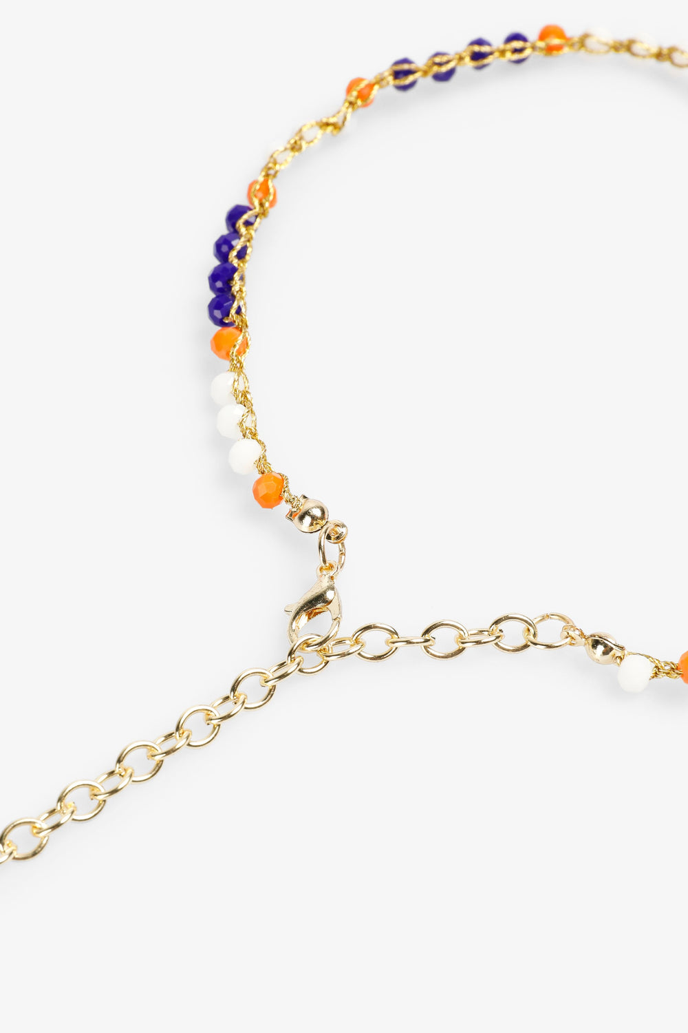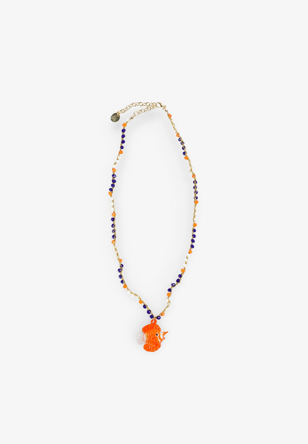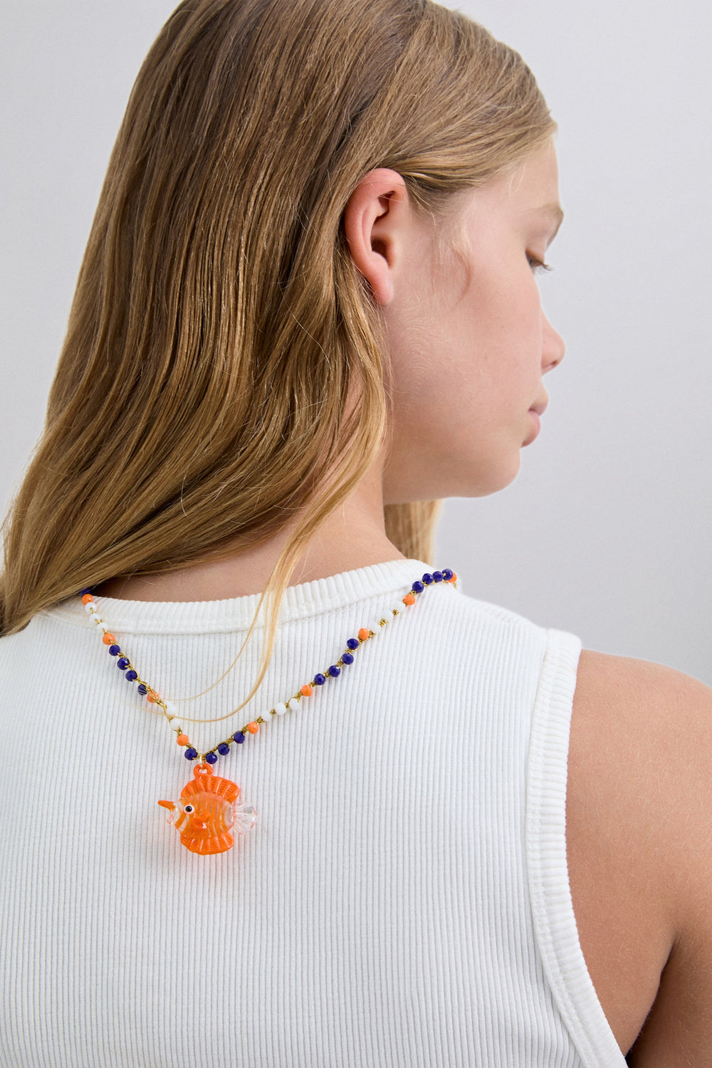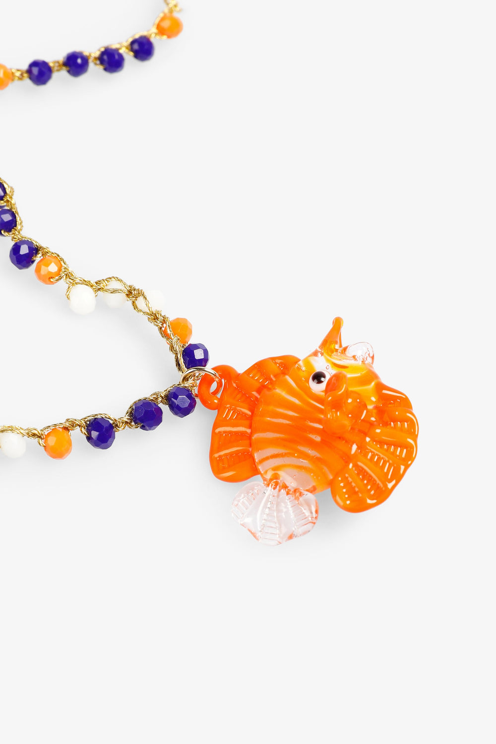Collar de cuentas de cristal tricolor con detalle de pez.