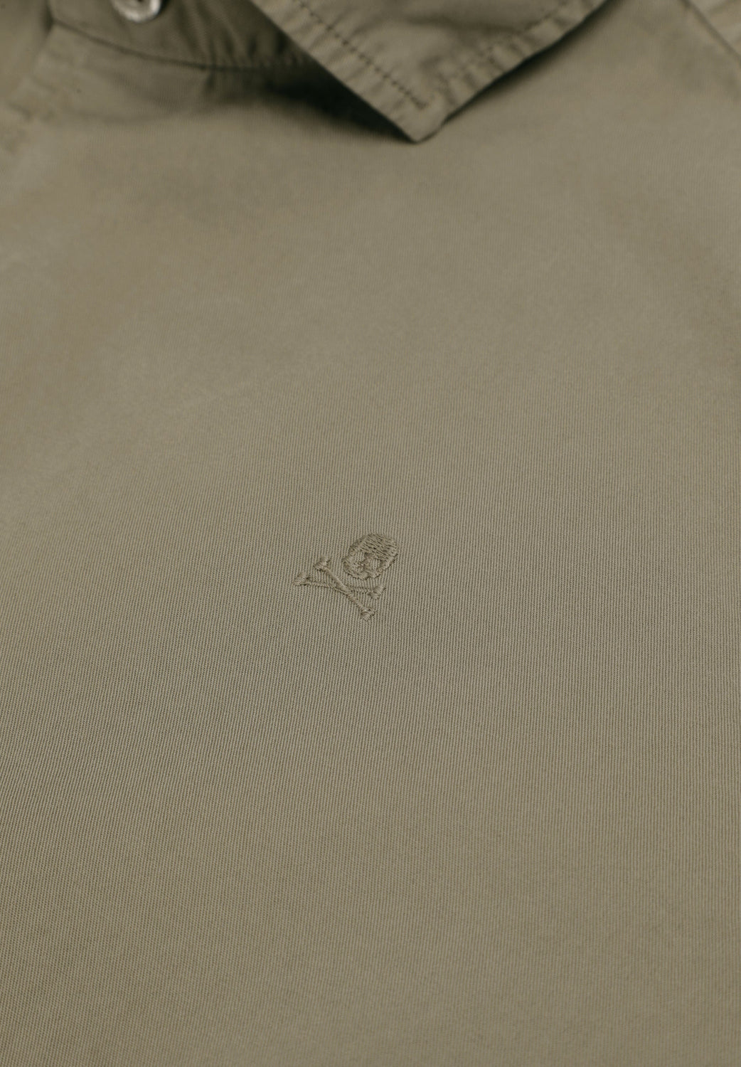 Camisa confeccionada en 100% algodón BCI. Corte regular. Cuello italiano. Cierre frontal abotonado. Manga larga con puños abotonados. Detalle de calavera bordada a tono.