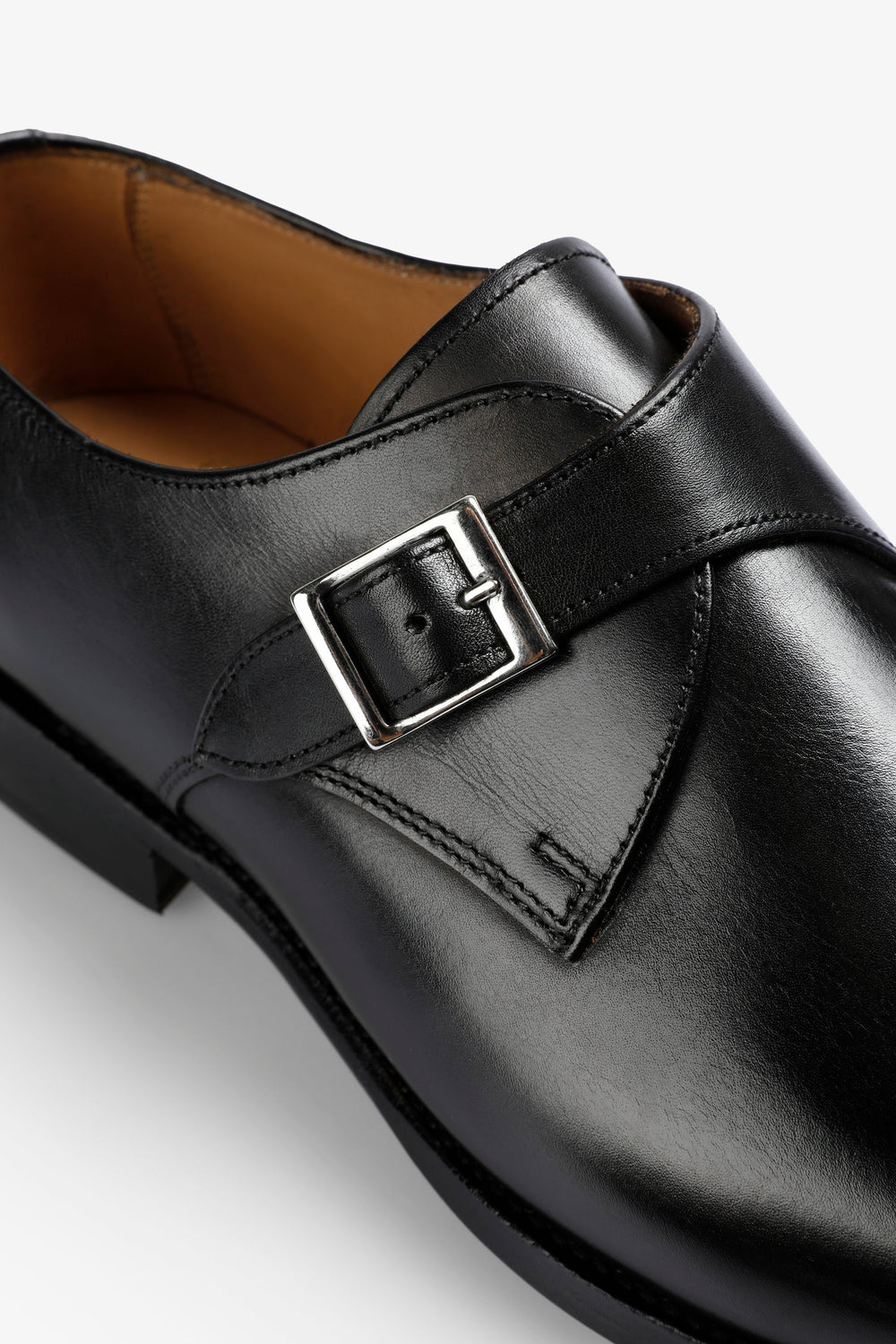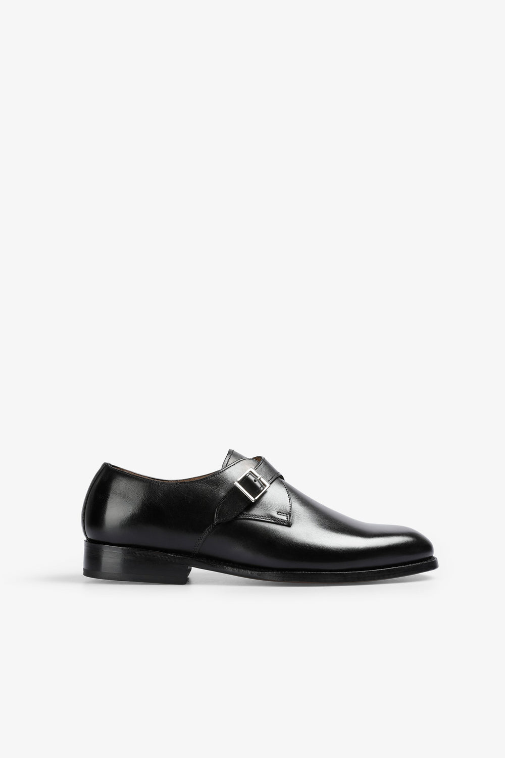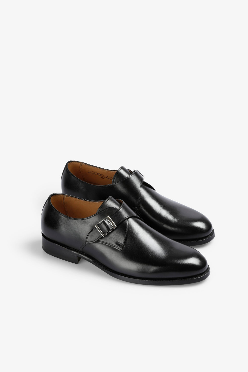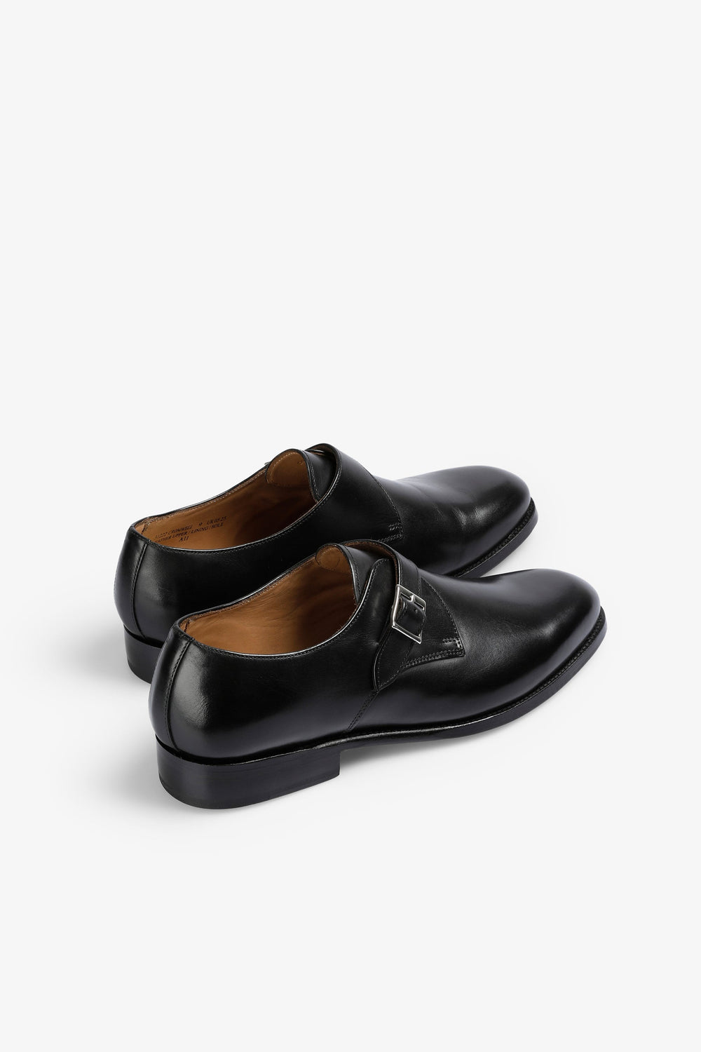 Zapatos monk confeccionados en cuero. Cierra con hebilla metálica ajustable. Suela de piel. Detalle de logo en plantilla.