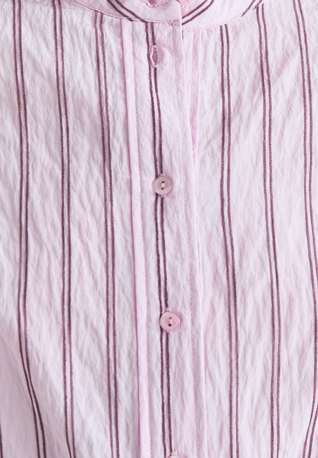 Camisa de rayas confeccionada en algodón ligeramente elástico. Corte regular fit, cuello ligeramente subido y cierre con botones. Detalle de pliegue frontal con efecto hombrera. Manga larga acabada en puño.