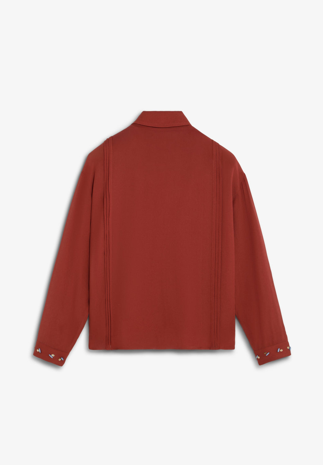 Blusa confeccionada en 100% viscosa. Corte regular fit, cuello clásico, manga larga con terminación en puño. Detalles de apliques en frontal.