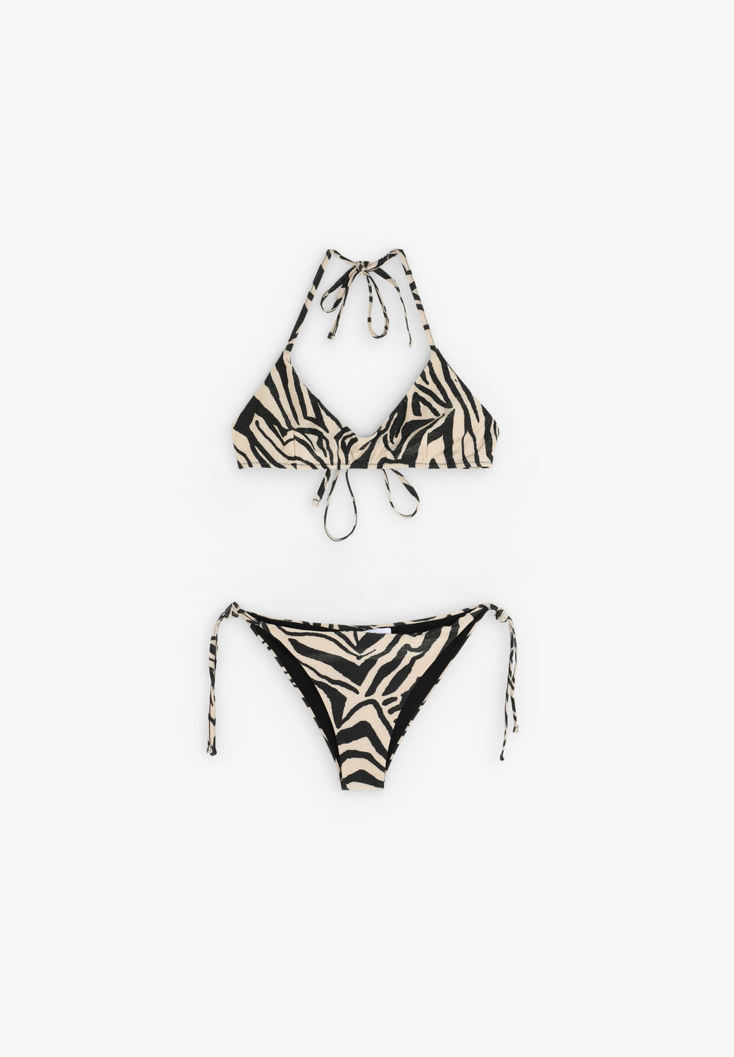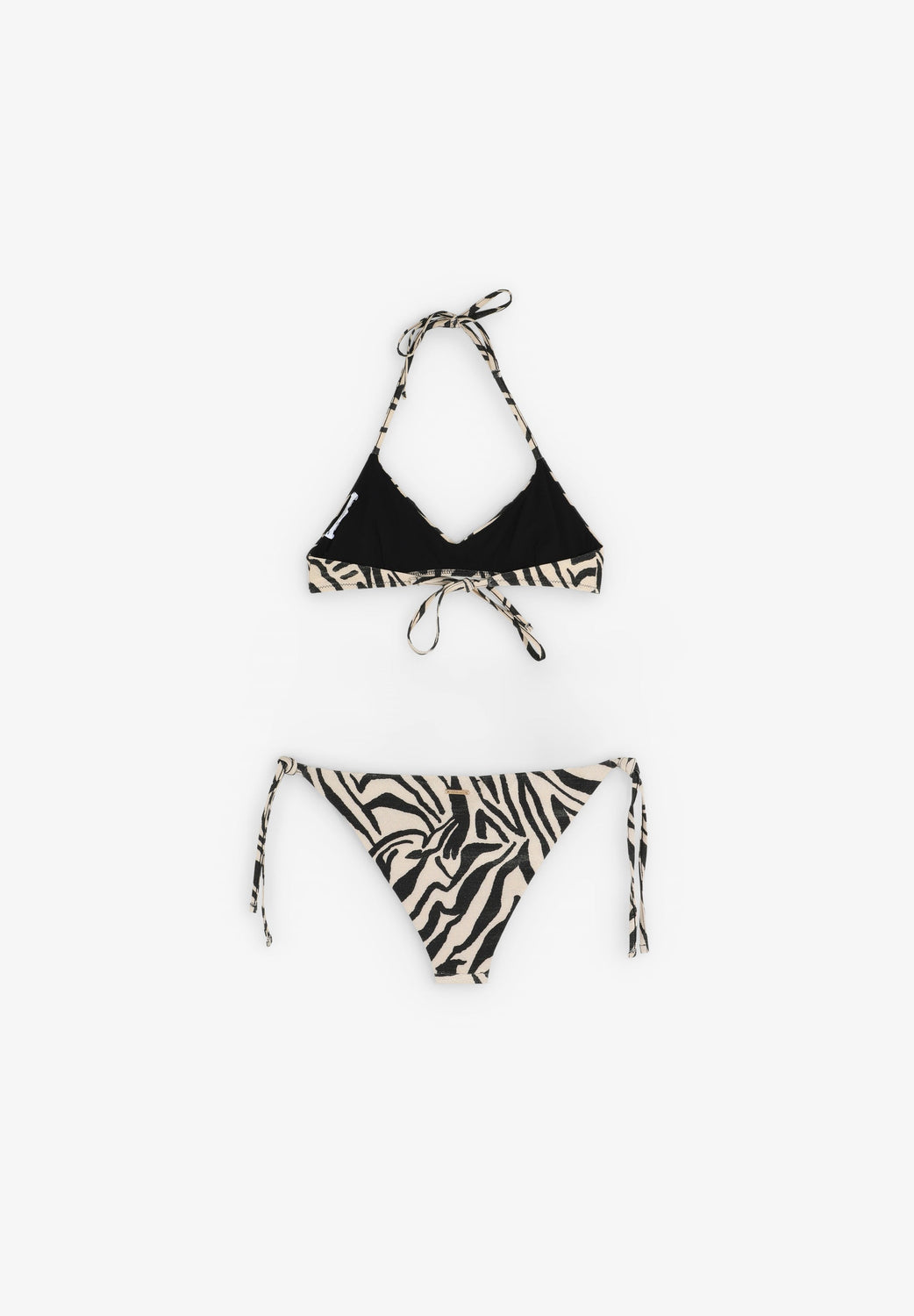 Bikini confeccionado en tejido técnico ligeramente elástico. Parte superior de triángulo con lazada al cuello y en parte trasera. Braguita clásica con lazadas laterales.