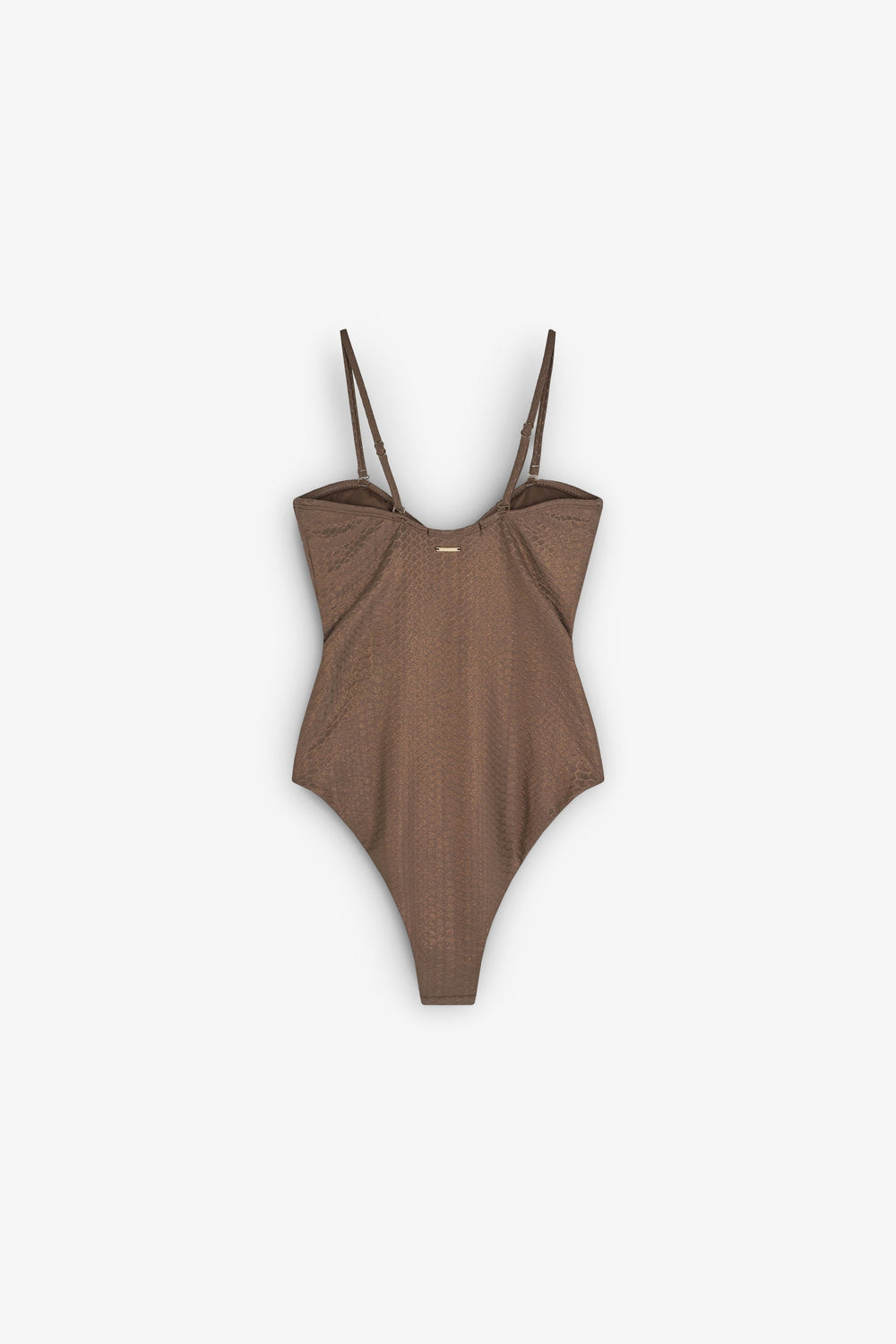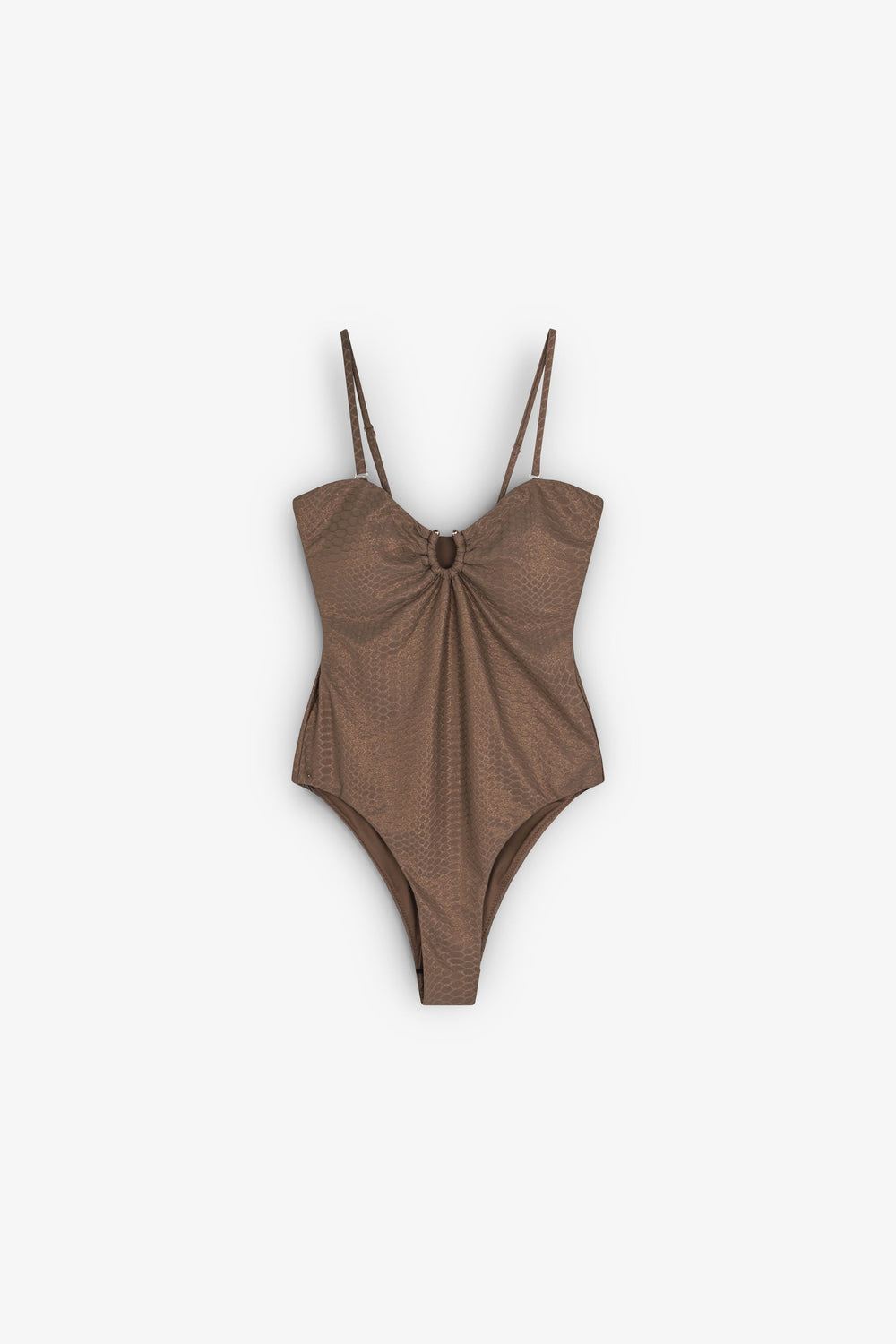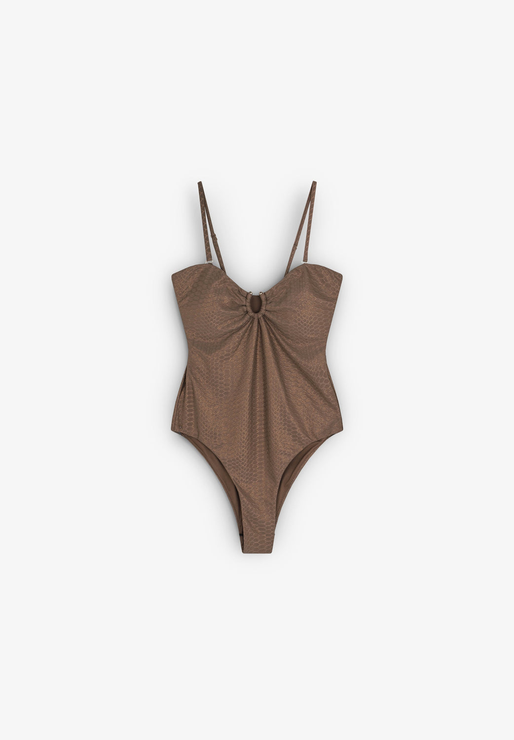 Bañador con textura animal print. Cuello redondo. Tirantes finos. Detalle en frontal. Sin cierre. Forro interior.