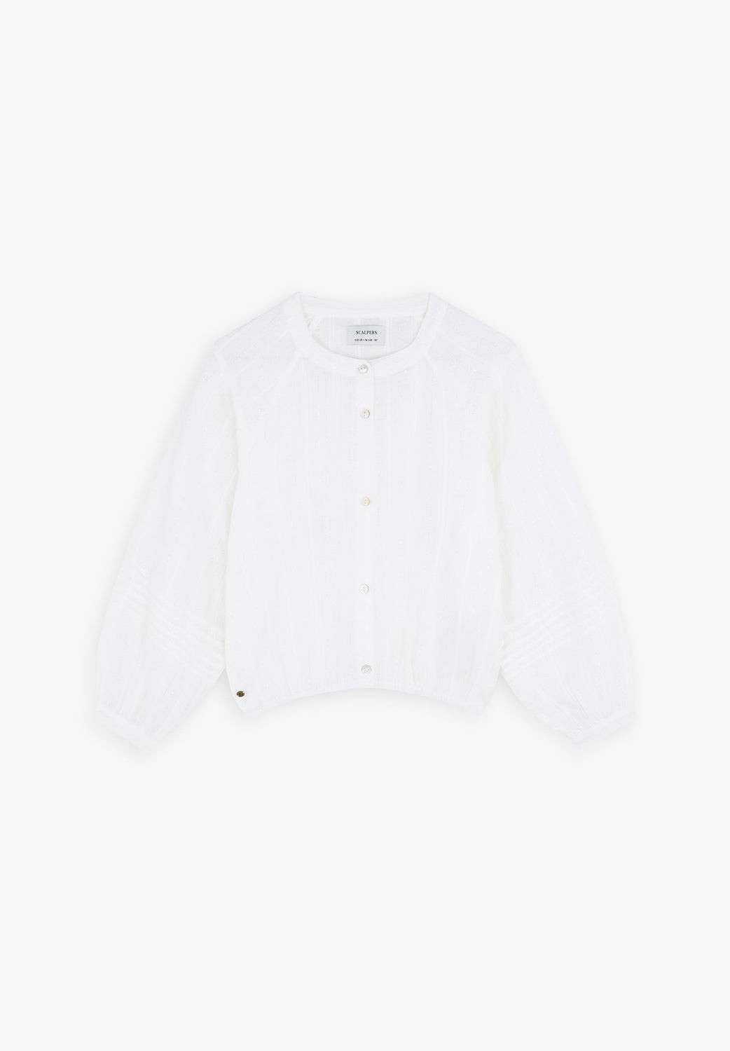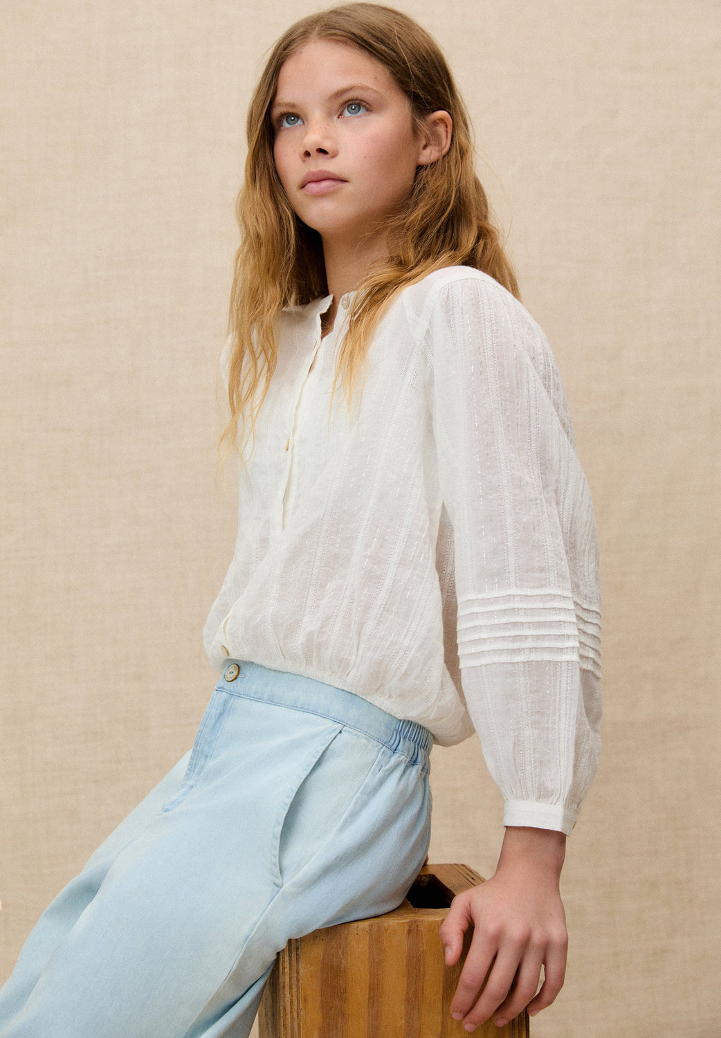 Camisa confeccionada en algodón con cuello tipo Mao. detalle goma en bajo y puños. Detalle bordados en mangas. Cierre con botones en frontal.