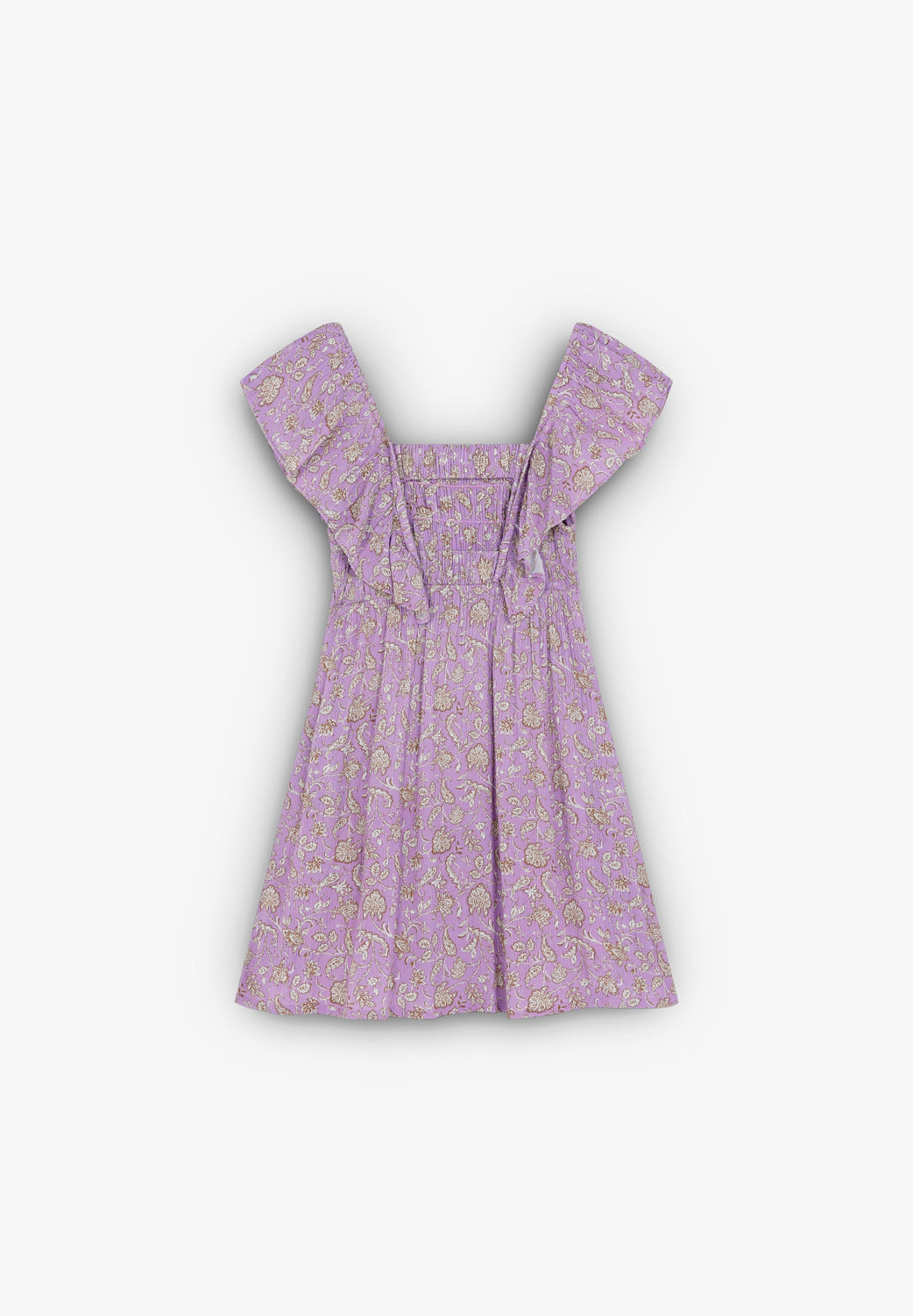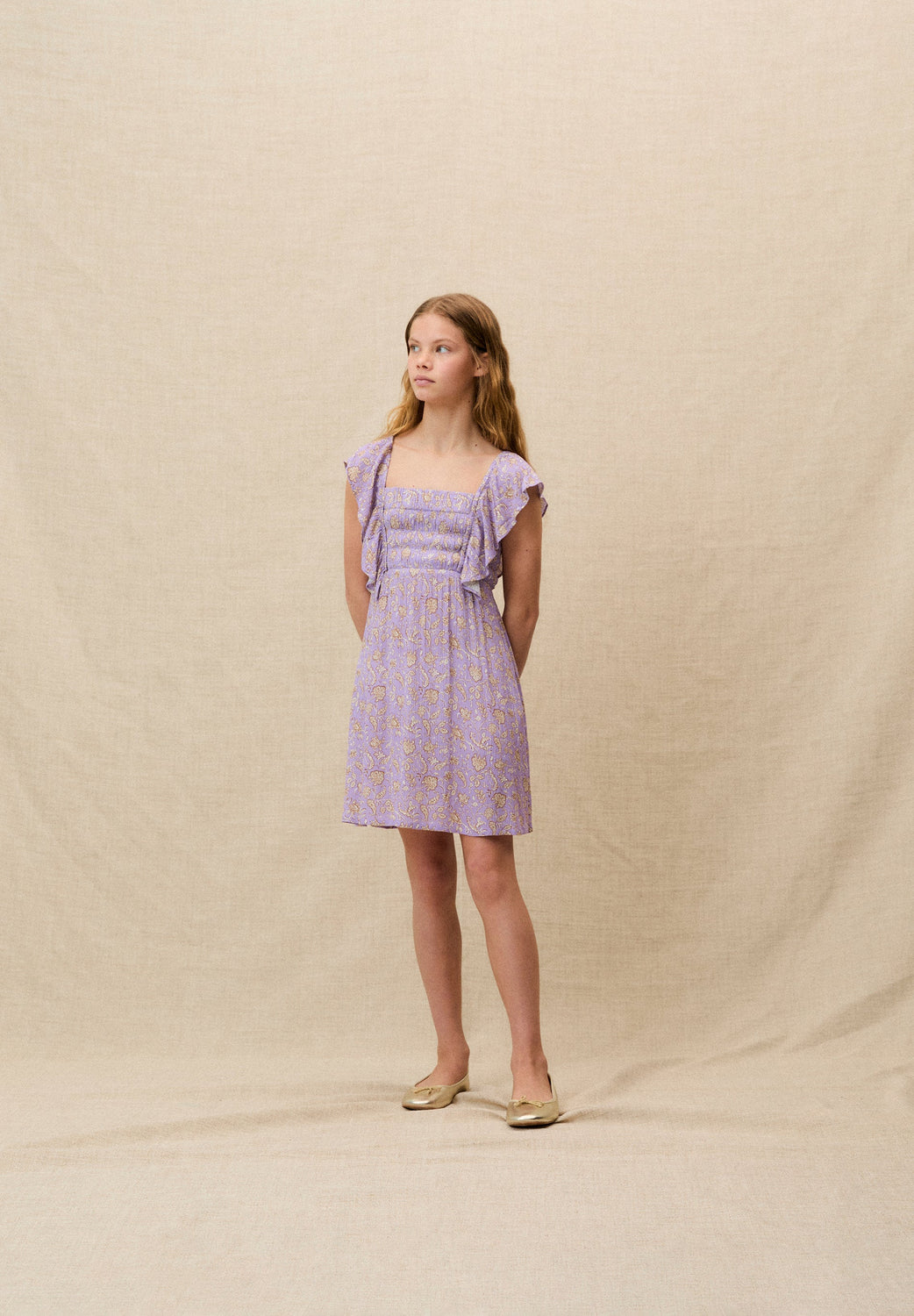 Vestido mini confeccionado en 100% viscosa. Escote cuadrado y manga en sisa con volante. Espalda con abertura y tiras y falda con vuelo.