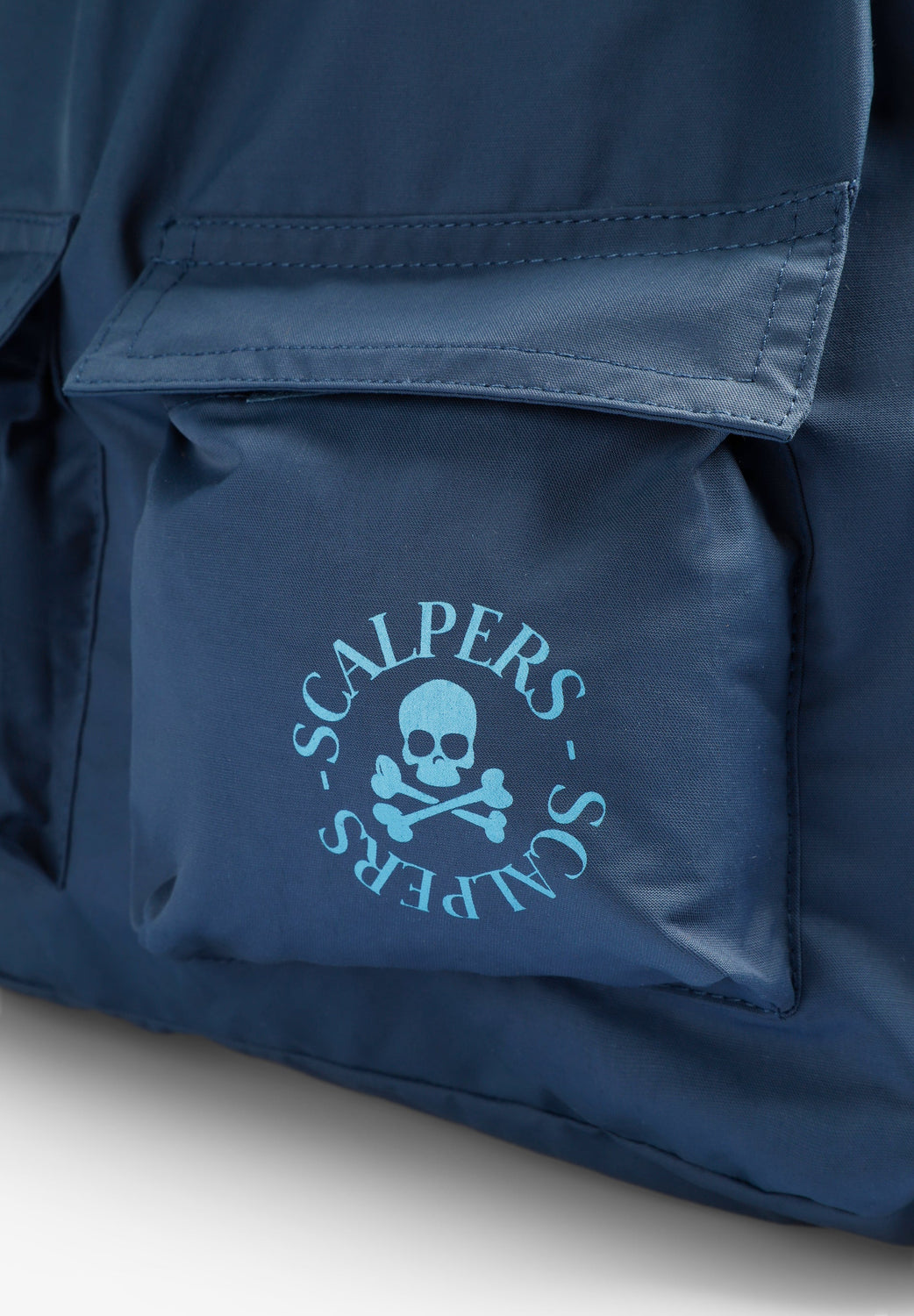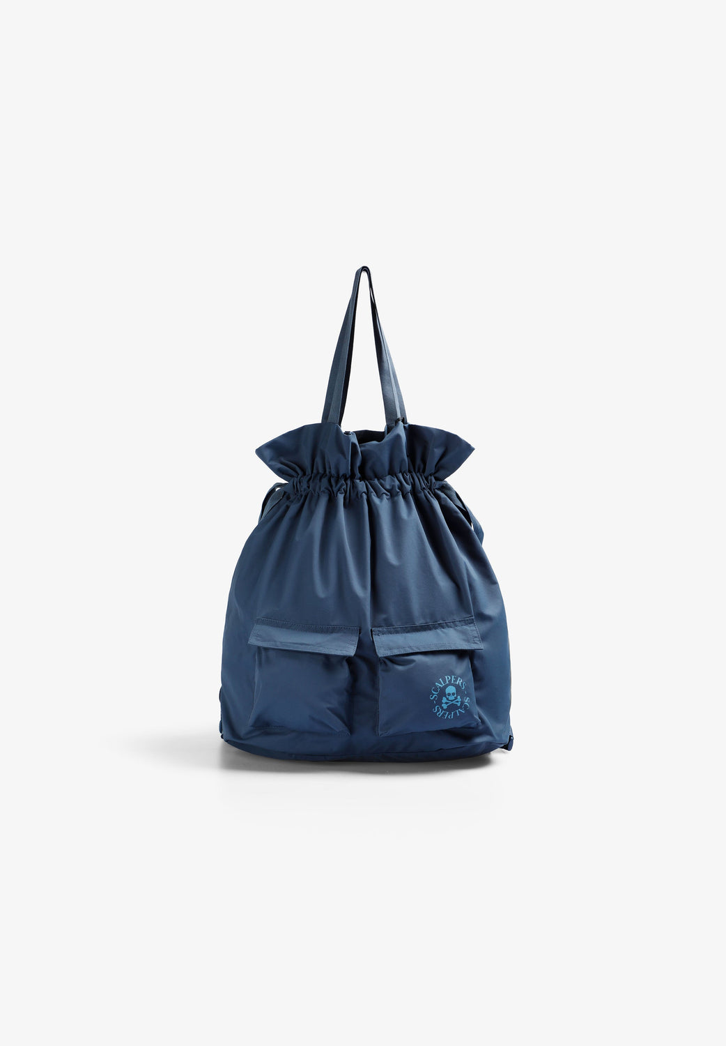 Mochila ligera con cierre en nudo. Doble asa ajustable. Dos bolsillos frontales con tapeta. Print con calavera en bolsillo. Detalle cremallera lateral a contraste.