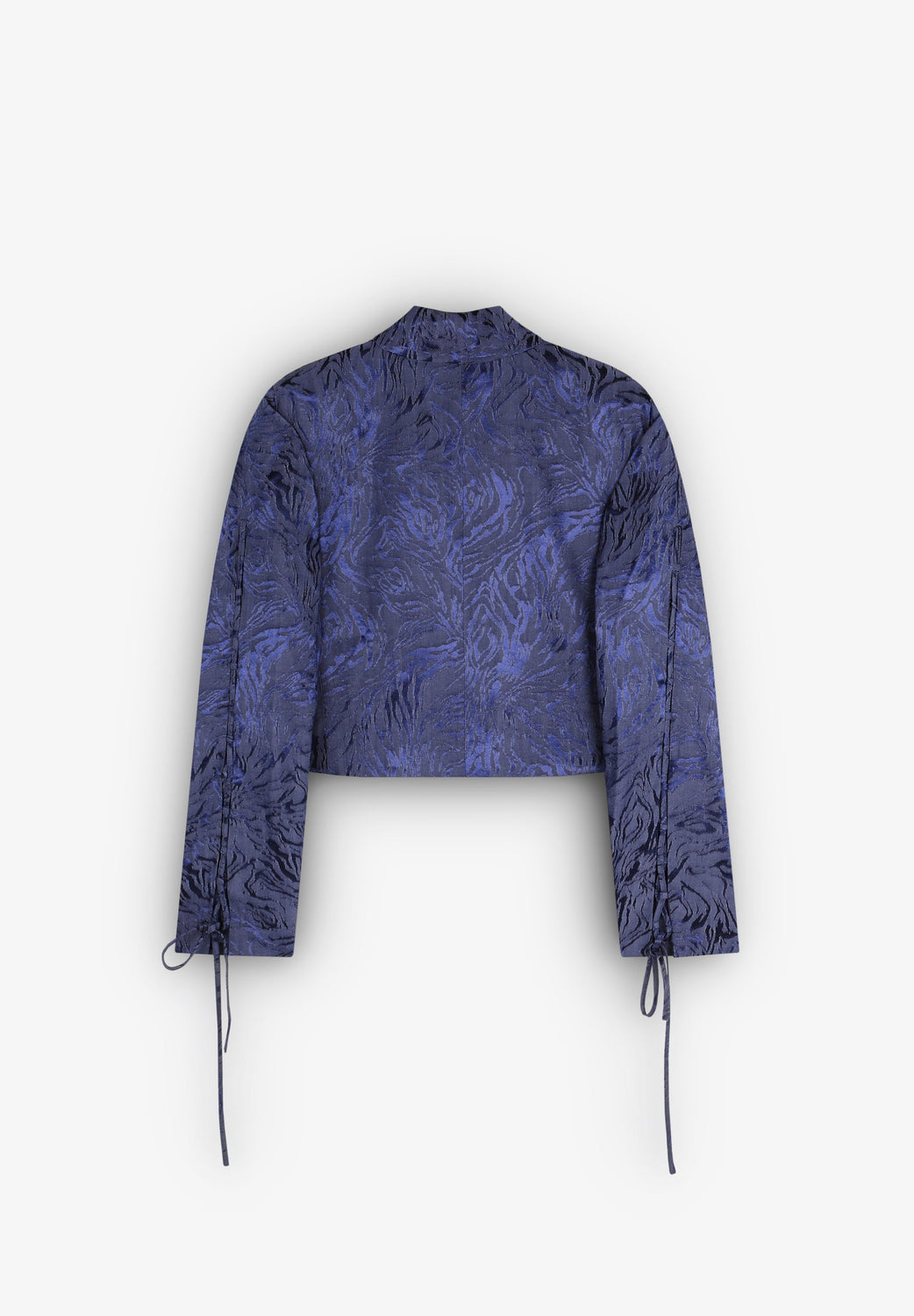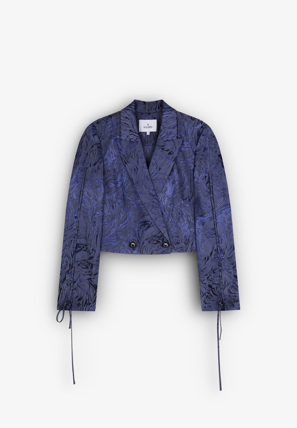 Blazer cropped confeccionada en tejido de jacquard. Regular fit, cuello con solapa punta de lanza y cierre con botones cruzados. Manga larga con detalle de tiras para fruncir.