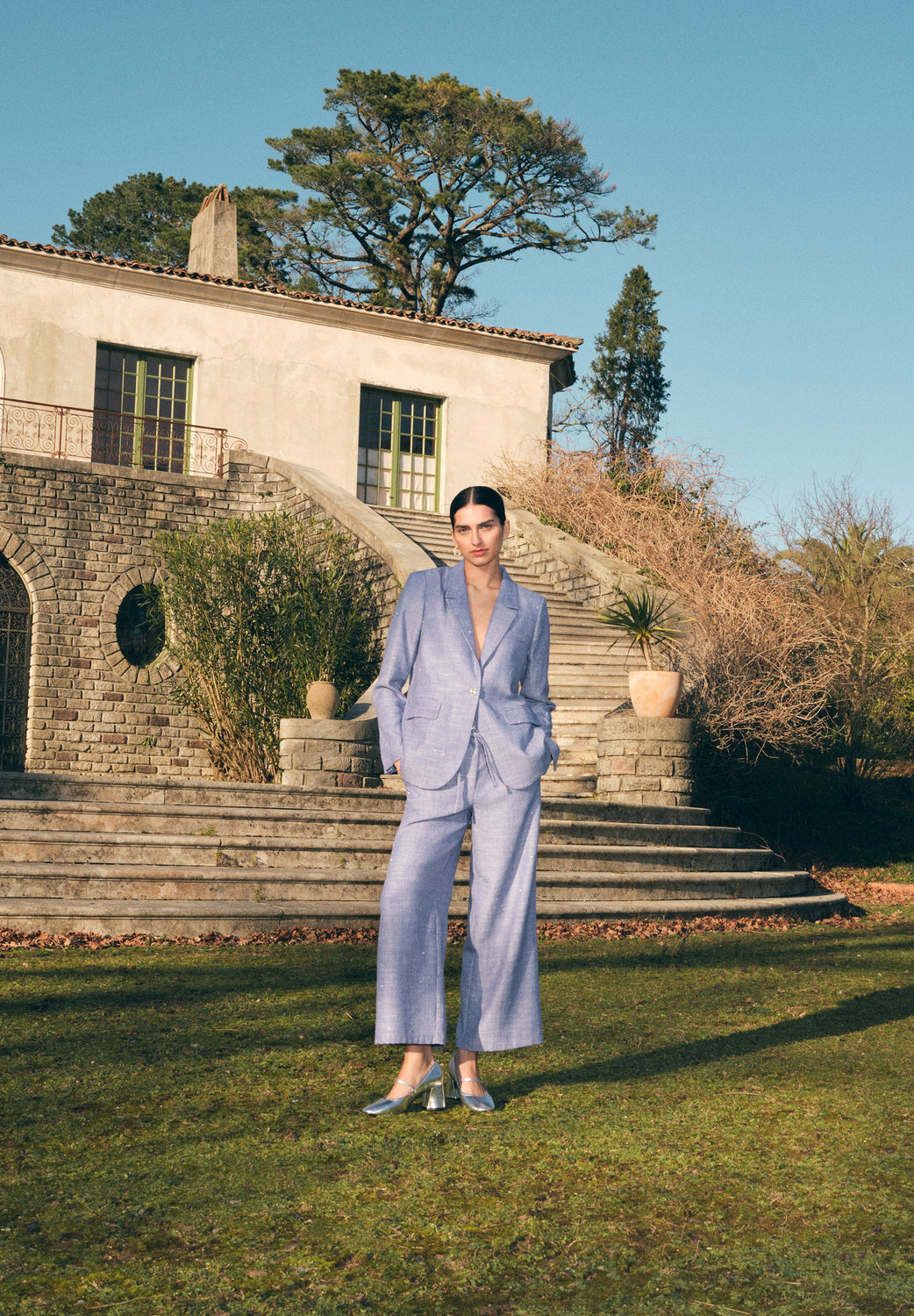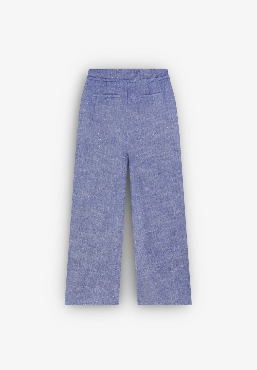 Pantalón confeccionado en mezcla de algodón y lino con detalles de strass. Corte culotte, regular fit, con cierre de cremallera y botón con detalle ajustable de cuerda. Bolsillos de pliegue laterales.