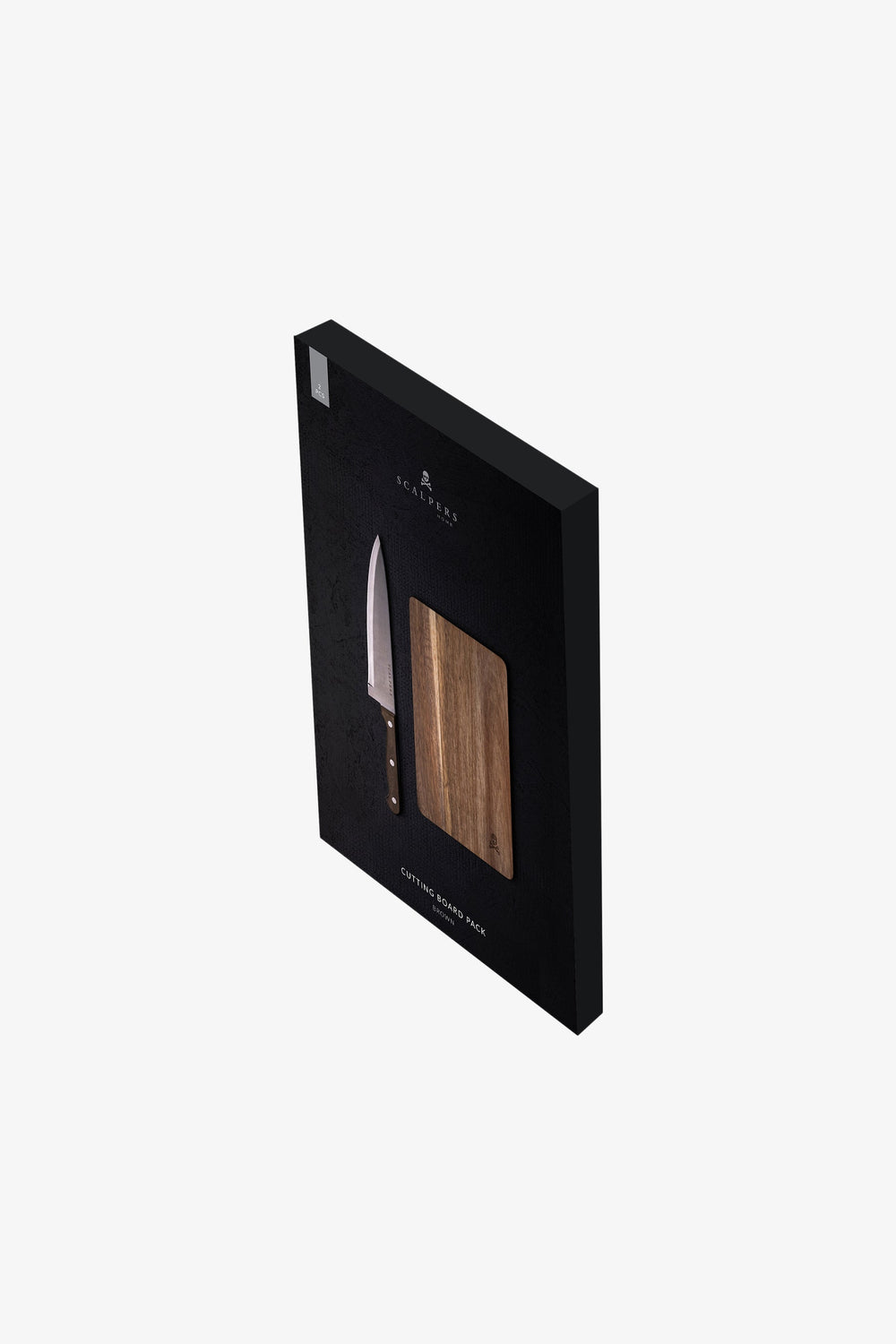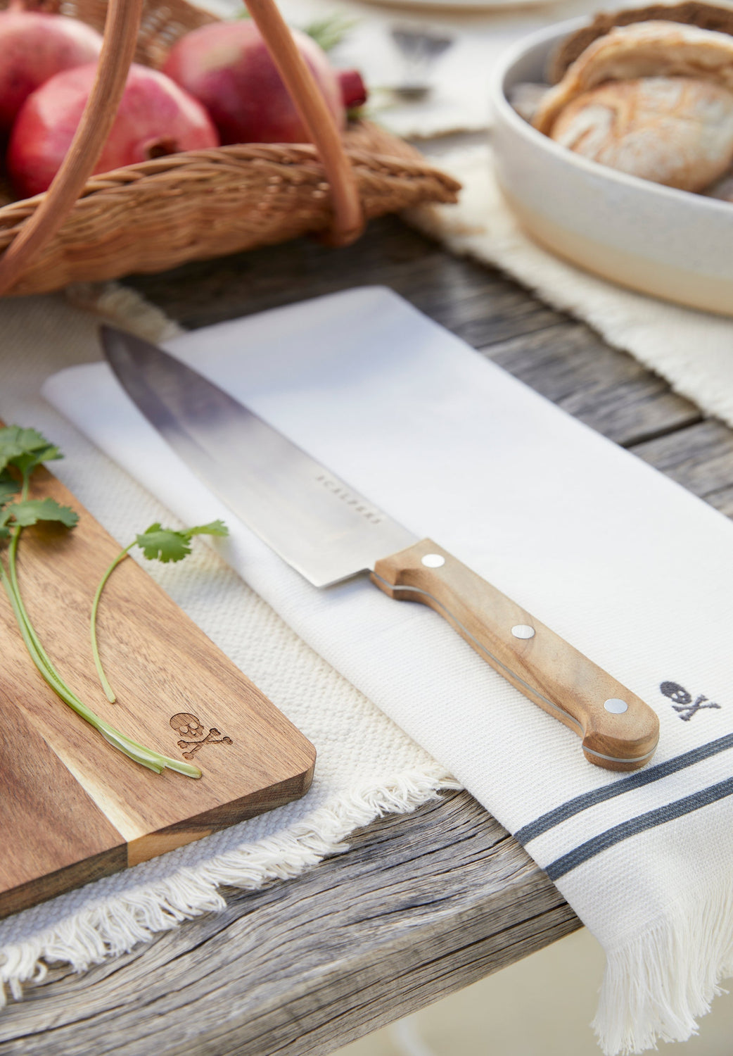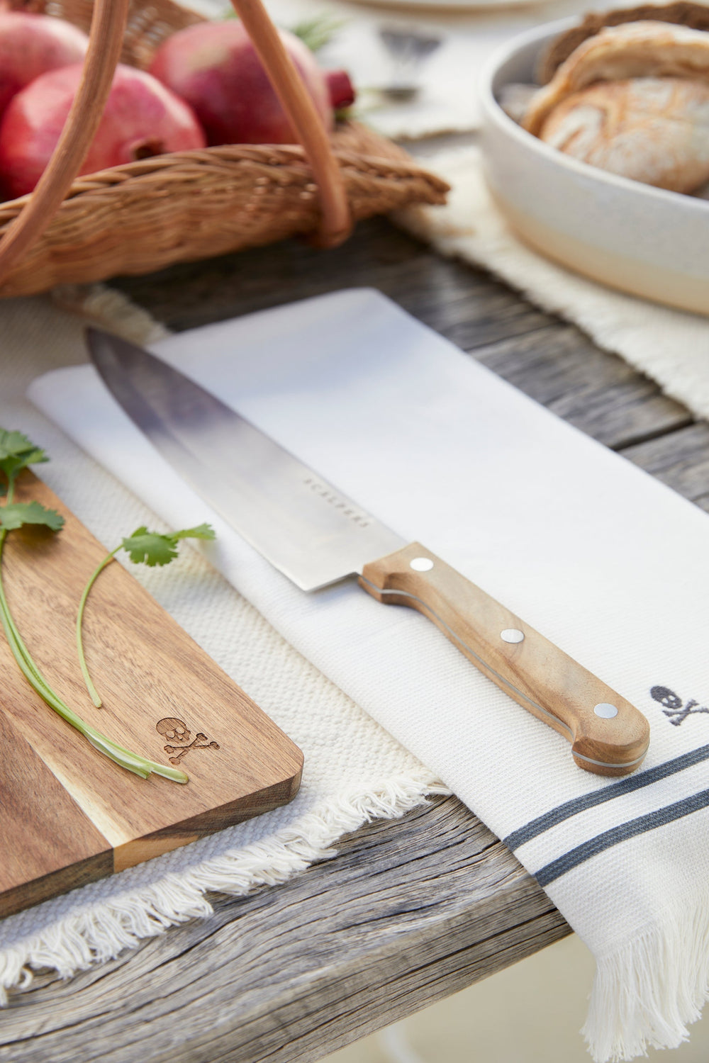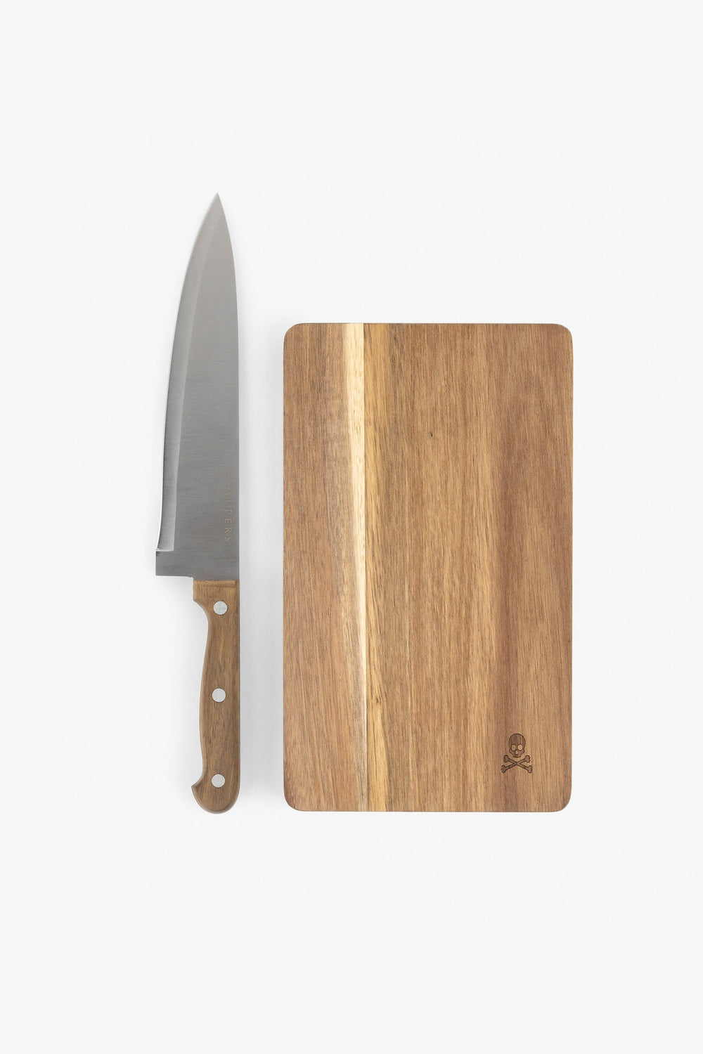 Set de cuchillo y tabla de madera con detalle de calavera.