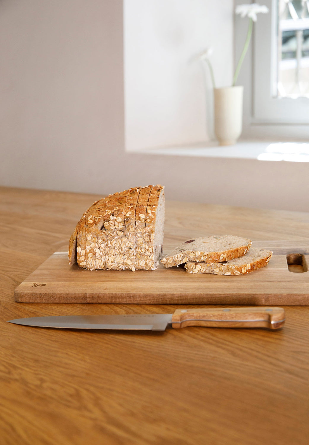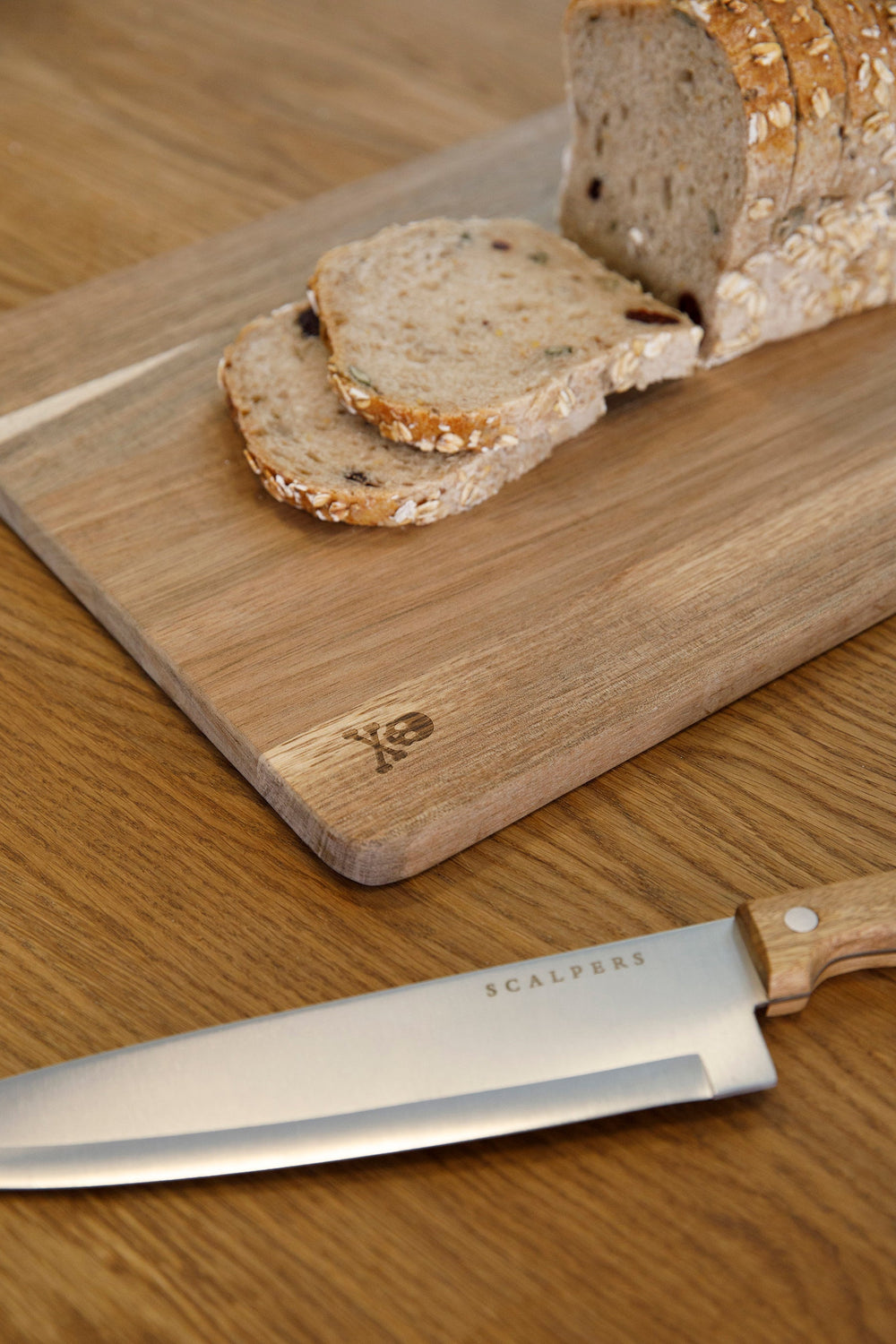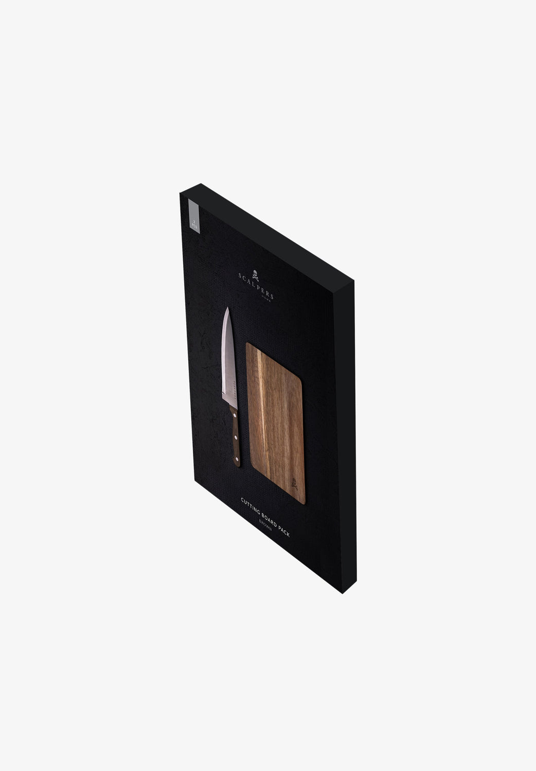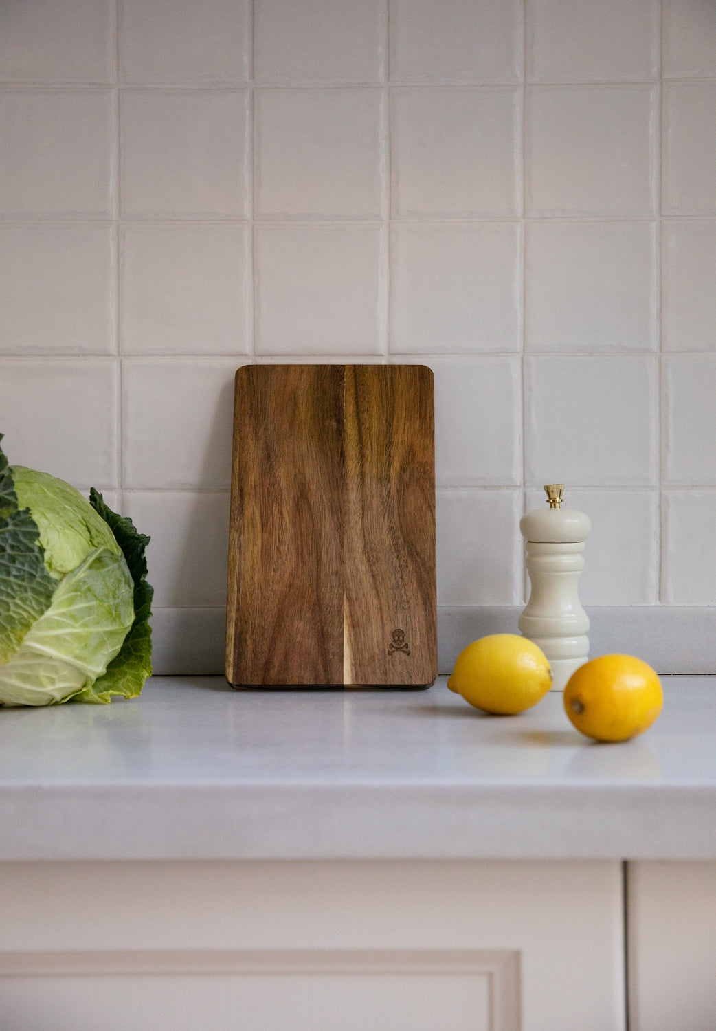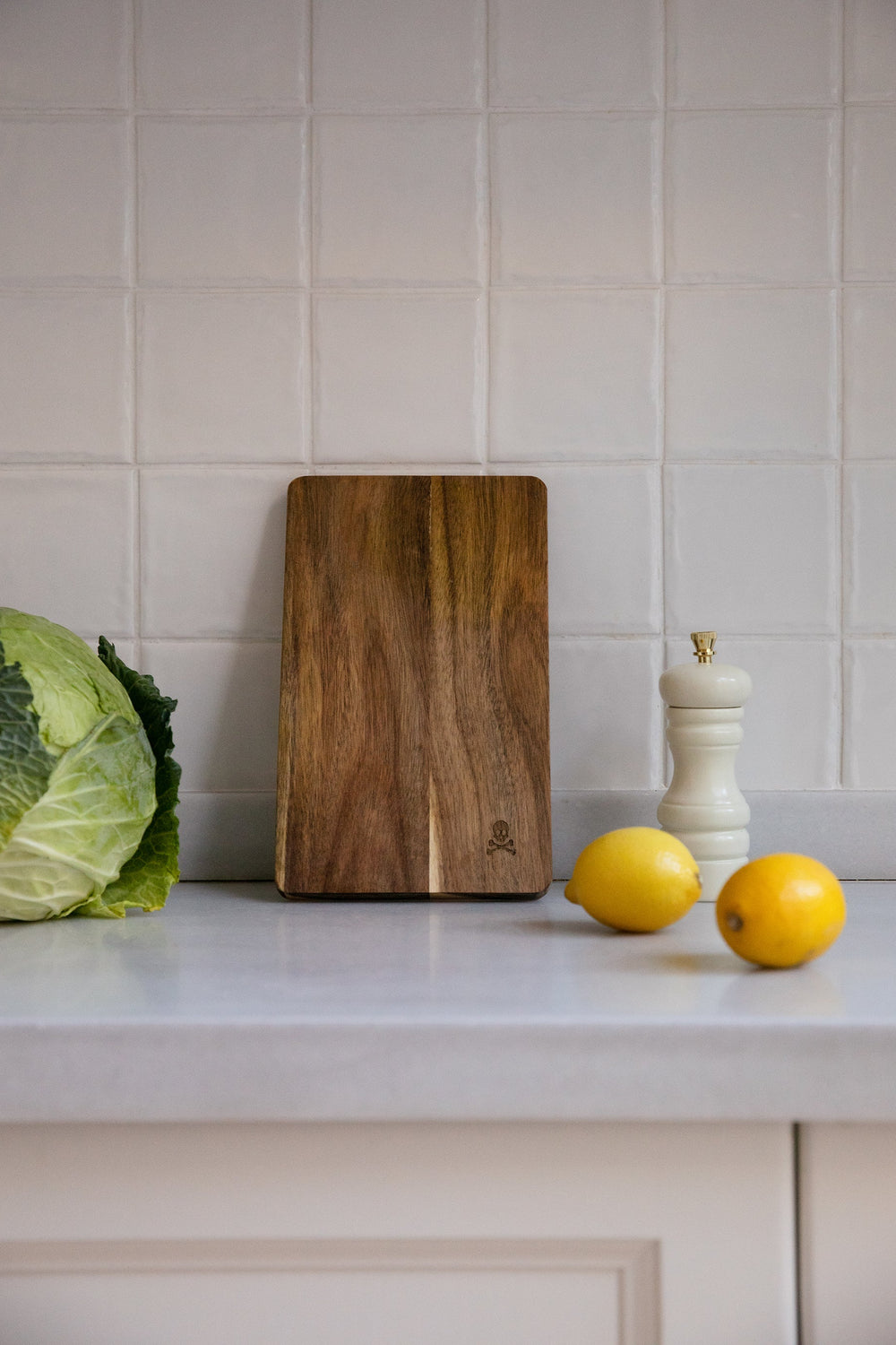 Set de cuchillo y tabla de madera con detalle de calavera.