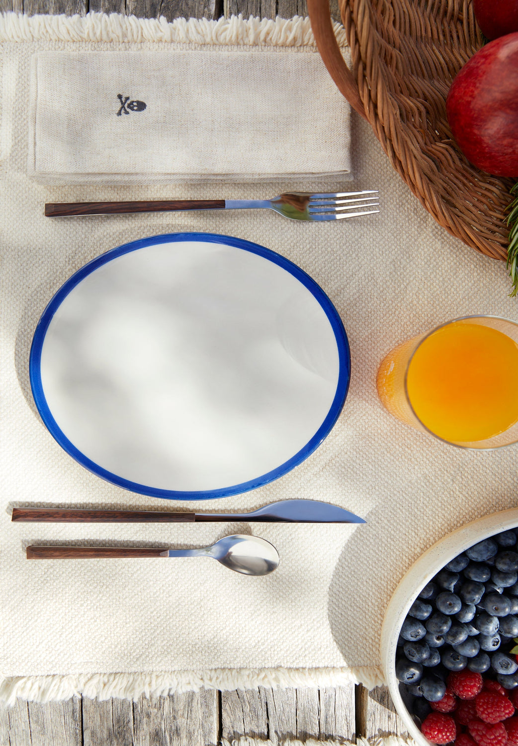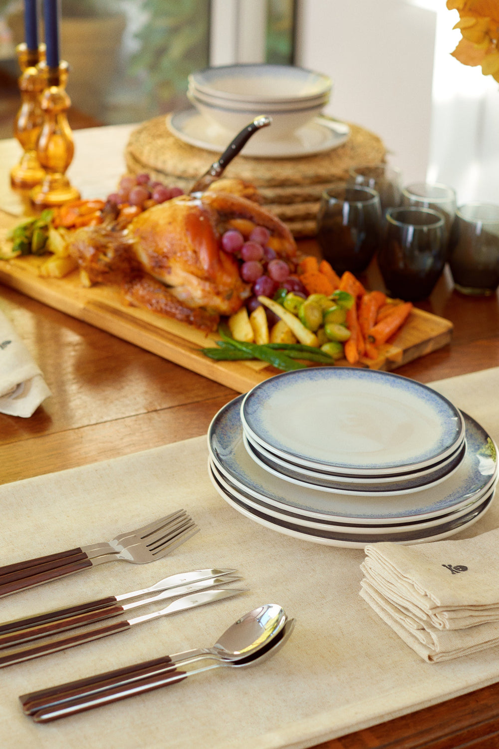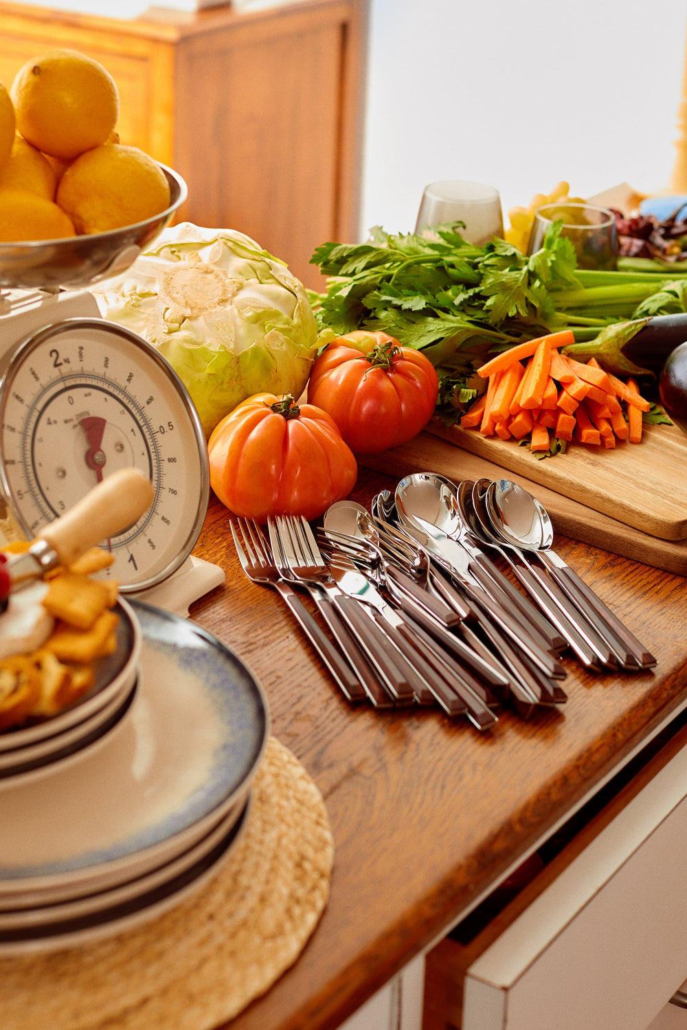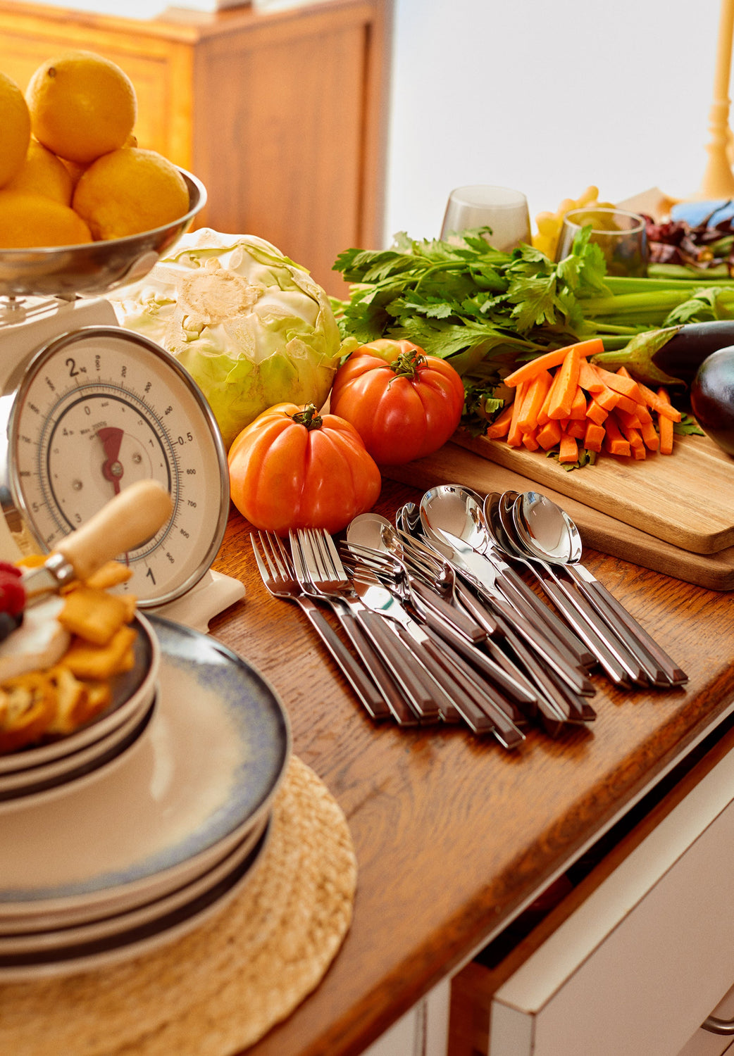 Cubertería con mango fino de resina con diseño en efecto madera.