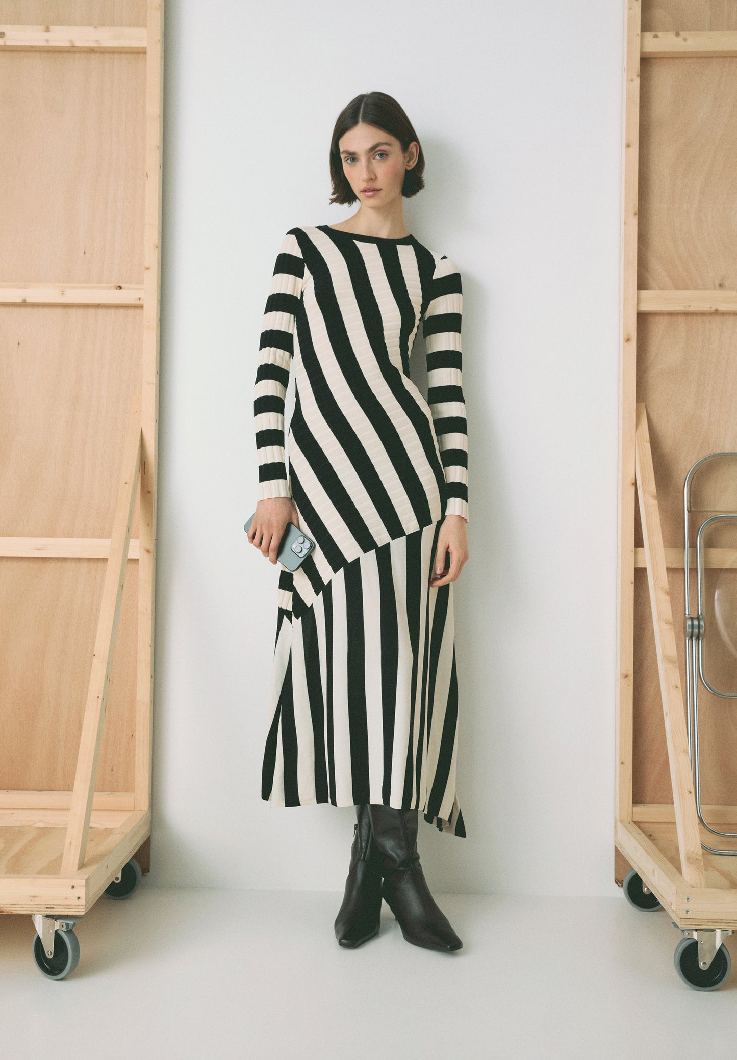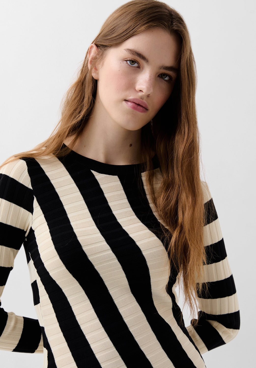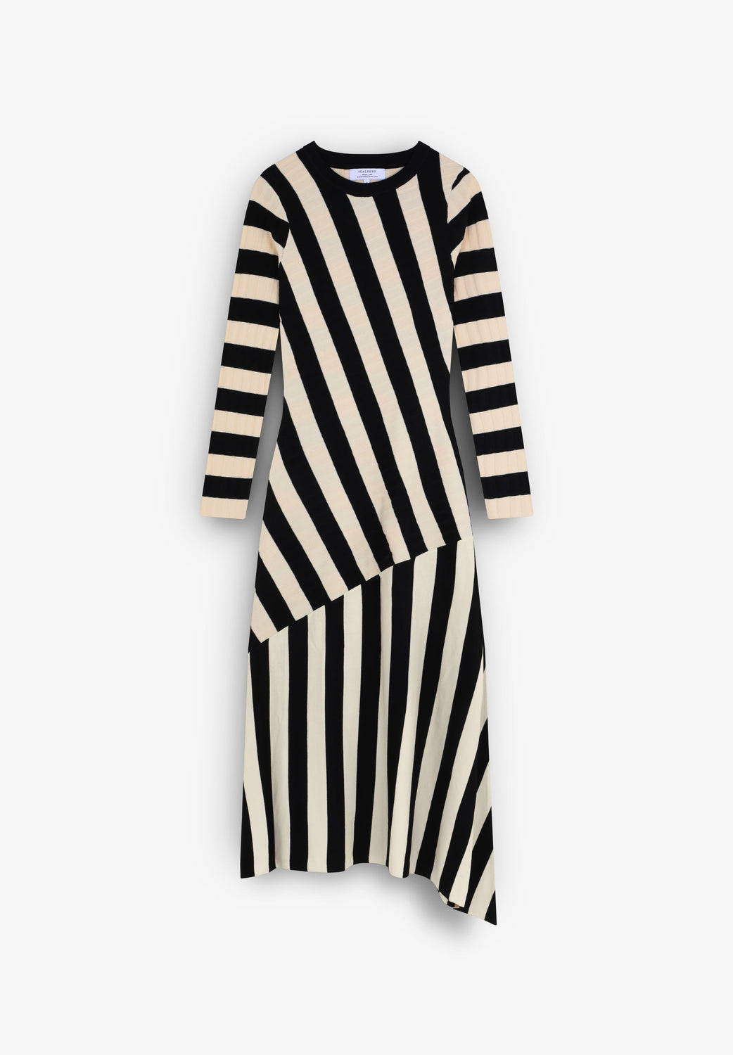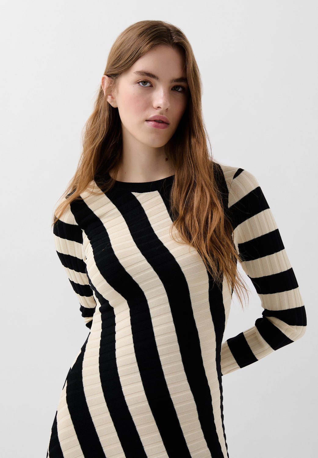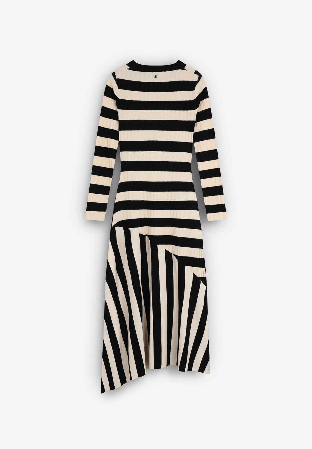 Vestido de rayas de punto. Slim Fit, cuello redondo y manga larga. Detalle de canalé en la parte superior y corte en la falda. Bajo asimétrico.