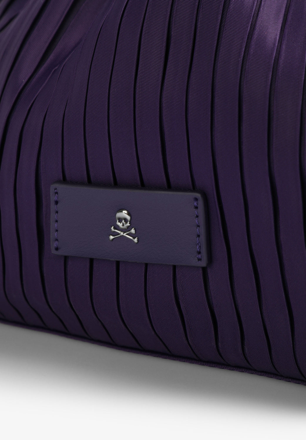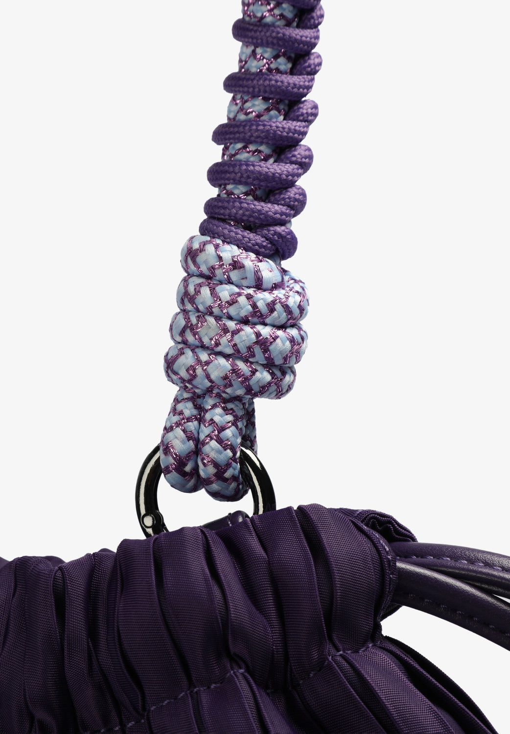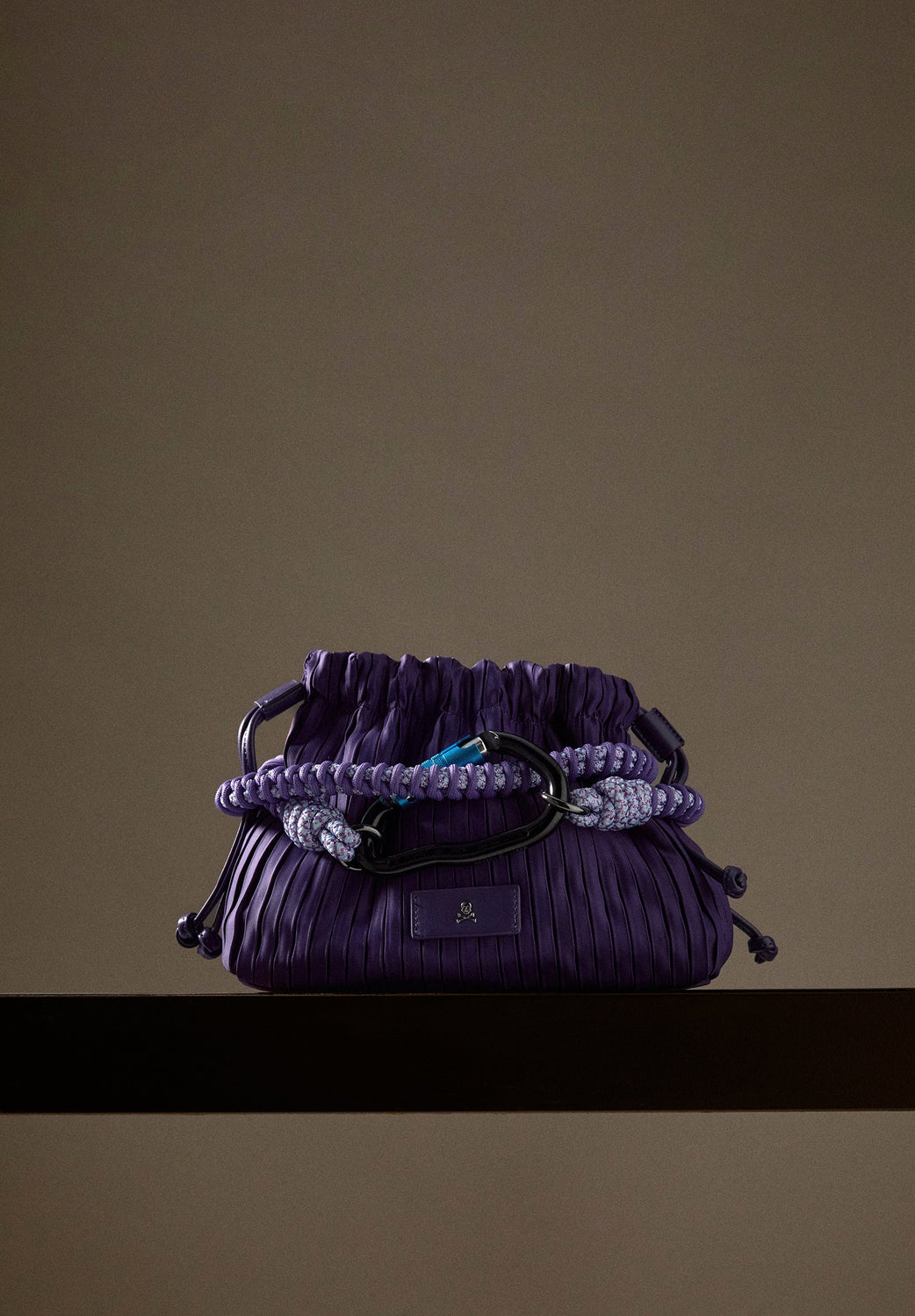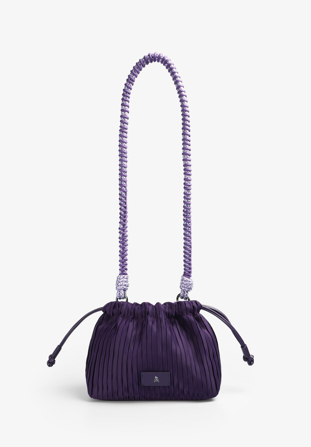 Bolso plisado confeccionado en tejido sintético con parche frontal con logo. Cierre con tiradores ajustables laterales. Forro interior y bolsillo con cremallera. Asa larga trenzada con detalles metalizados.