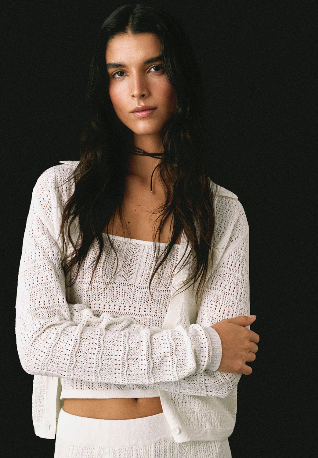 Cárdigan confeccionado en Lino. Cierre mediante botones en frontal. Cuello camisero. Manga larga.