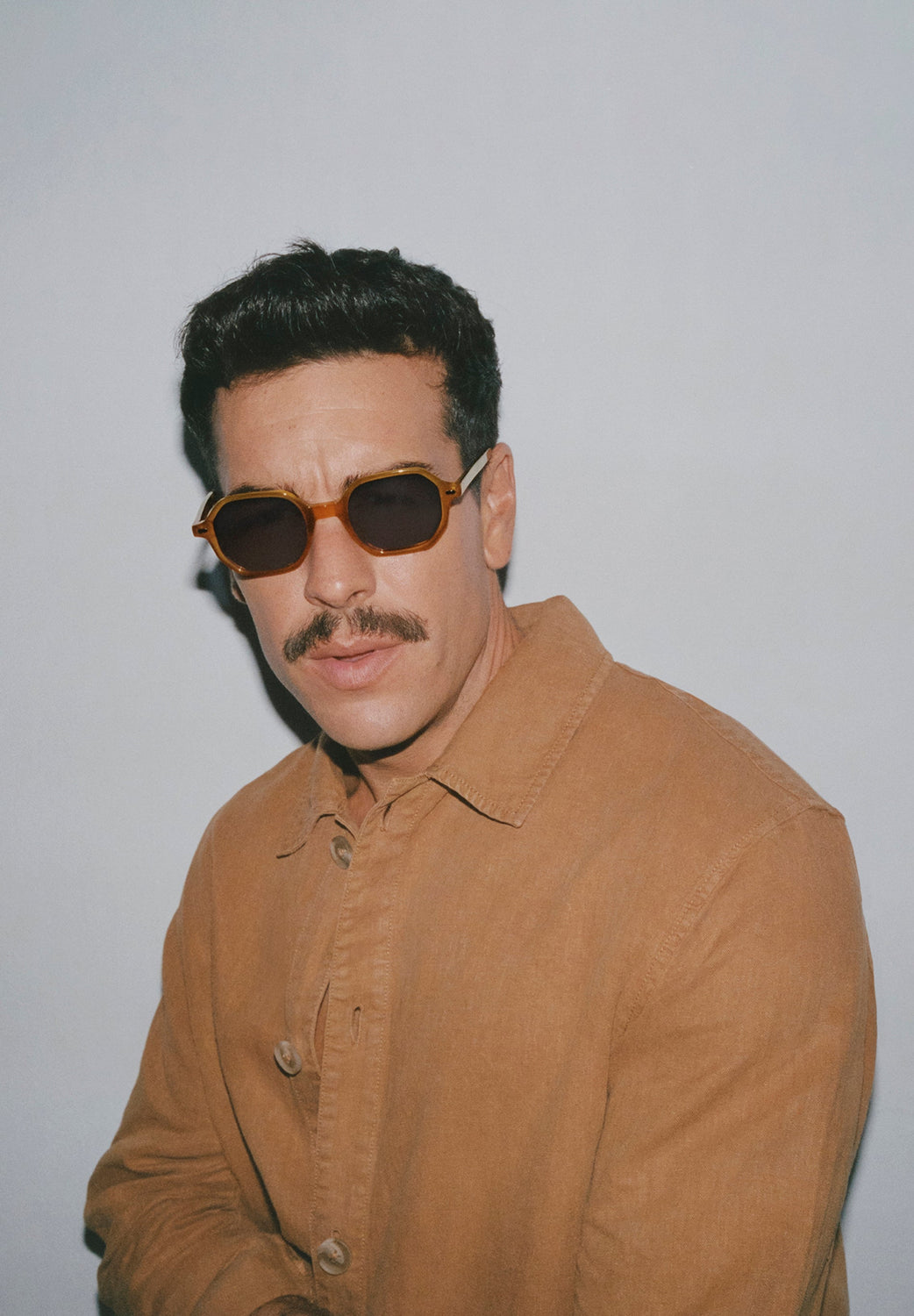Gafas de sol con montura cuadrada y puente de herradura. Fabricadas en acetatocolor mostaza en el frontal y pattern gris en la varilla. Lentes polarizadas. Destacan logotipo metálico en varilla.