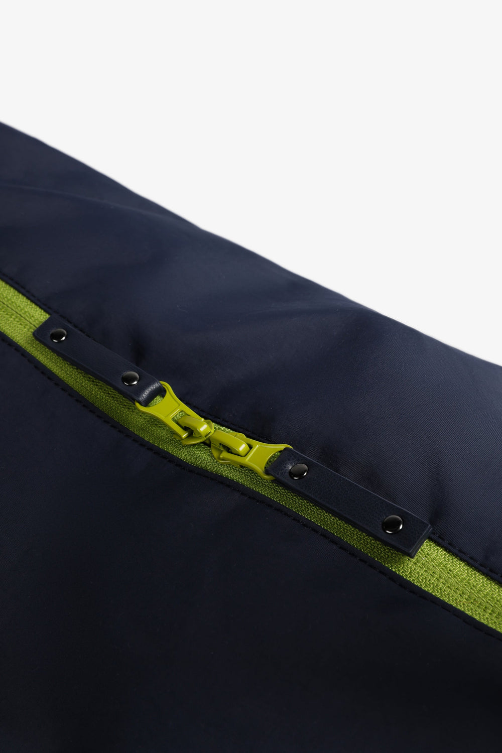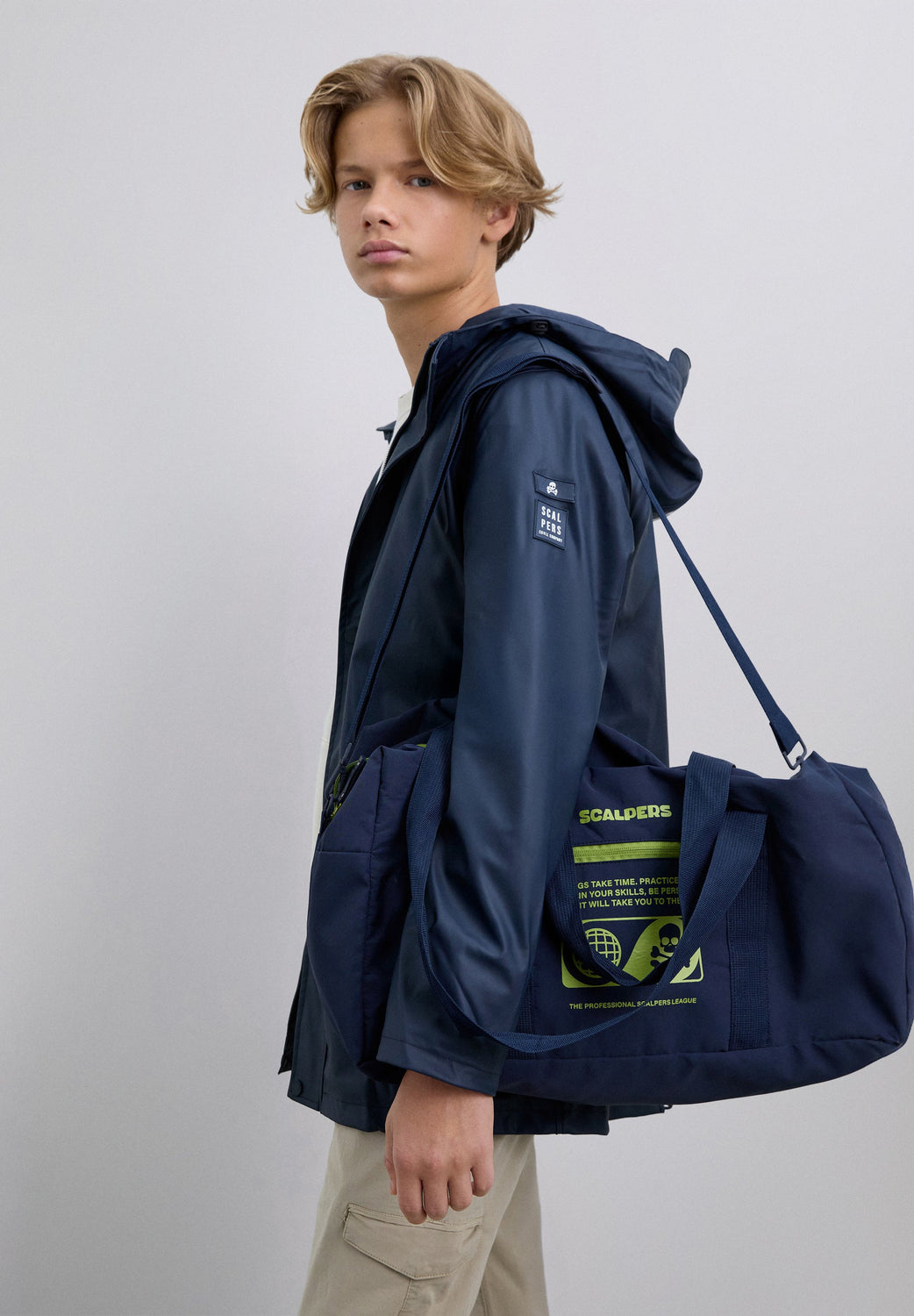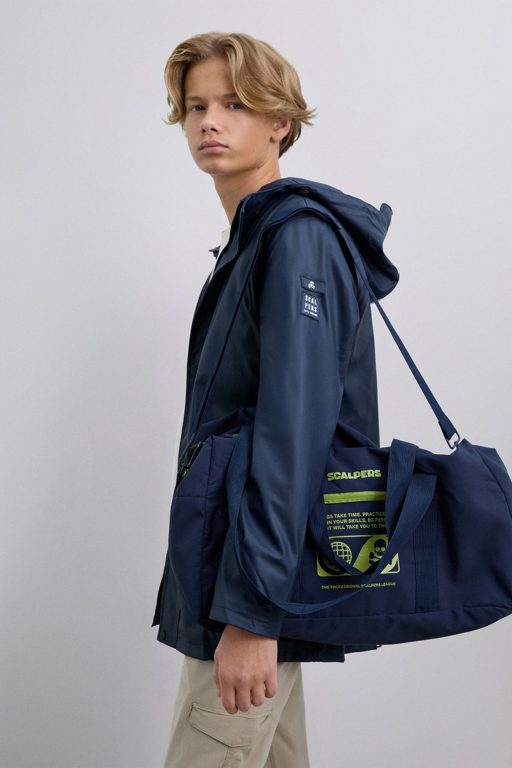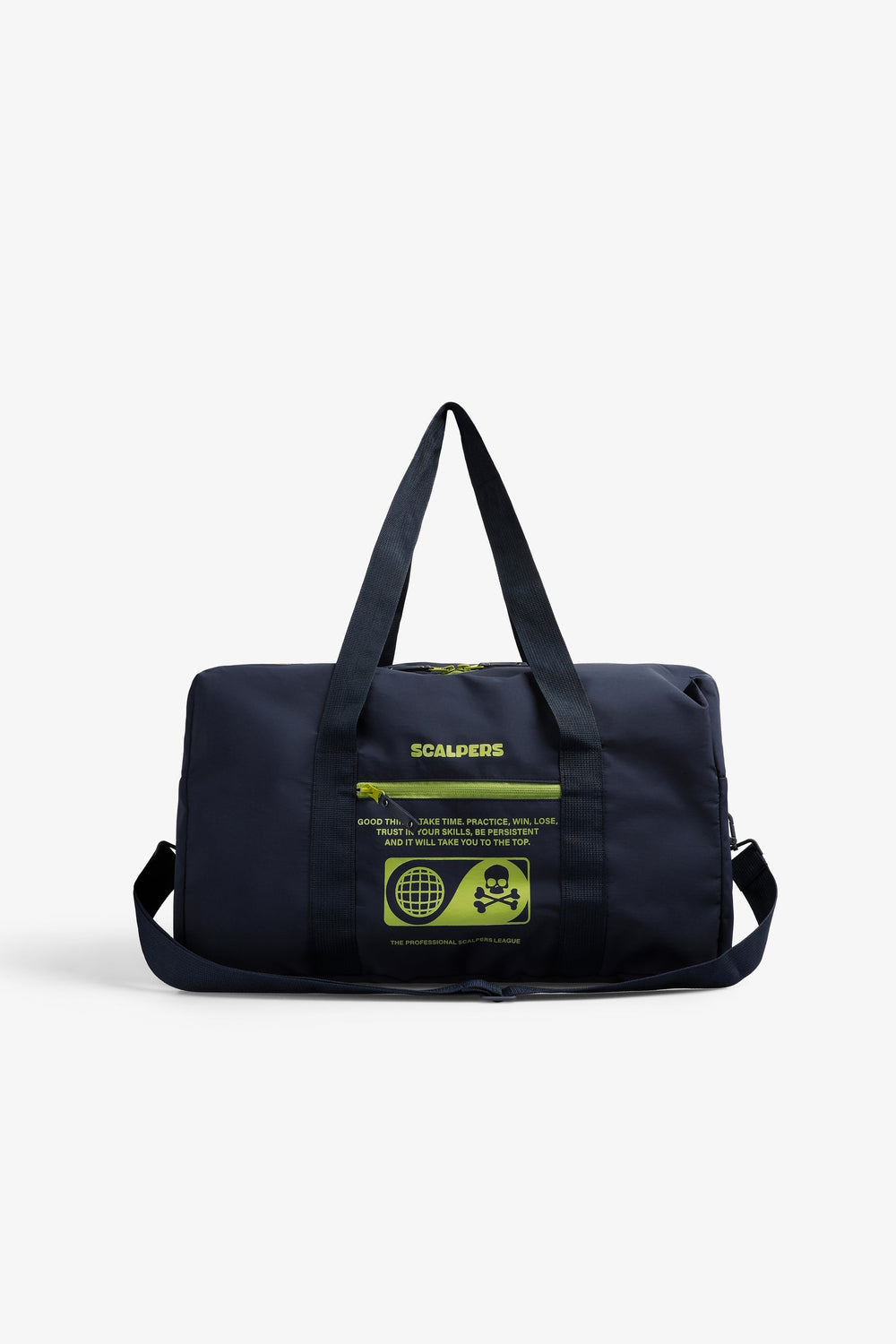 Bolsa confeccionada en tejido técnico. Compartimento principal y lateral con cierre por cremallera. Cierre con cremallera, asas cortas y asa larga desmontable. Print frontal con logo y calavera.