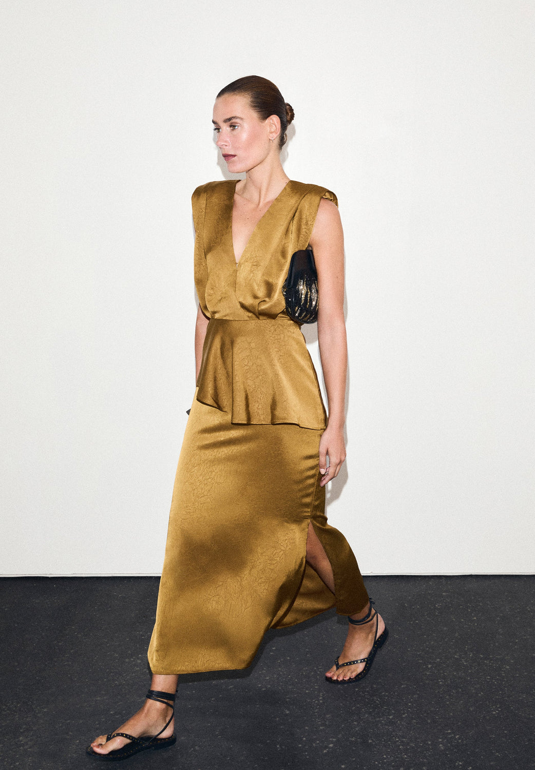 Falda midi confeccionada en tejido fluido con textura. Cierre con cremallera oculta lateral y abertura en pierna.