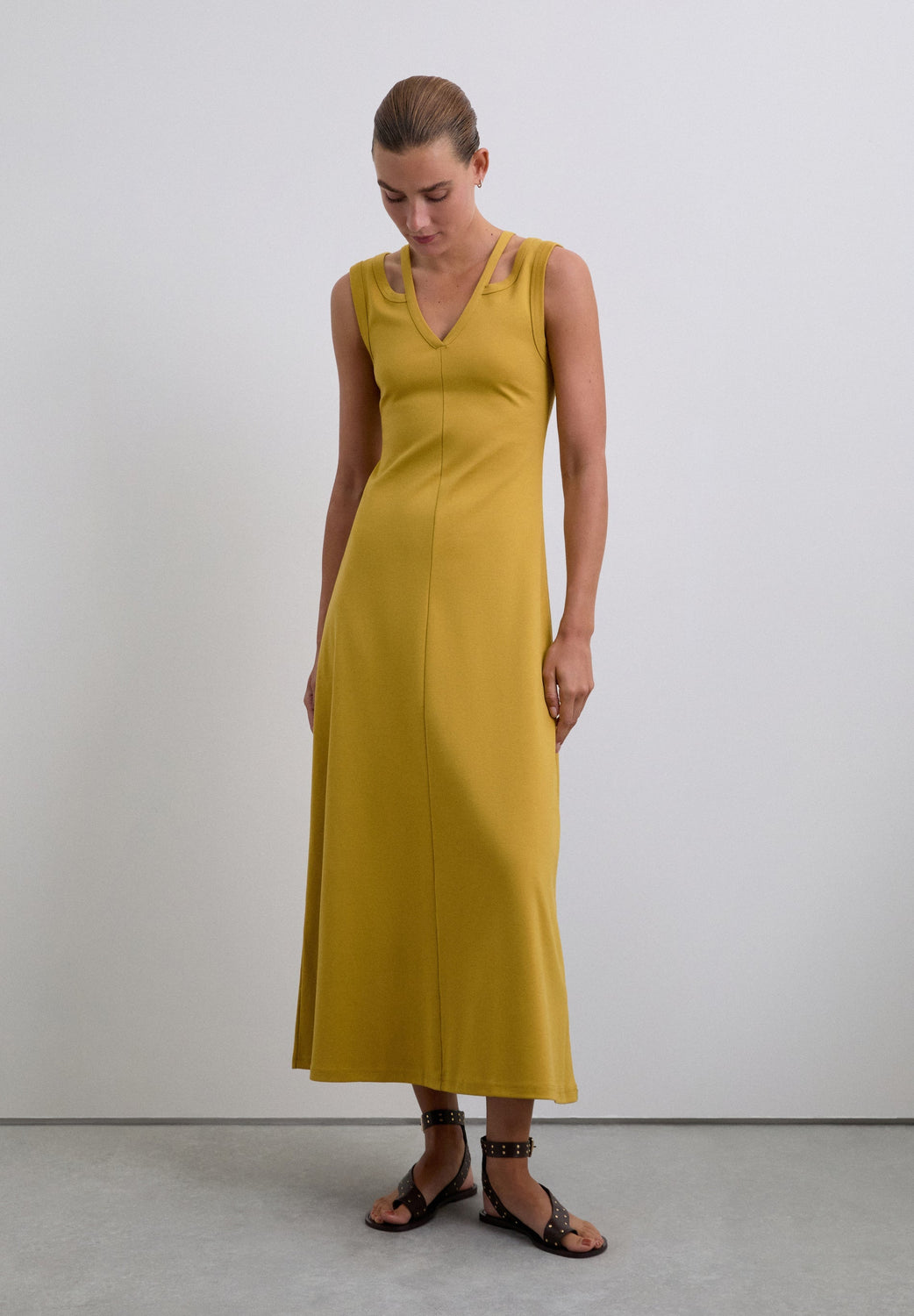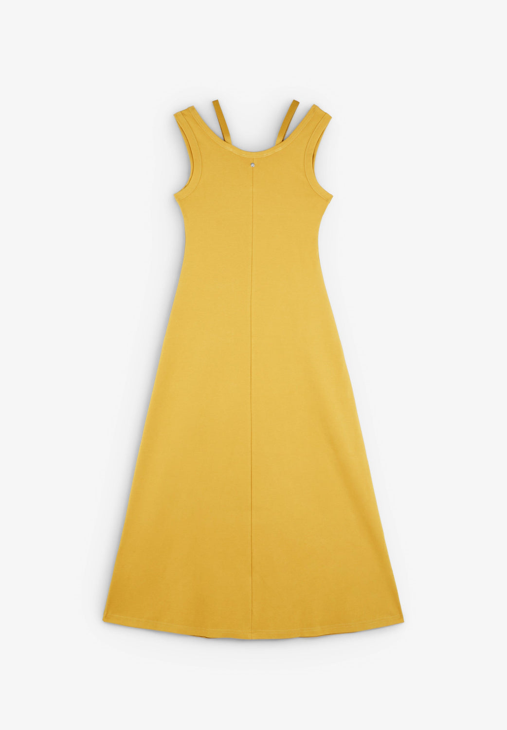 Vestido midi confeccionado en 100% Algodón Orgánico BCI. Manga en sisa. escote en V con detalles de cut outs y doble tirantes.