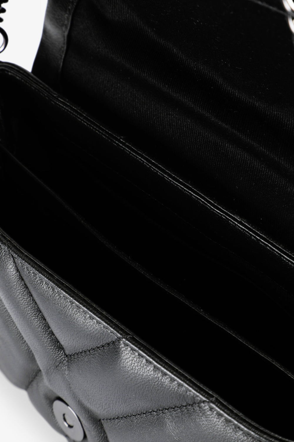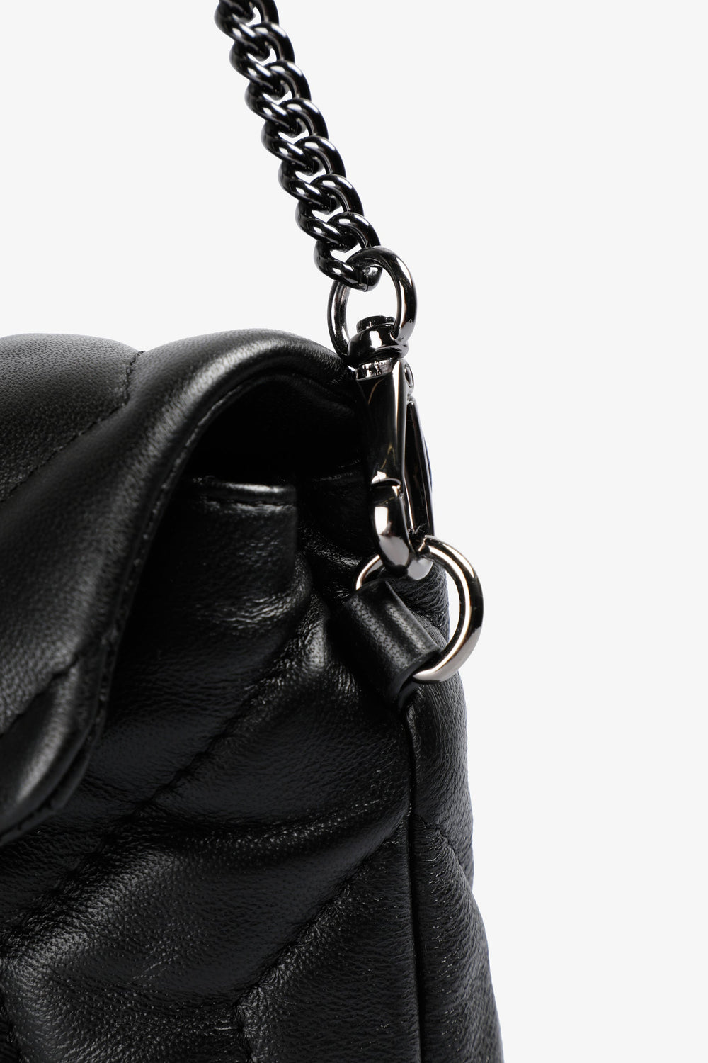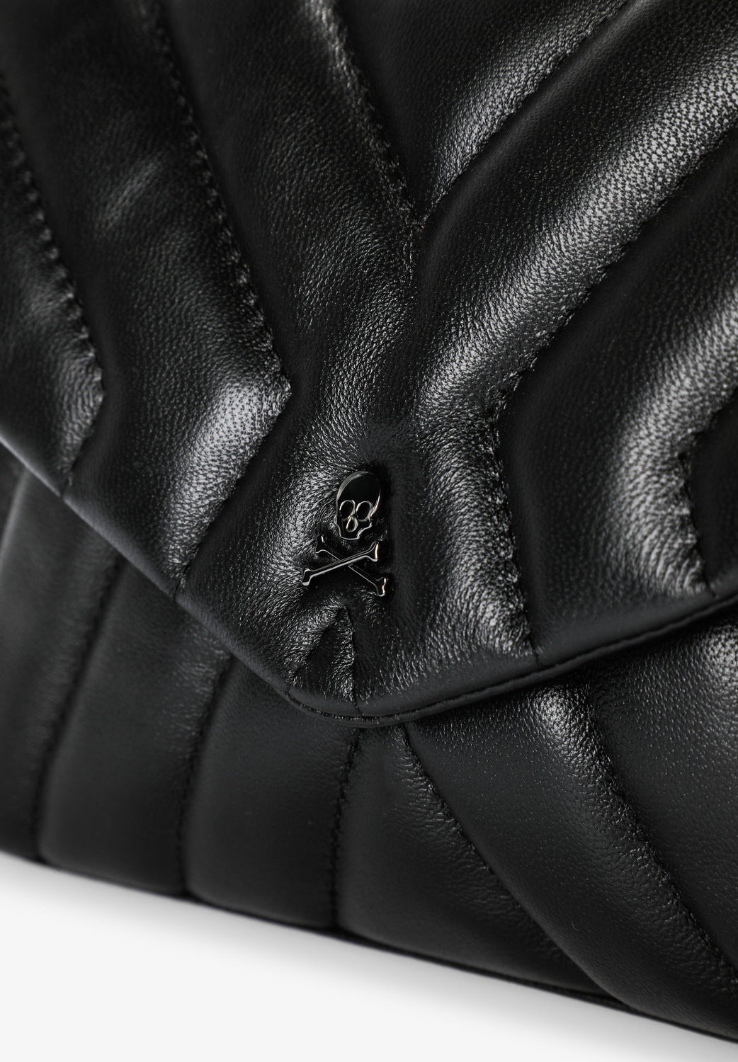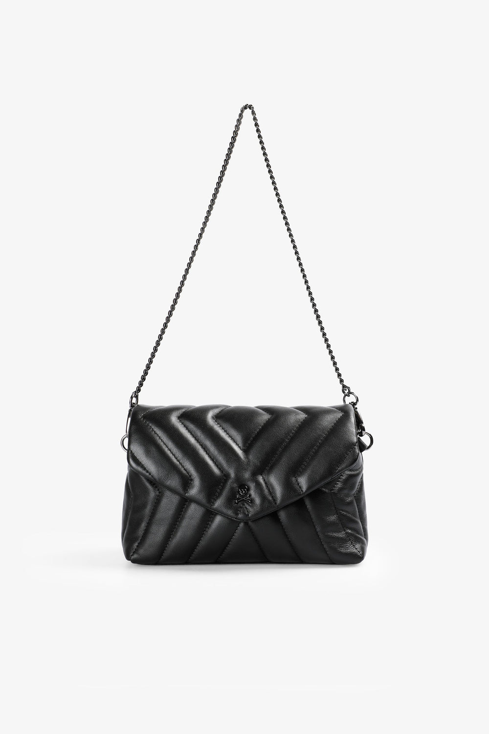 Bolso mini confeccionado en 100% piel acolchado. Cierre con tapeta e imán, asa de cadena o regulable de piel y compartimentos interiores. Calavera metálica frontal.