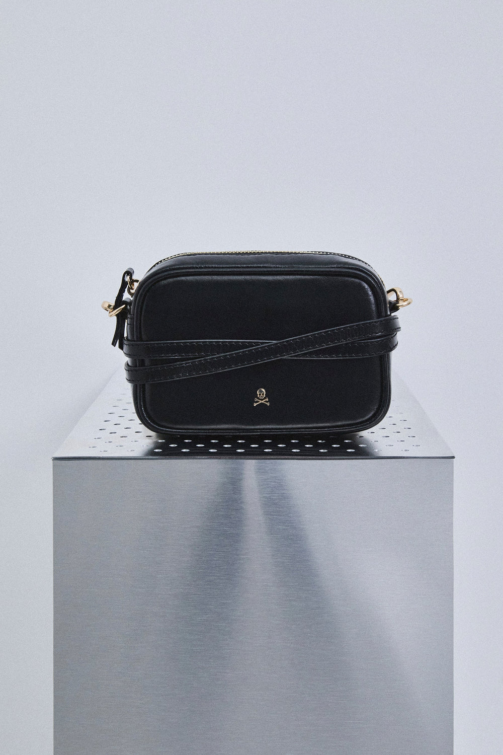 Bolso tamaño pequeño. Confeccionado en 100% piel. Cierre con cremallera. Asa larga. Detalles de calavera en la parte frontal