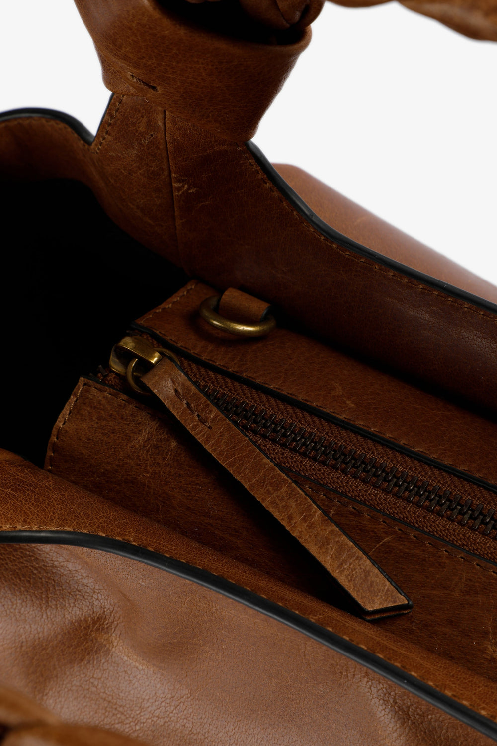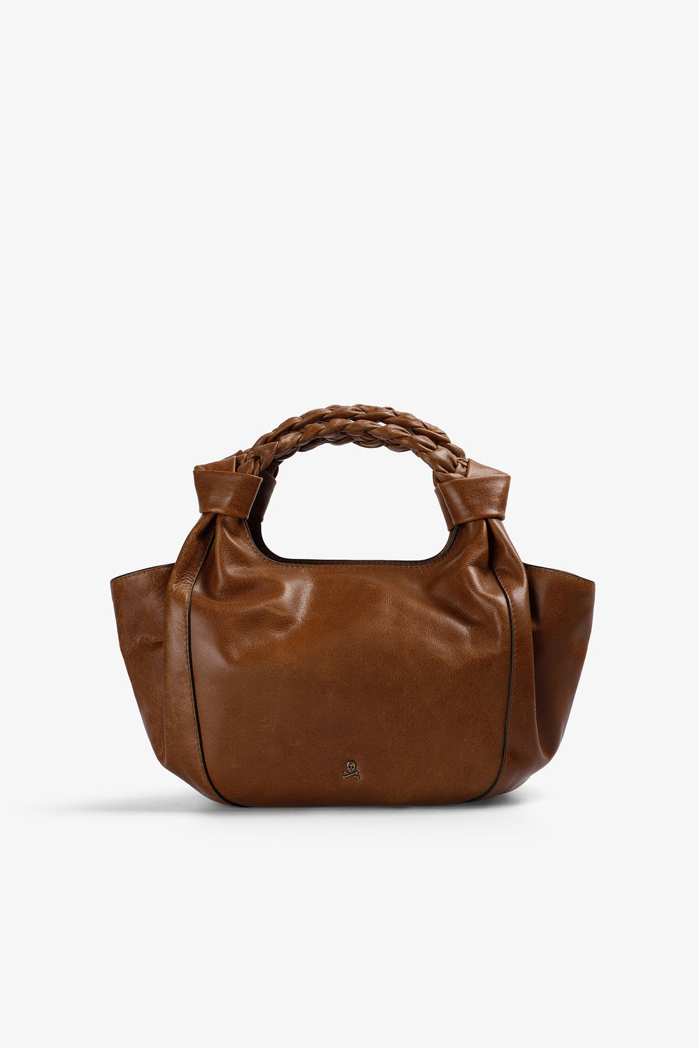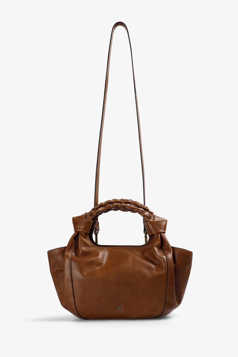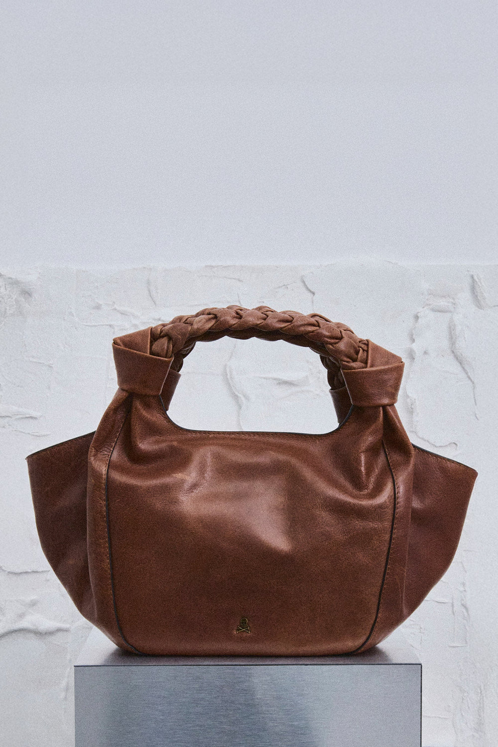 Bolso de mano confeccionado en 100% piel con detalle de asa trenzada con nudos. Forro interior. bolsillo interior y cierre con cremallera. Logo en frontal metálico. Opción doble asa.