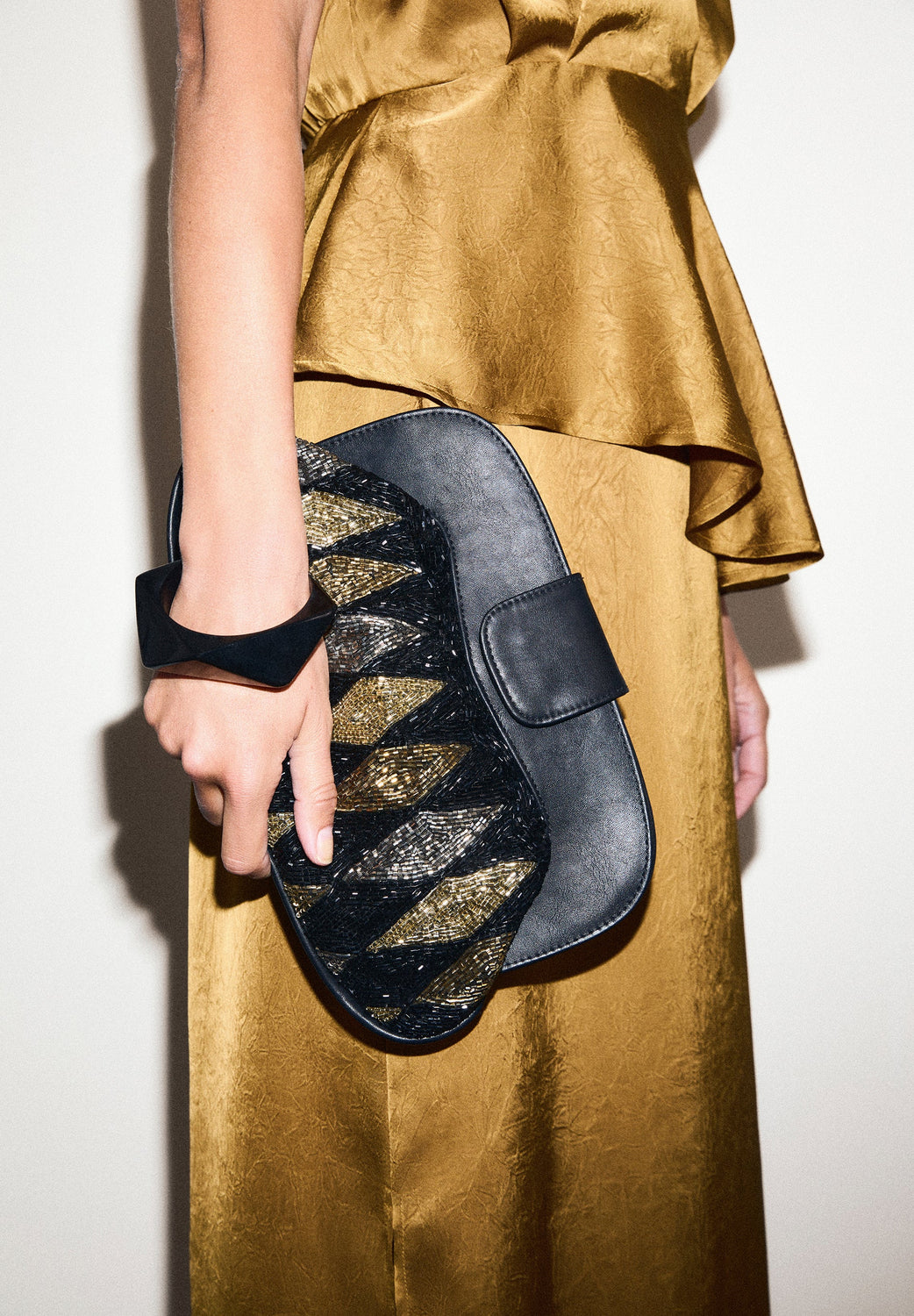 Bolso de mano confeccionado en algodón. Detalle de cuentas. Correa metálica extraíble en posición de bandolera. Cierre imantado. Detalle de logo bordado en el interior.