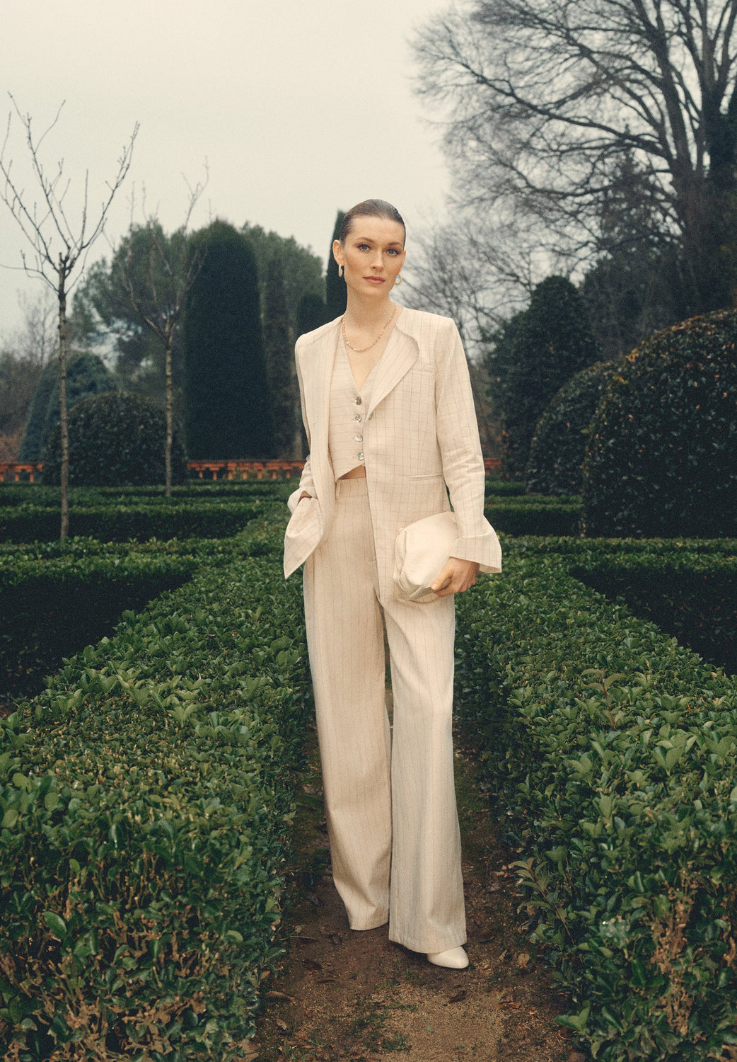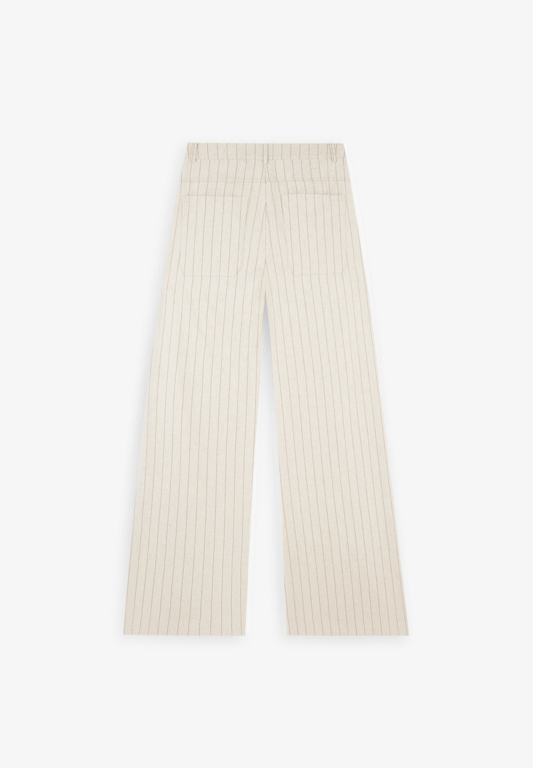 Pantalón de pinzas con rayas confeccionado en mezcla de algodón y lino. Corte Regular Fit, Full Length y cierre con cremallera y botón con cinturilla prolongada en cierre. Bolsillos inclinados y bolsillos de parche traseros.