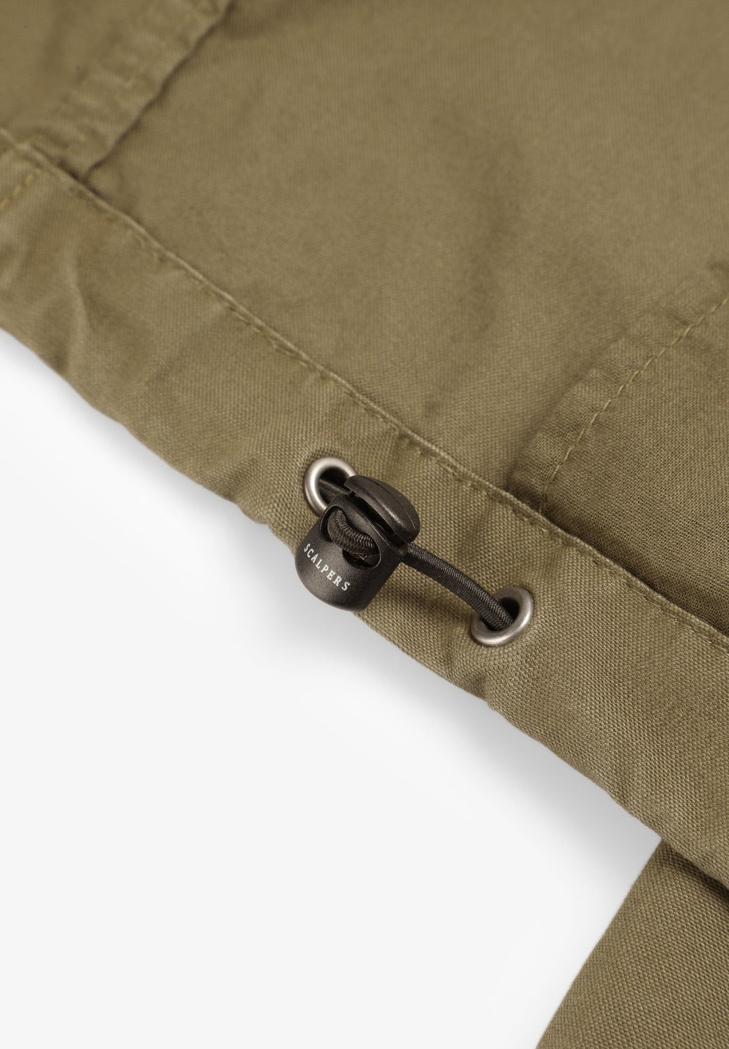 Chaqueta estilo militar confeccionada en 100% algodón BCI. Corte regular fit, cuello con capucha desmontable con cremallera. Cierre con cremallera de doble carro y snaps. Manga larga terminada en puños con cierre de snap y fuelles en la parte trasera.