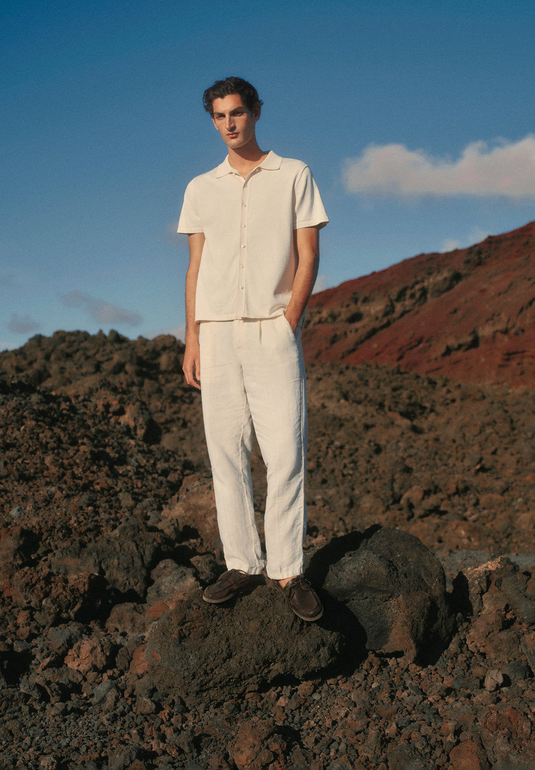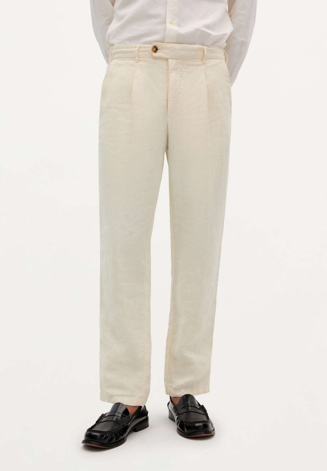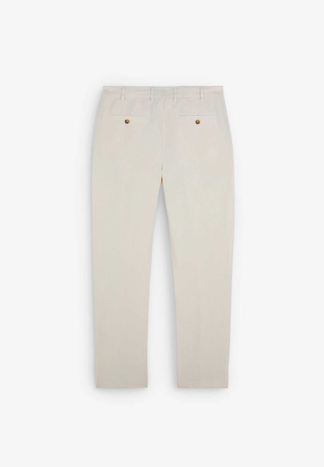Pantalón confeccionado en tejido 100% lino. Corte Regular Fit con pinzas, cierre con botón y cremallera y bolsillos laterales. Detalles de trabillas.