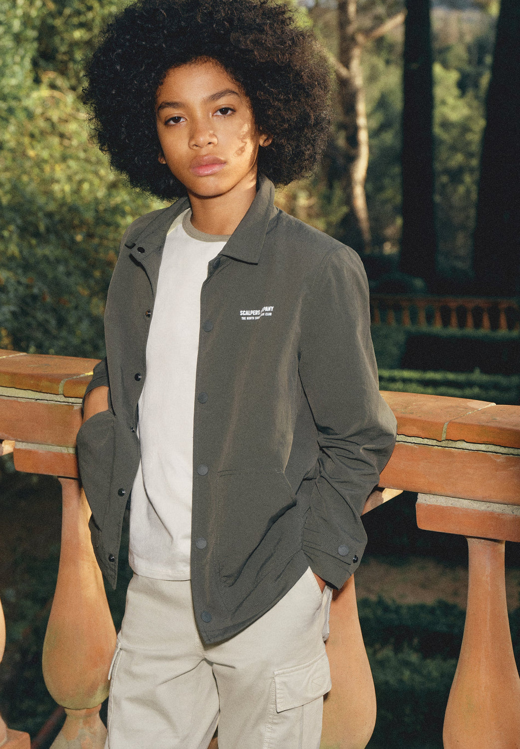 Chaqueta técnica ligera. Confeccionada en tejido técnico. Cuello camisero. Regular Fit. Cierre con botones, forro interior ligero y terminación en puño con botones de snaps. Print frontal en pecho y trasero. Bolsillos canguro con cierre imantado.
