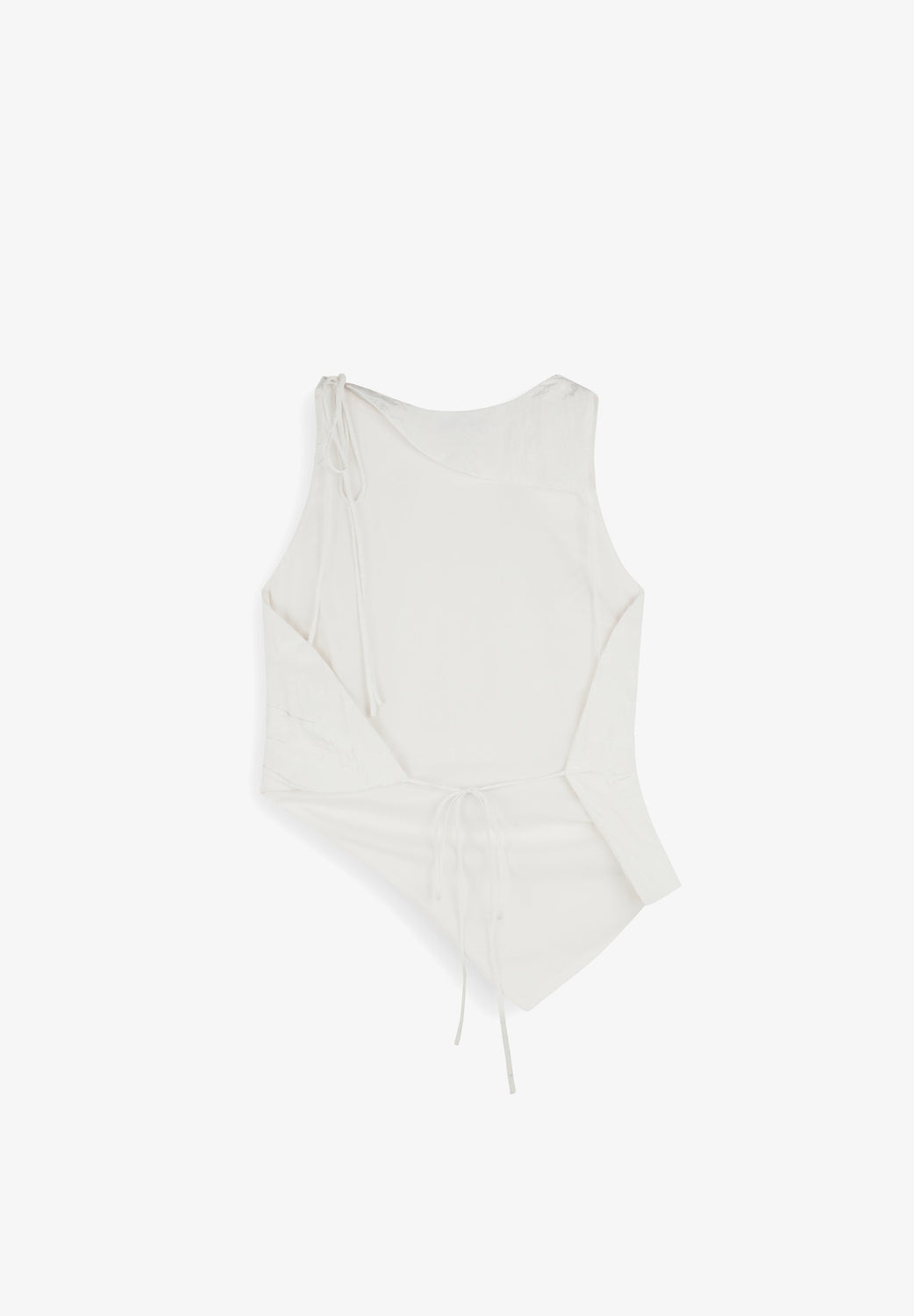 Top de cuello redondo y manga sisa con espalda descubierta. Cintura entallada. Bajo acabado asimétrico. Cierre trasero ajustable con lazos en hombro y cintura.