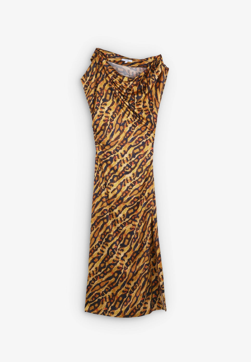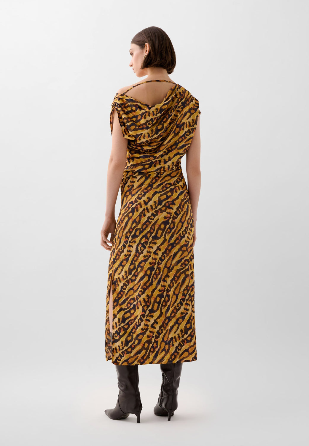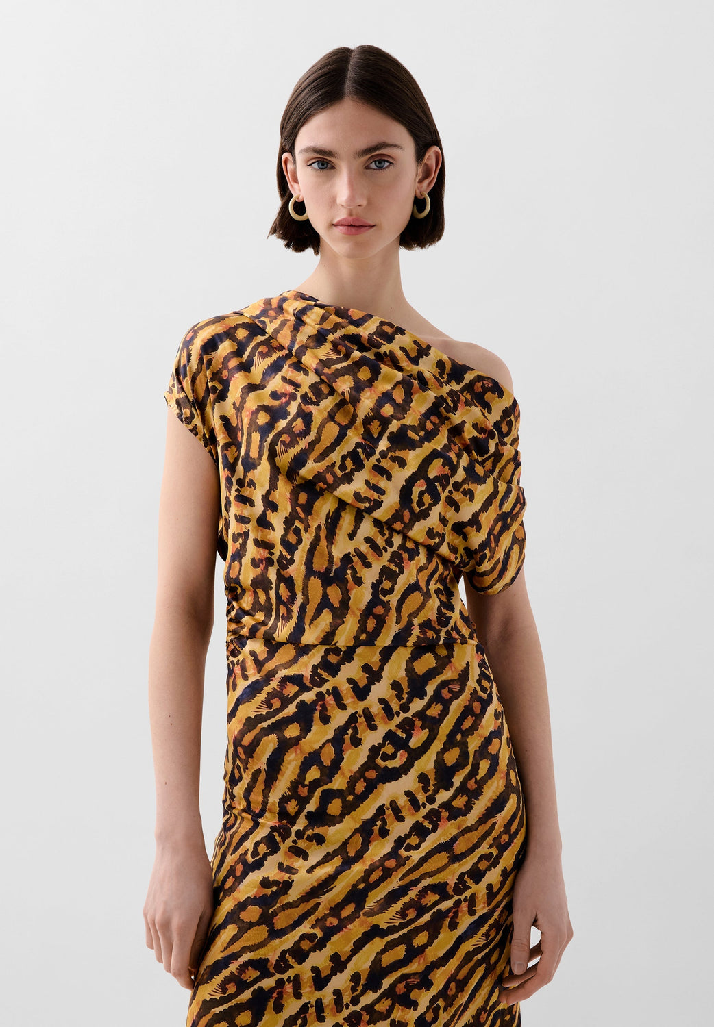 Vestido de corte midi. Escote asimétrico. Manga corta. Cierre mediante cremallera en la parte lateral. Un hombro descubierto. Tejido fluido de acabado satinado. Slim fit