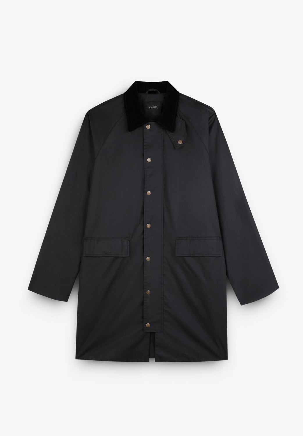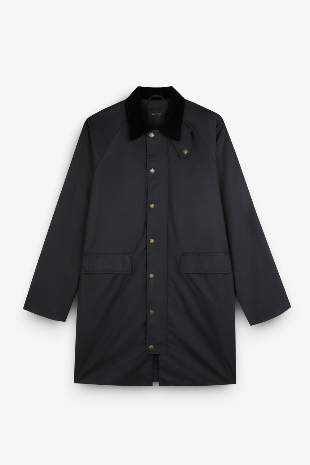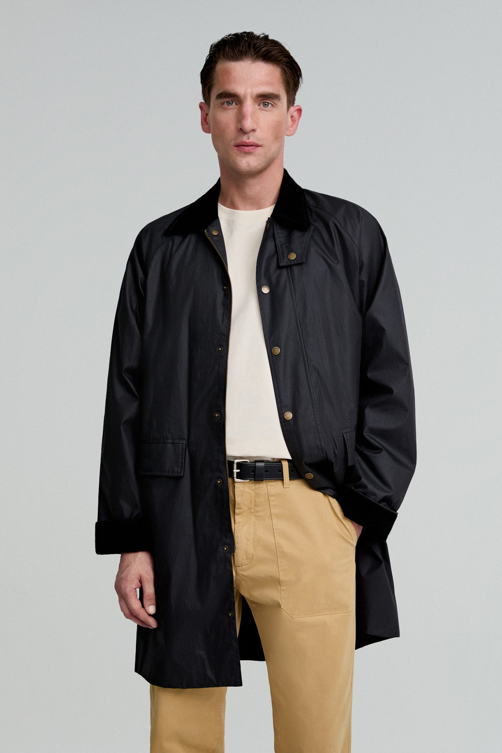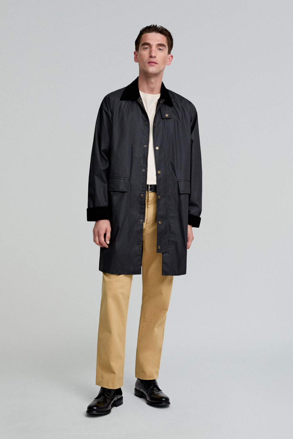 Parka encerada confeccionada en tejido técnico water resistant. Regular fit, cuello de pana y cierre con cremallera y botones de snaps. Manga larga y abertura trasera con snaps. Bolsillos con tapeta y bolsillo interior con cremallera. Detalle de cierre en el cuello con snaps.