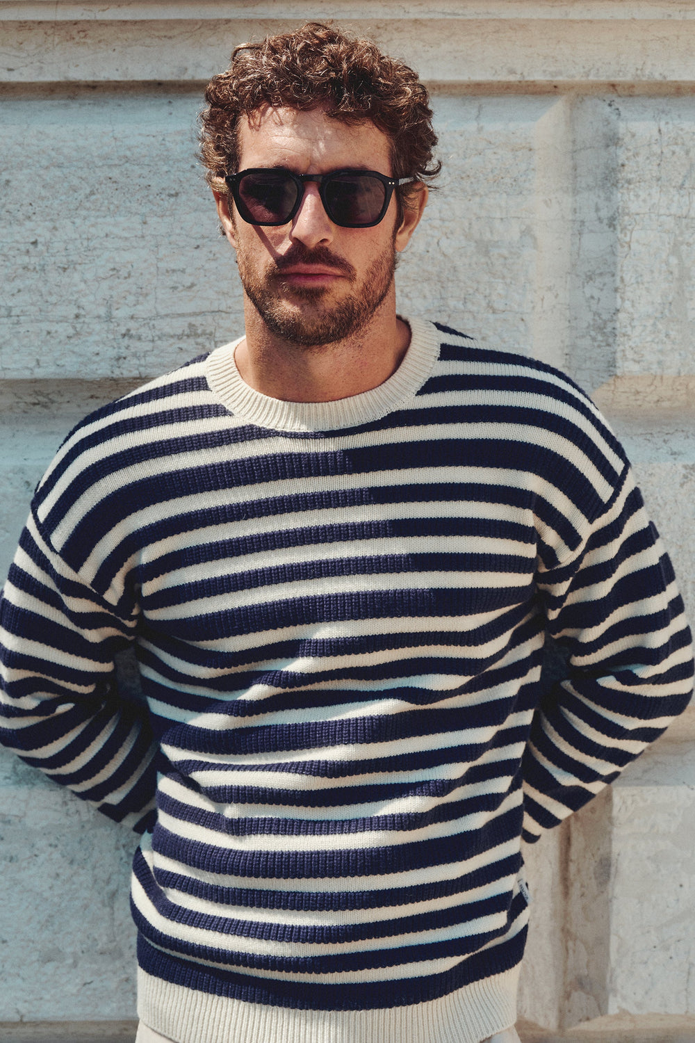 Jersey rayas confeccionado en algodón y lana. Regular fit, cuello redondo y manga larga.