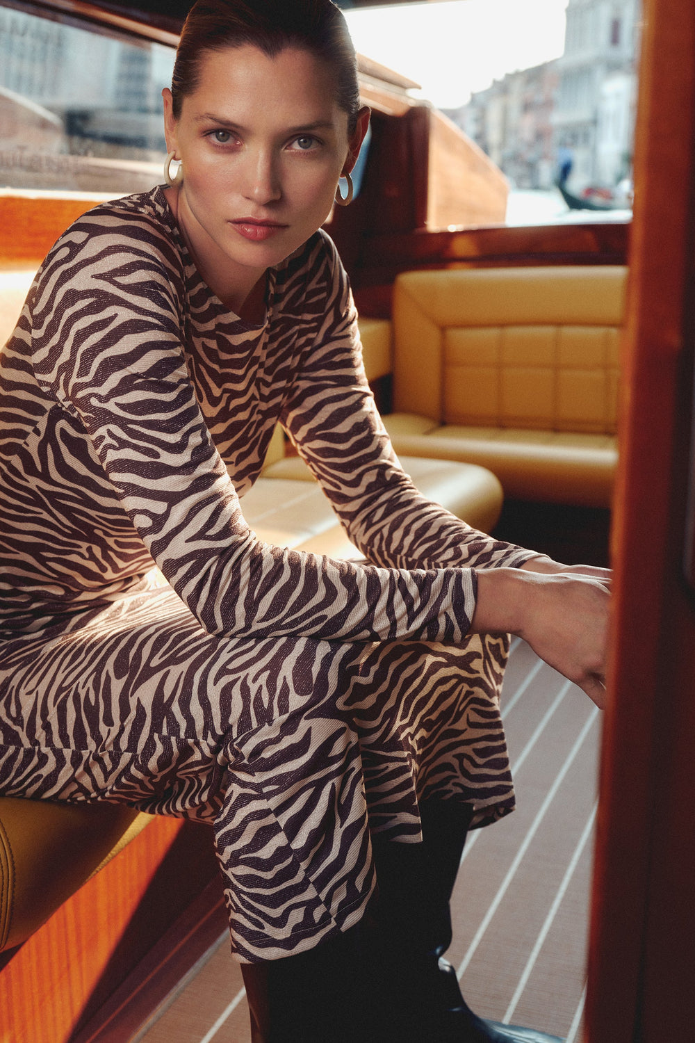 Vestido midi con print de cebra. Slim fit, cuello redondo y manga larga.