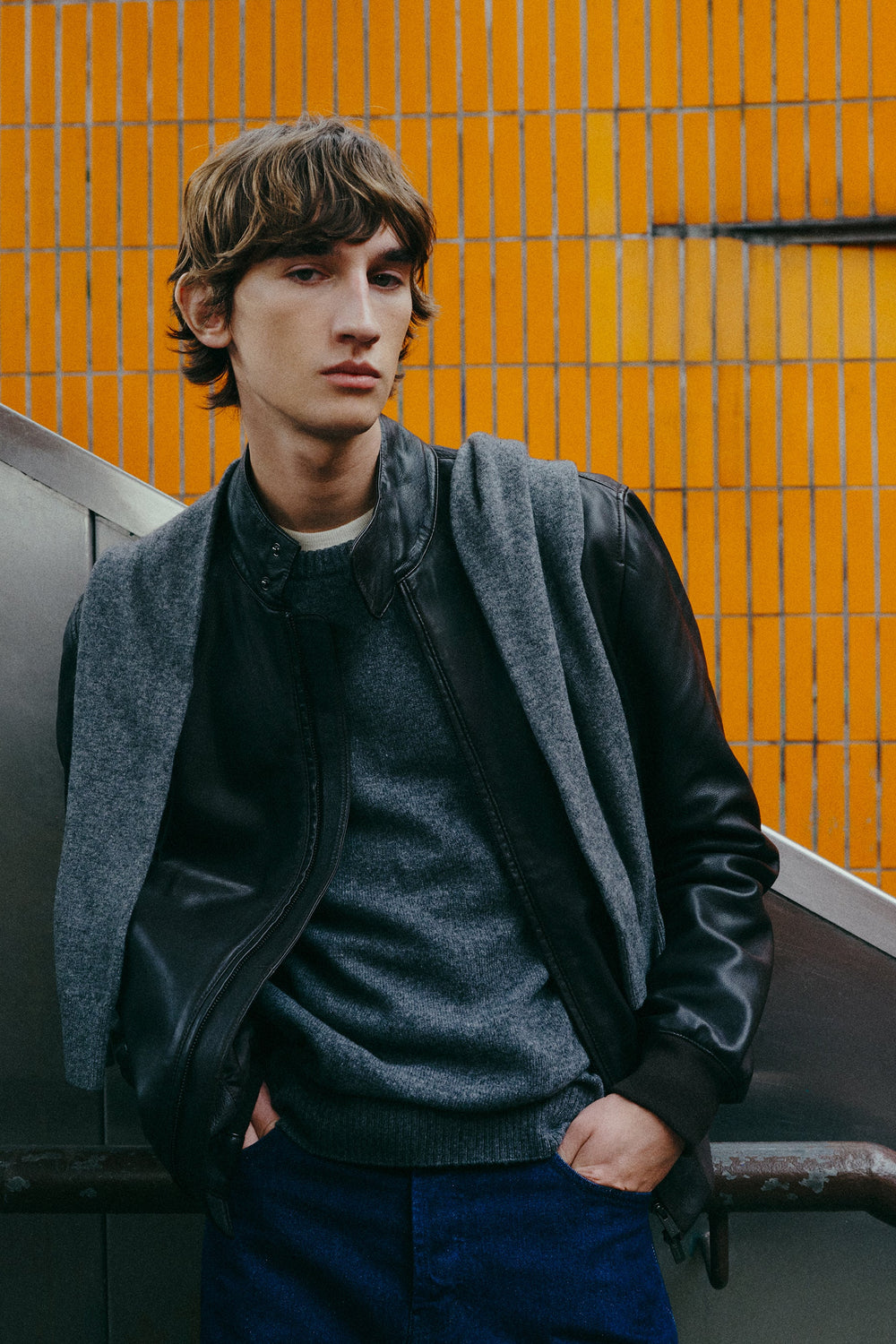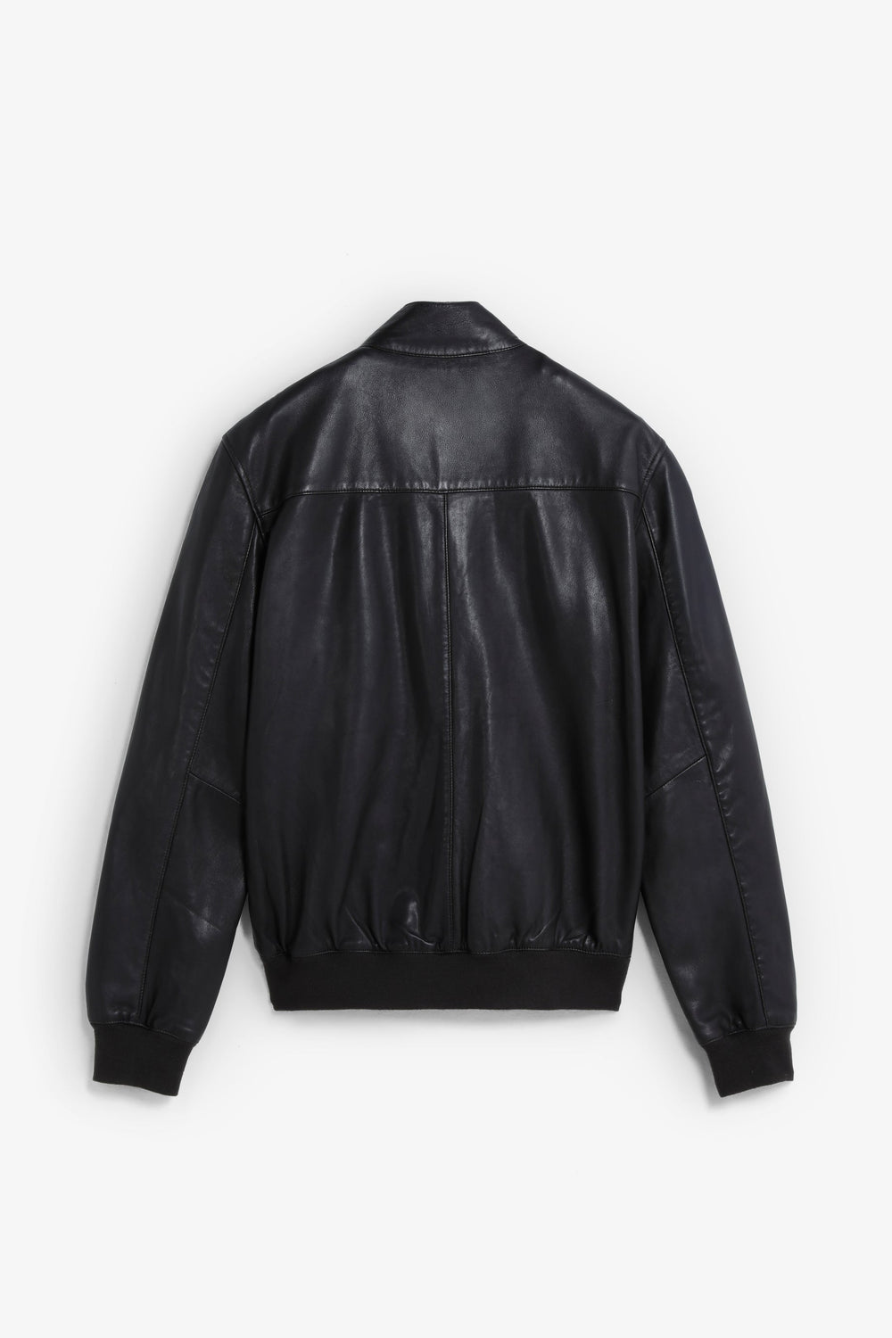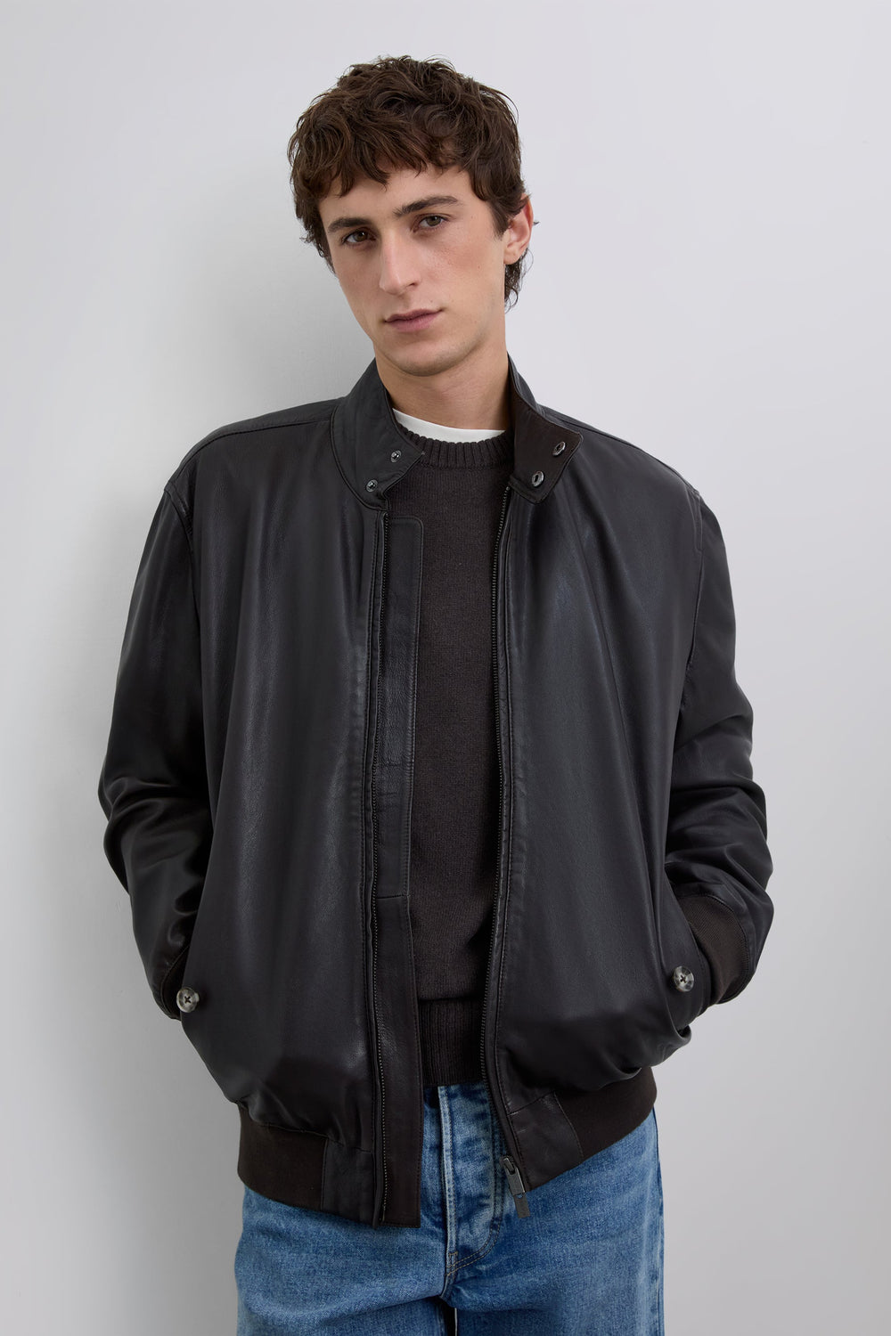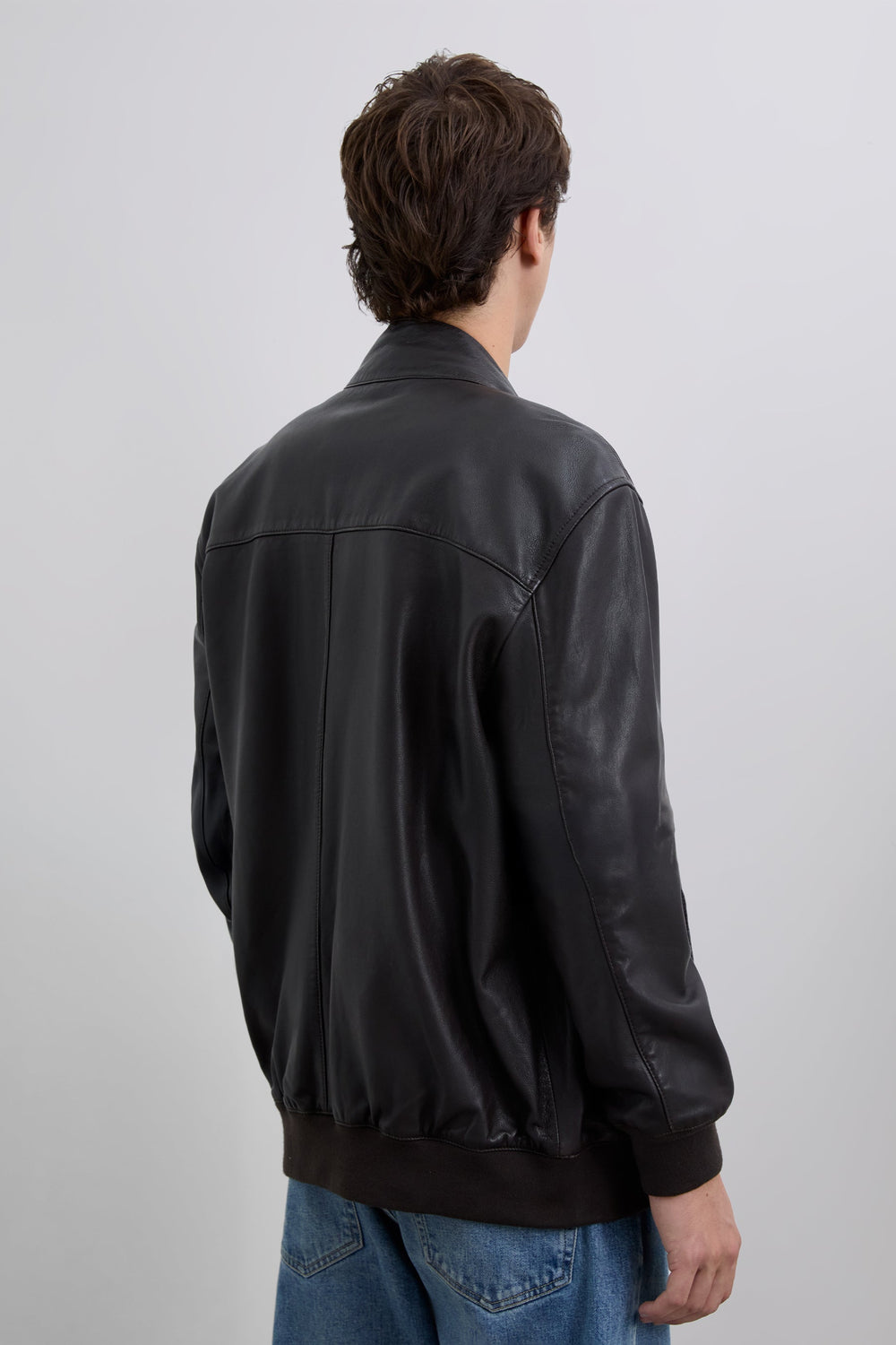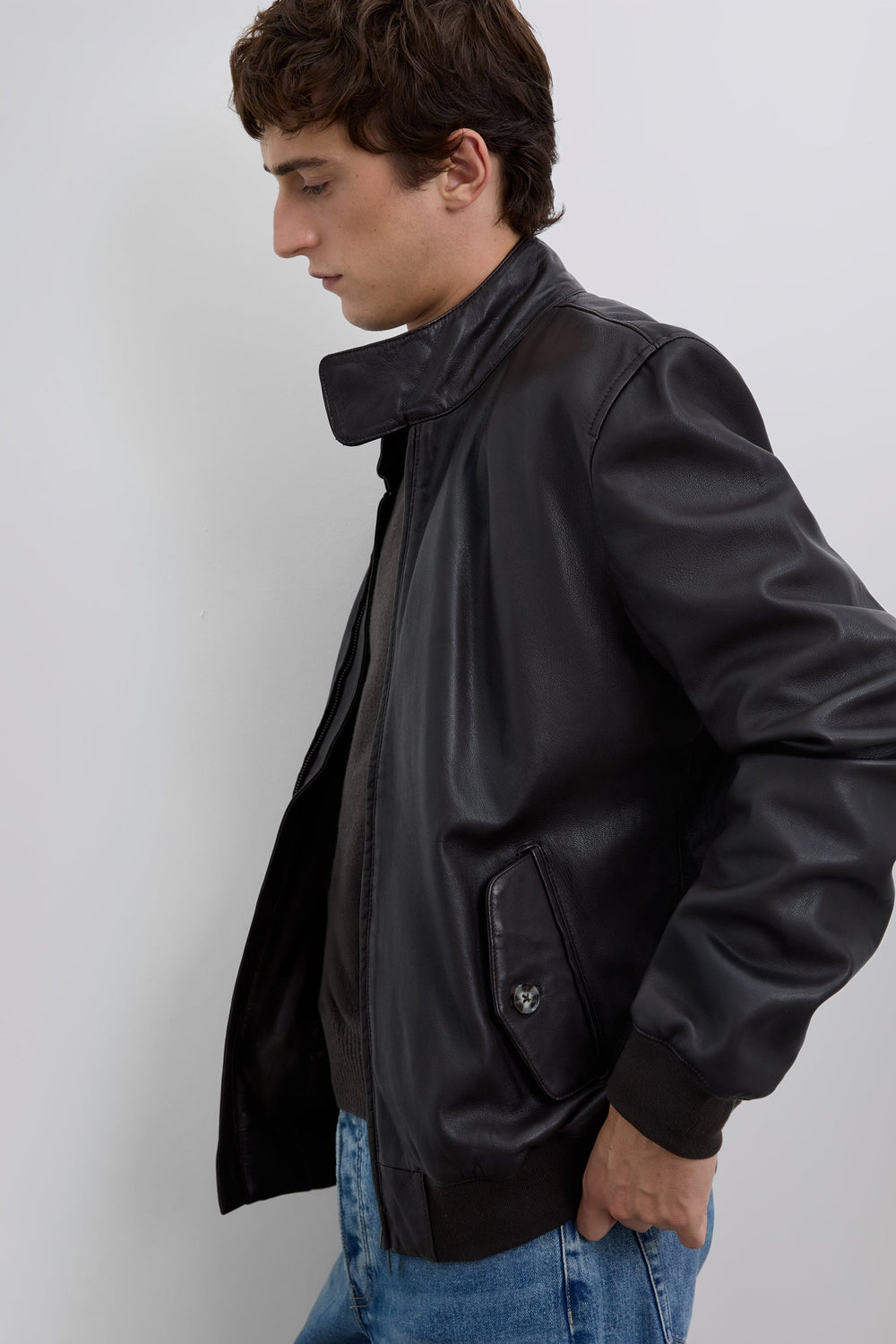 Chaqueta confeccionada en 100% piel. Manga larga. Cierre frontal con cremallera de doble carro. Cuello elevado con cierre de doble broche. Dos bolsillos frontales con solapa y botón. Puños y dobladillo acanalados.