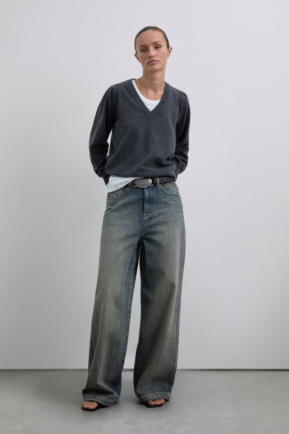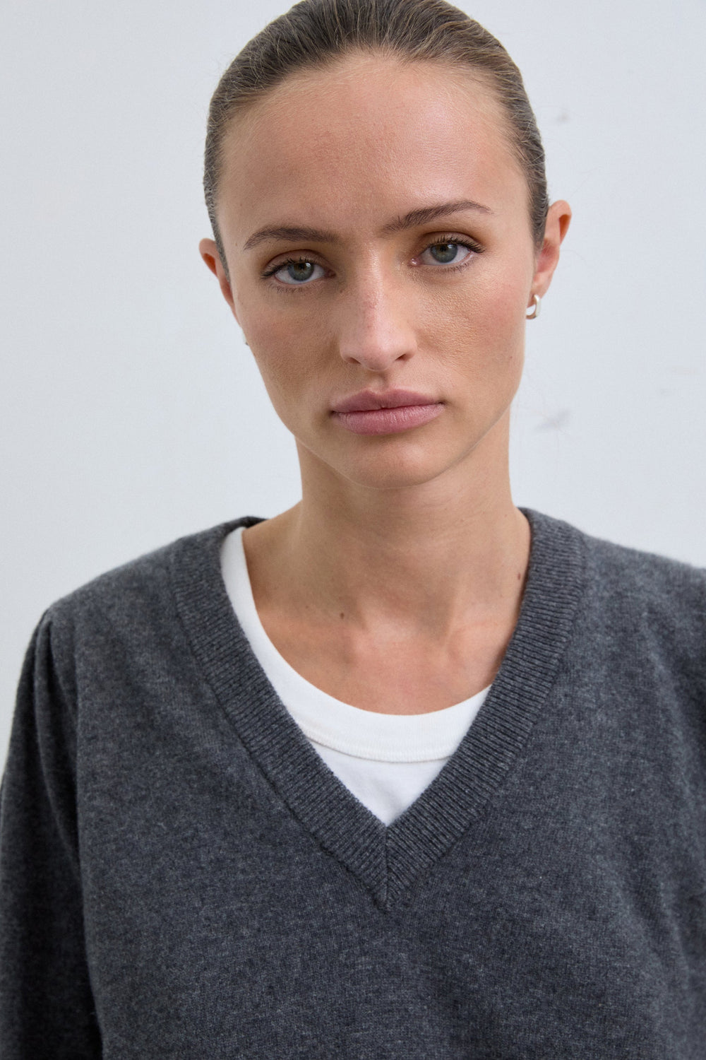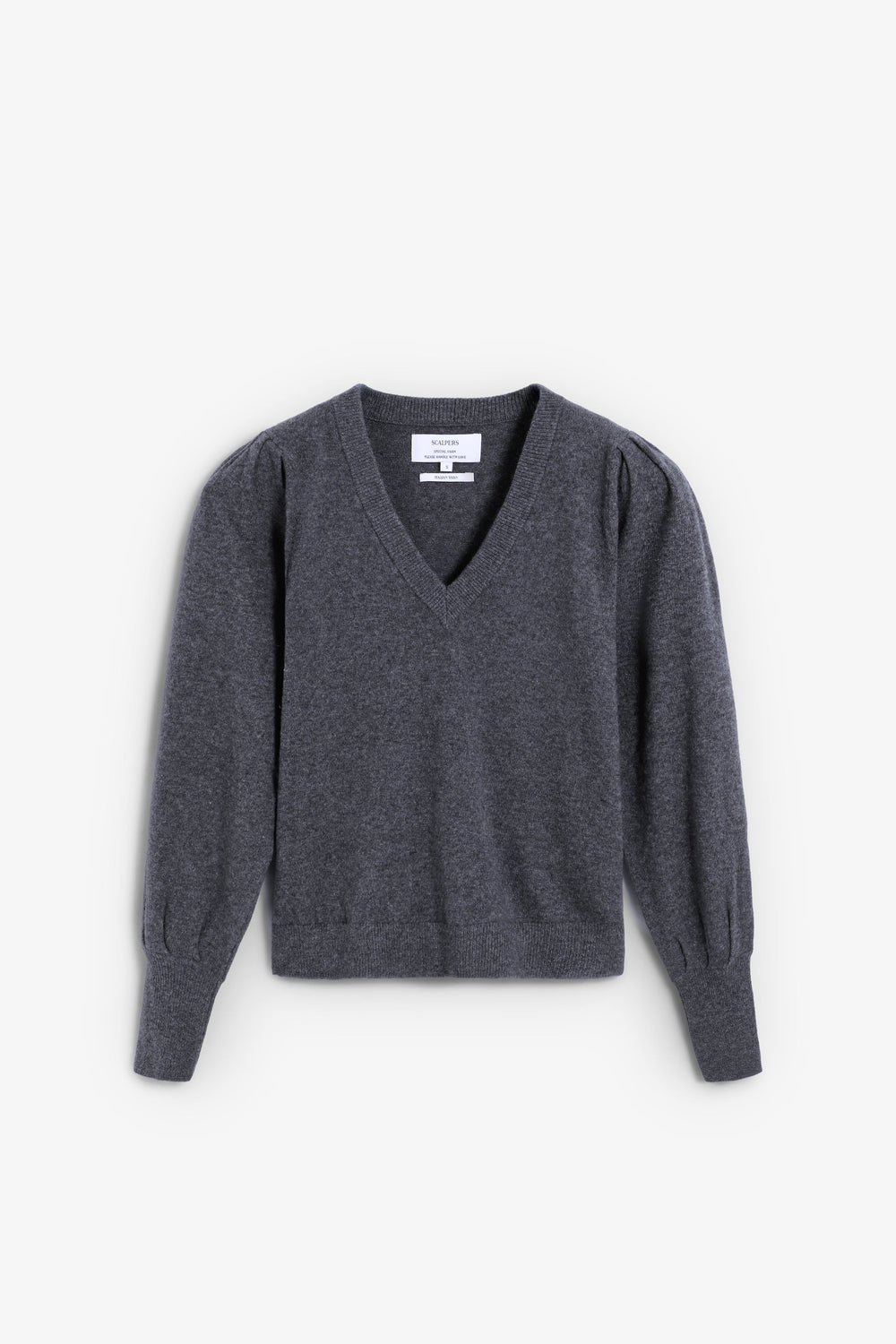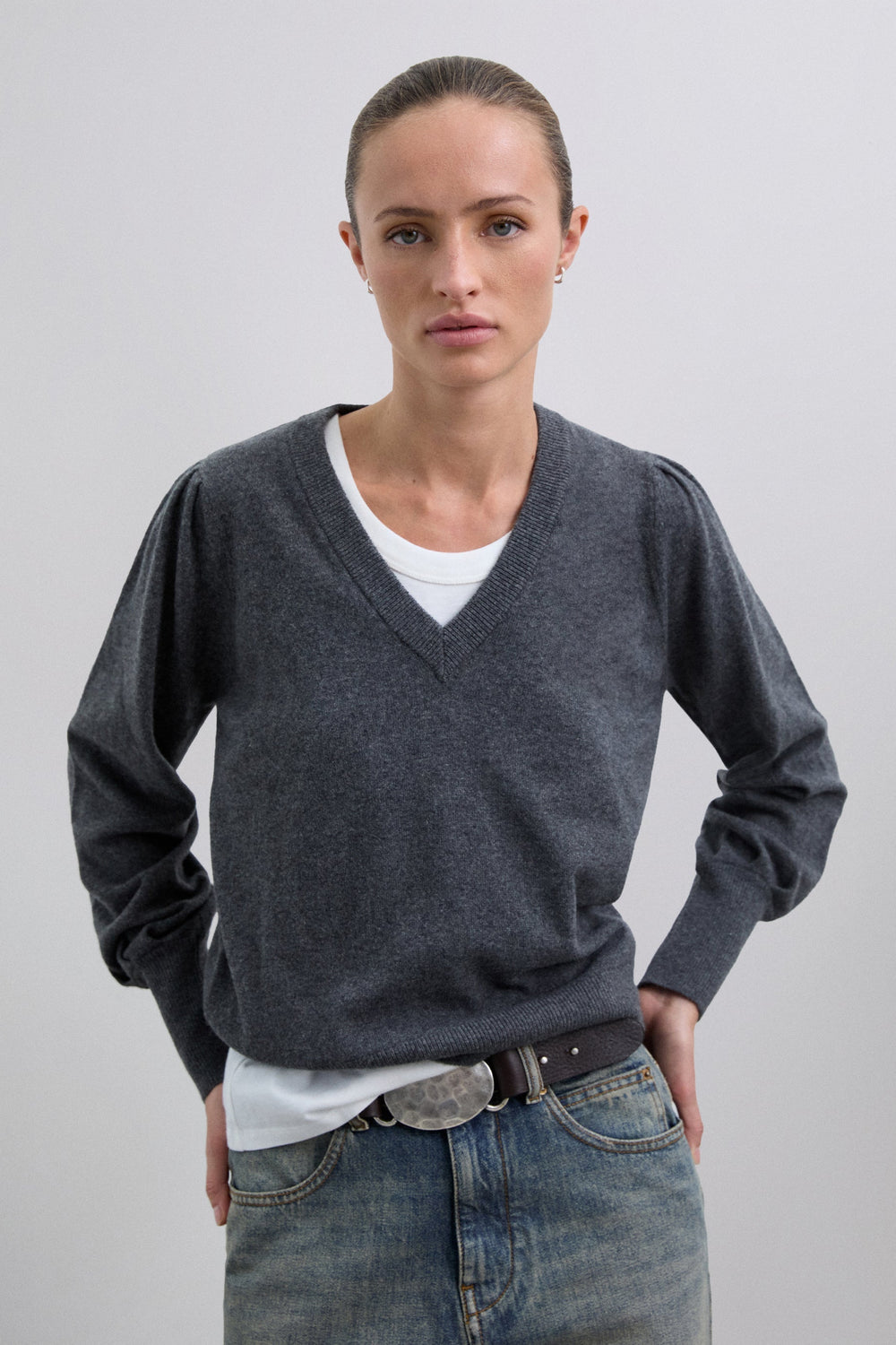 Jersey confeccionado en mezcla de lana con escote en V. Regular fit. Manga larga ligeramente abullonada acabadas en puño en rib. Detalle de calavera bordada a tono en parte trasera.