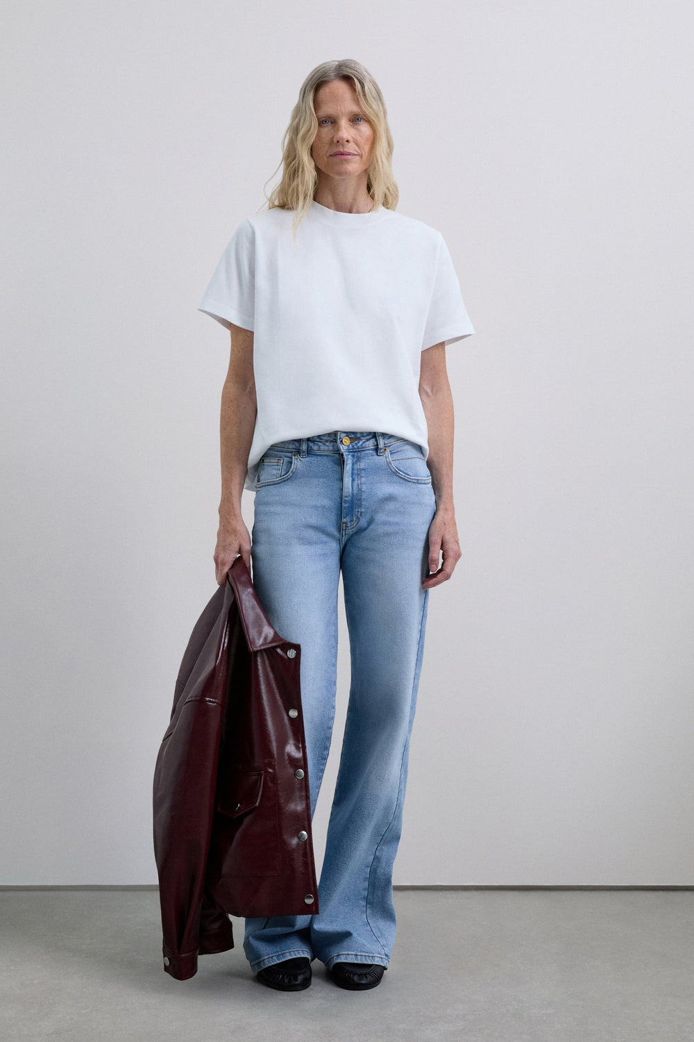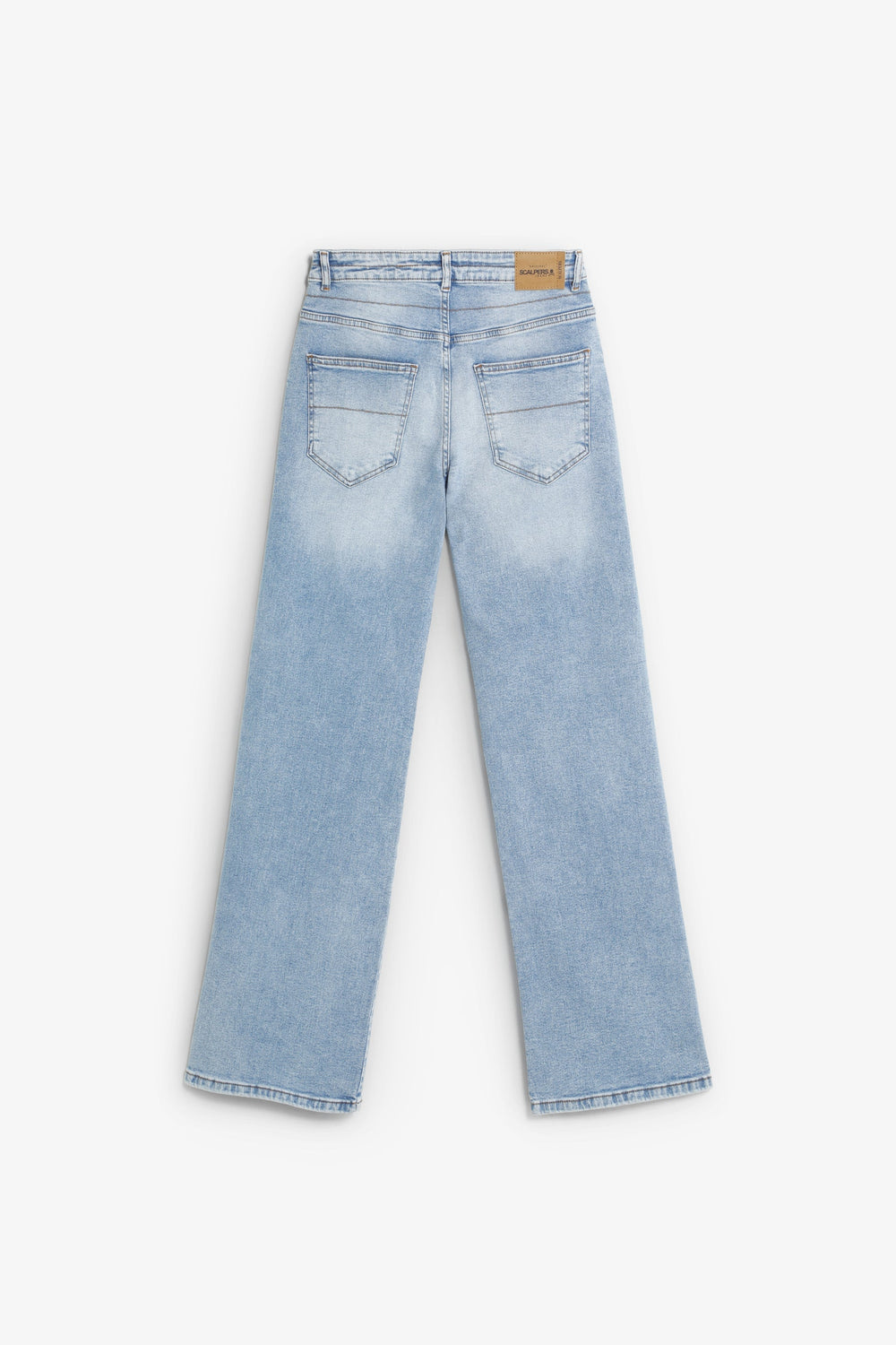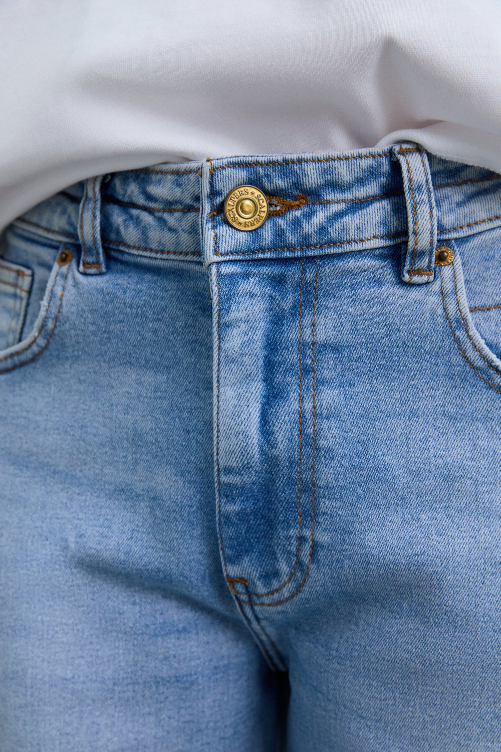 Pantalón denim confeccionado en 100% algodón ligeramente elástico. Corte regular fit, full length. Tiro medio con cierre de cremallera y botón. Trabillas en cintura. Bolsillos delanteros y traseros.
