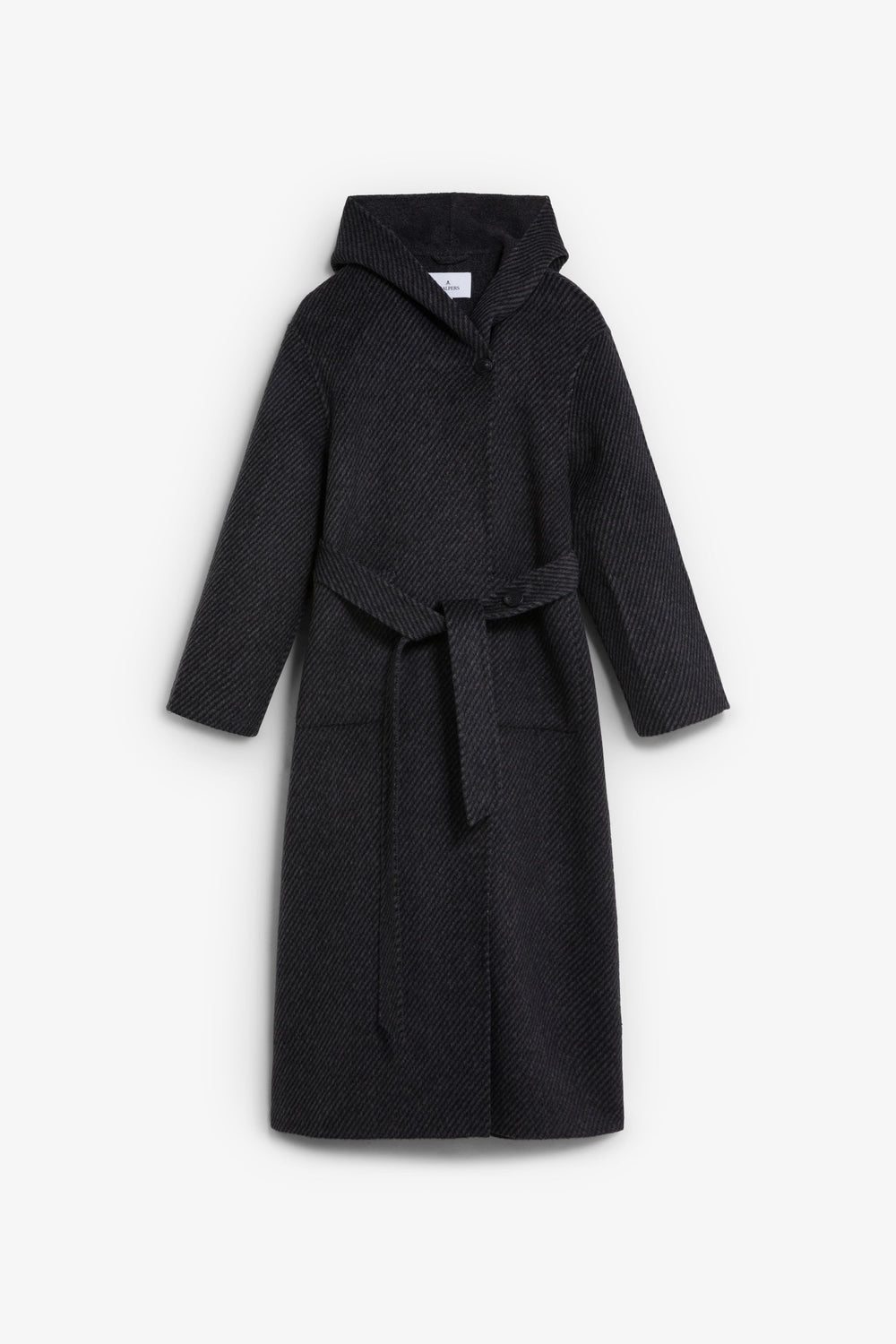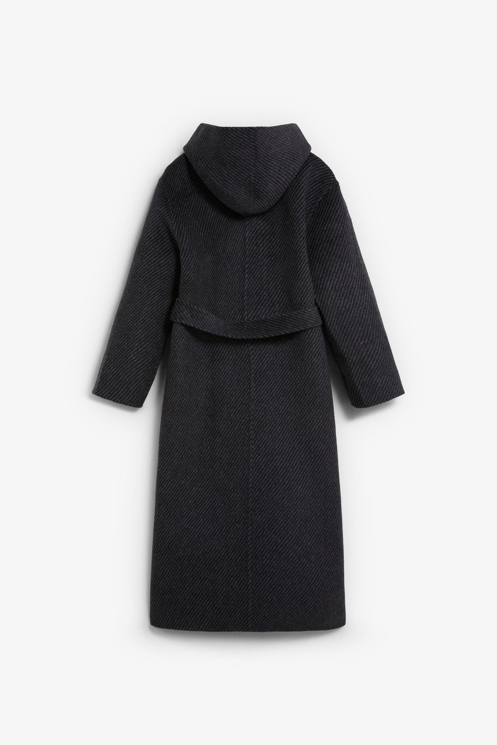 Abrigo largo con capucha confeccionado en mezcla de lana. Exterior con raya en diagonal. Dos bolsillos en frontal. Cierre mediante cinturón.