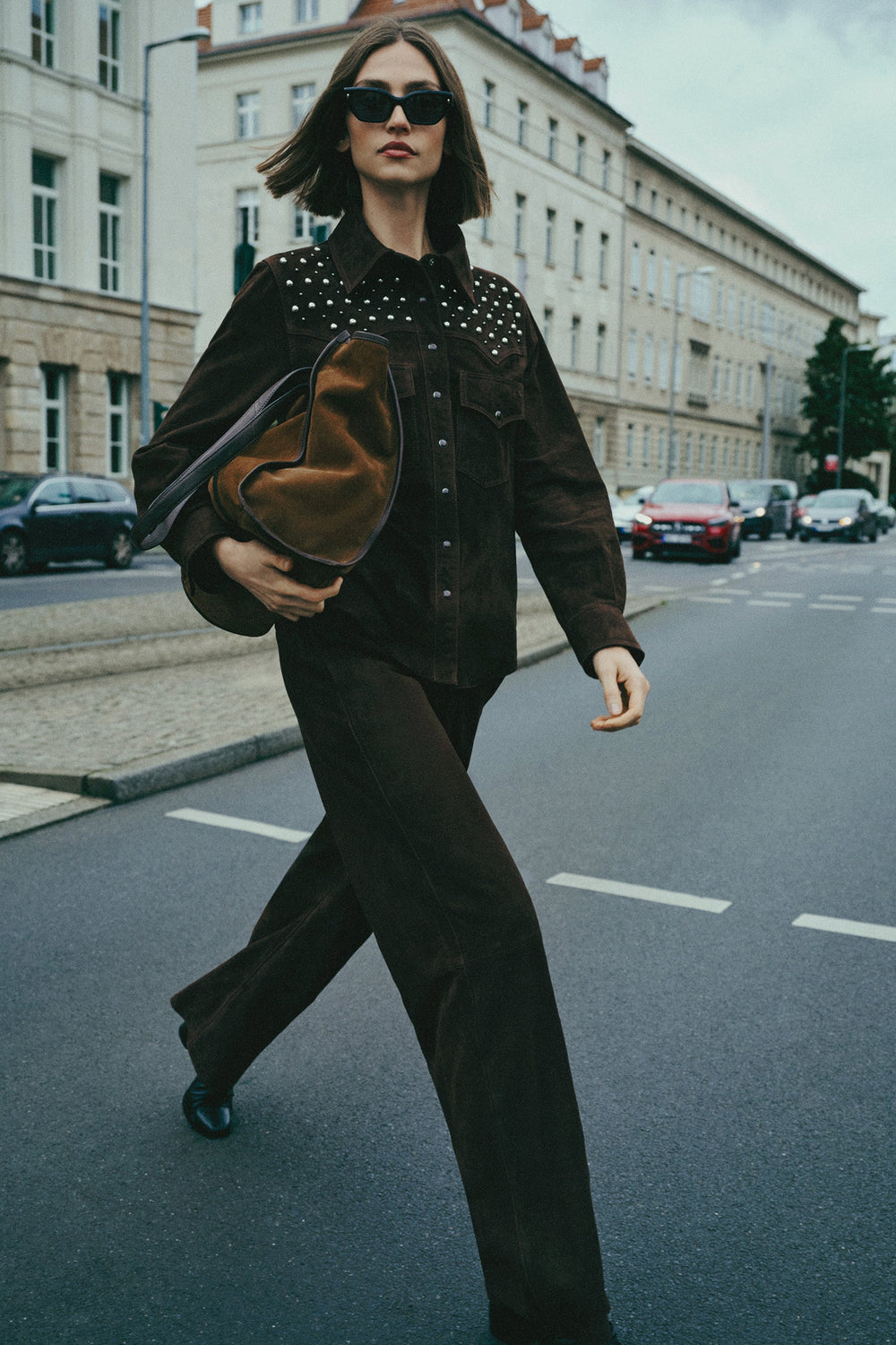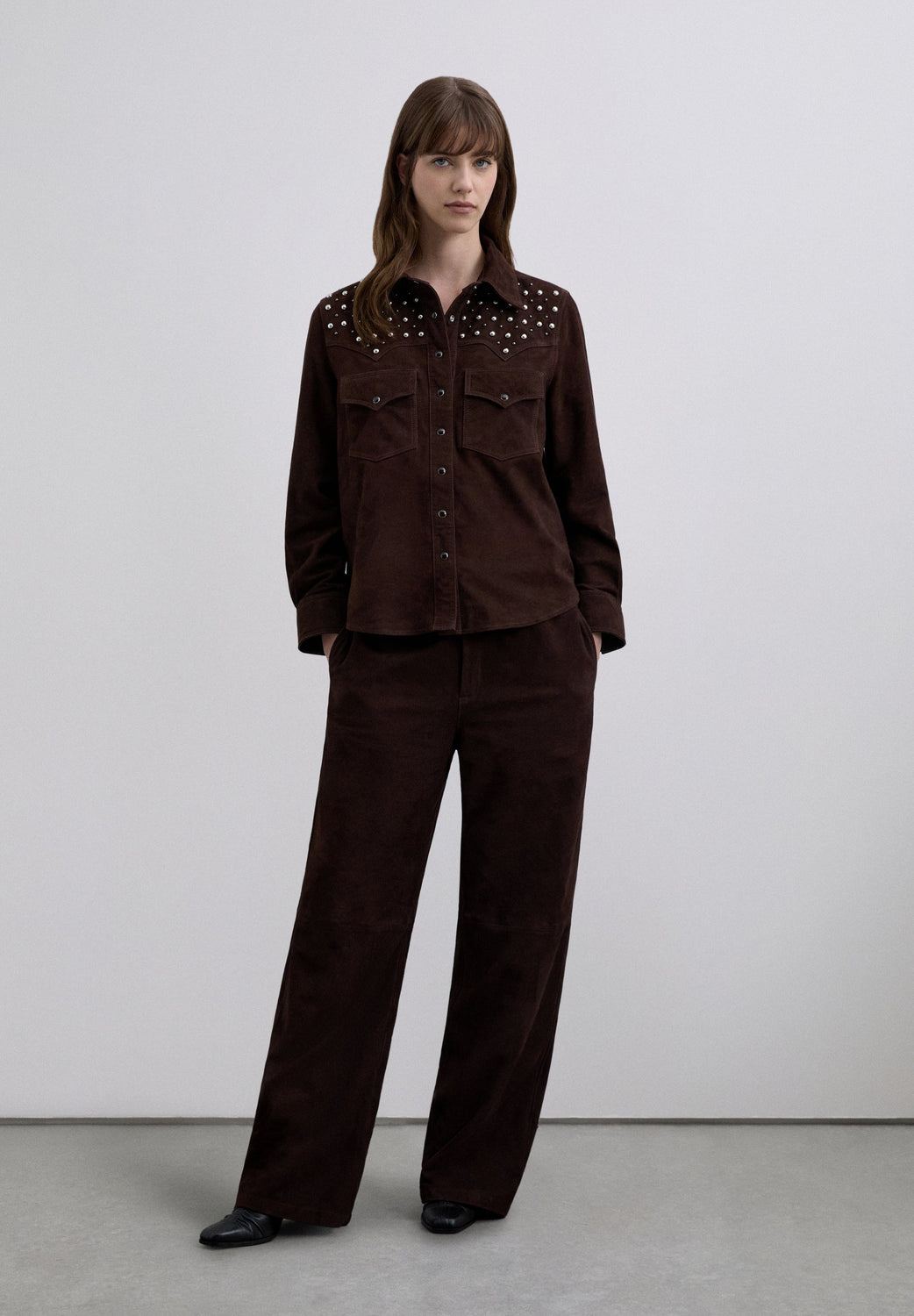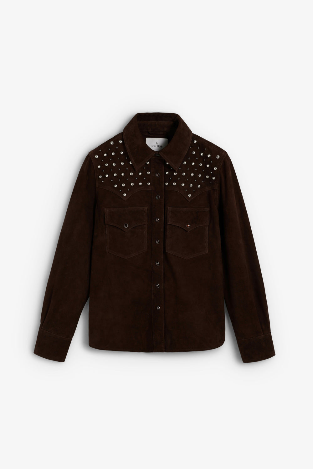 Camisa confeccionada 100% en ante. Manga larga y cierre con botones en la parte frontal y en las mangas. Detalle de costuras en la espalda. Detalle de tachuelas al rededor del cuello.