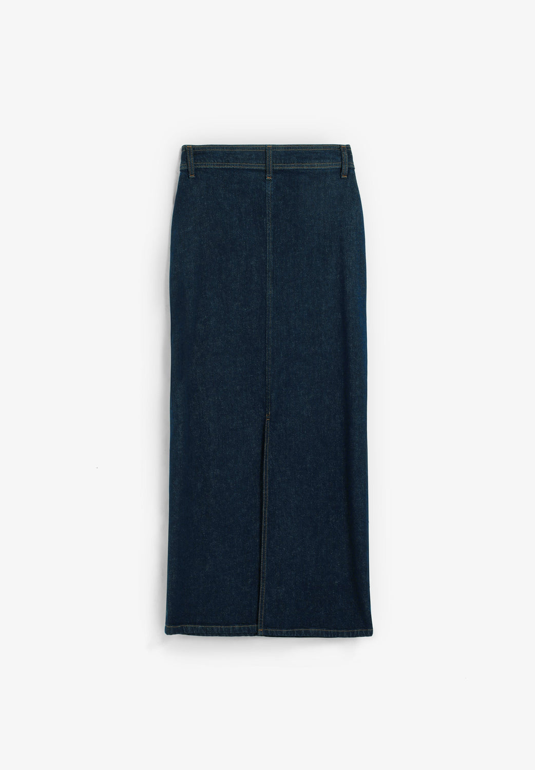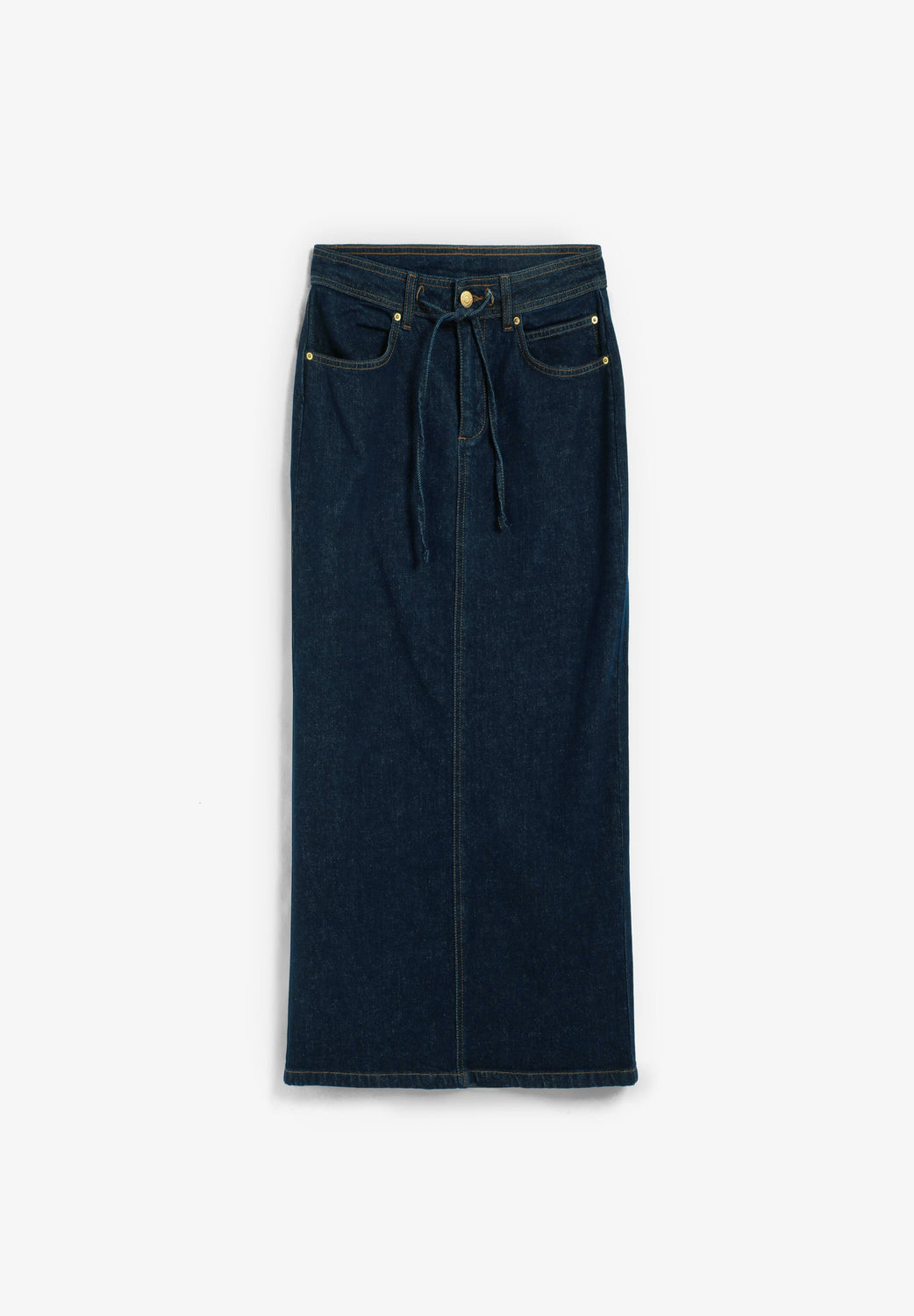 Falda denim confeccionada en 100% algodón BCI. Corte midi, cierre mediante cremallera y botón con detalle de cordón en cintura. Bolsillos delanteros. Abertura trasera.