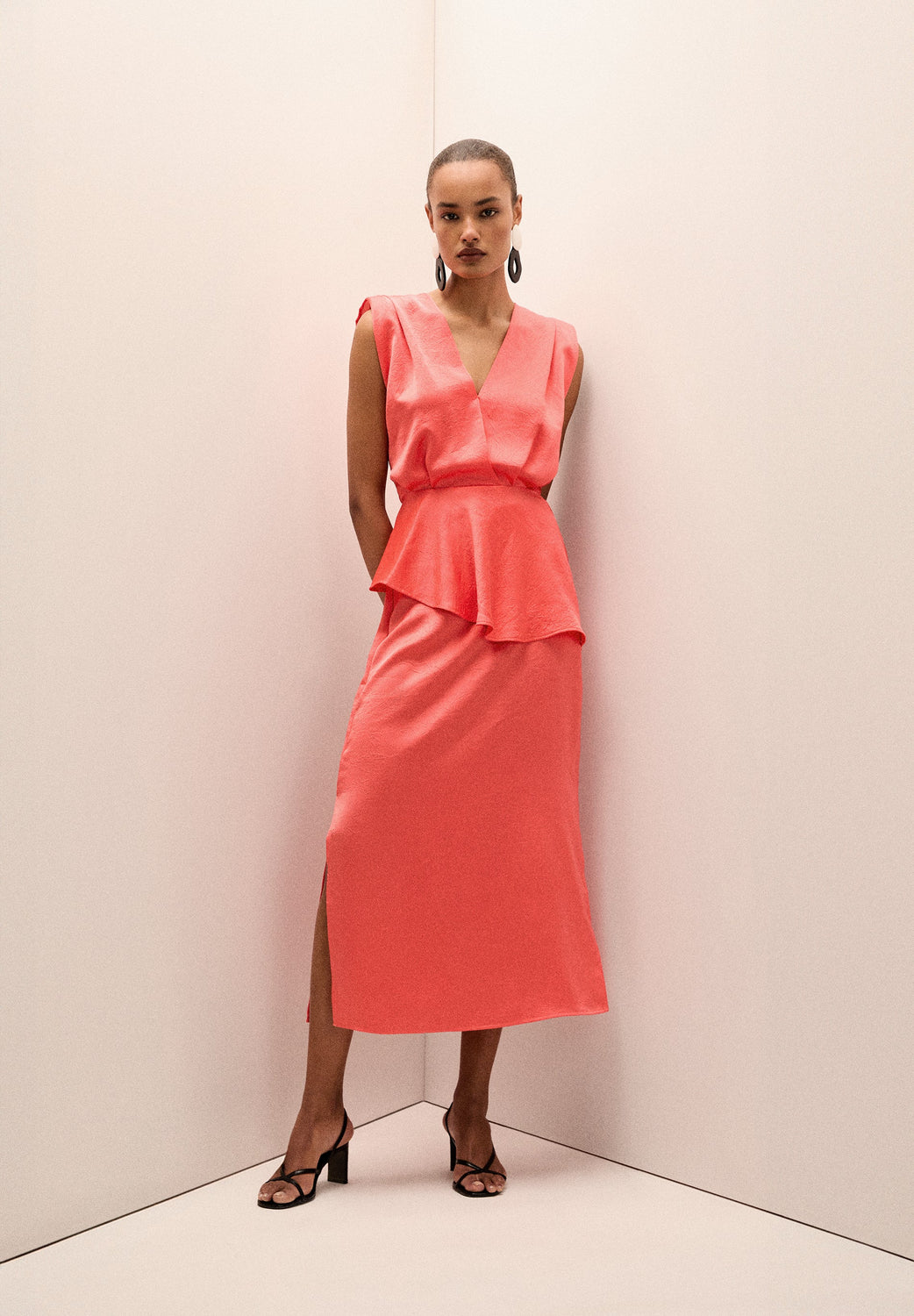 Falda midi confeccionada en tejido fluido con textura. Cierre con cremallera oculta lateral y abertura en pierna.