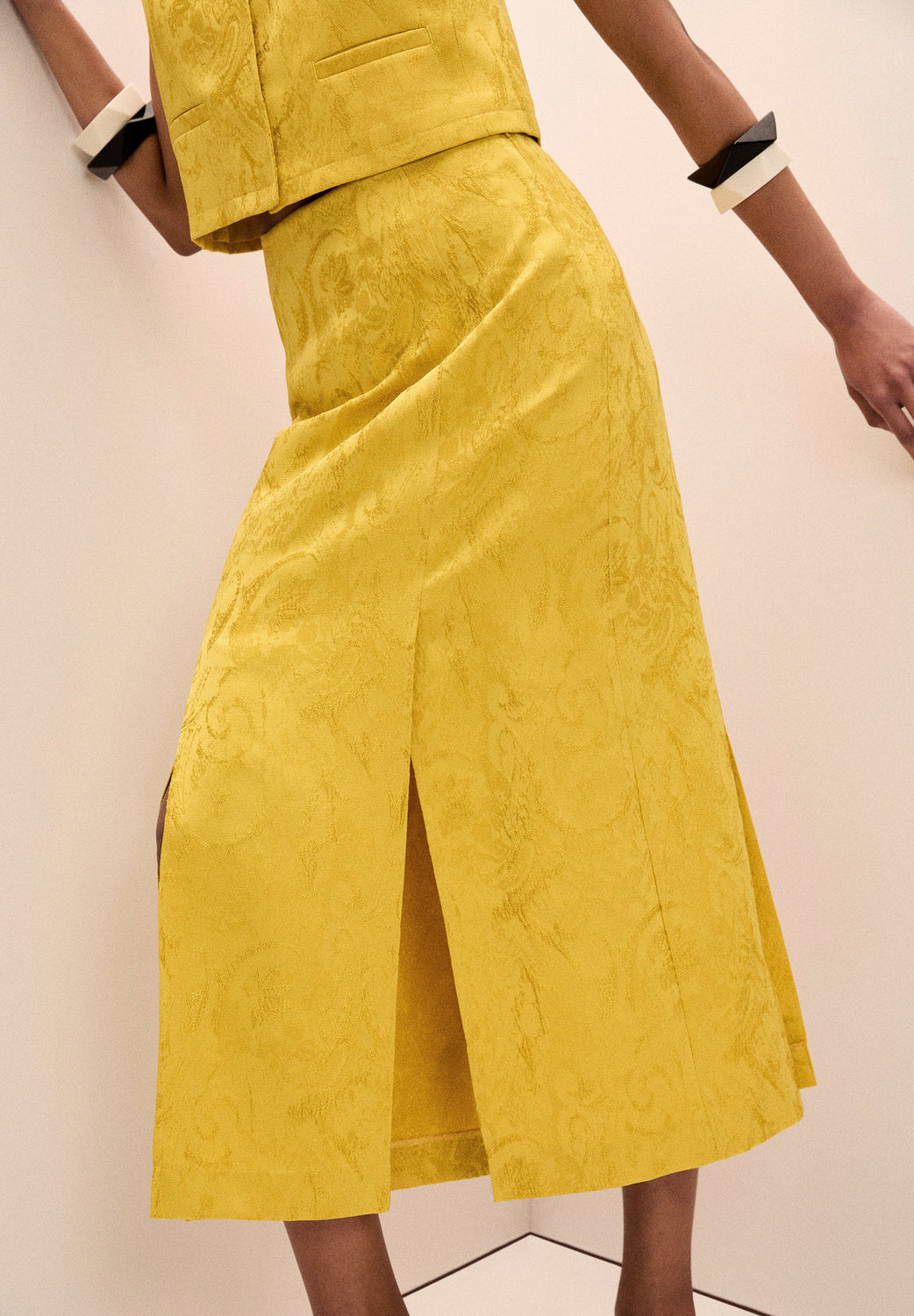 Falda confeccionada en tejido satinado con jacquard ligeramente elástico. Corte slim fit, midi, con aberturas de paneles en el bajo. Cierre con cremallera oculta.