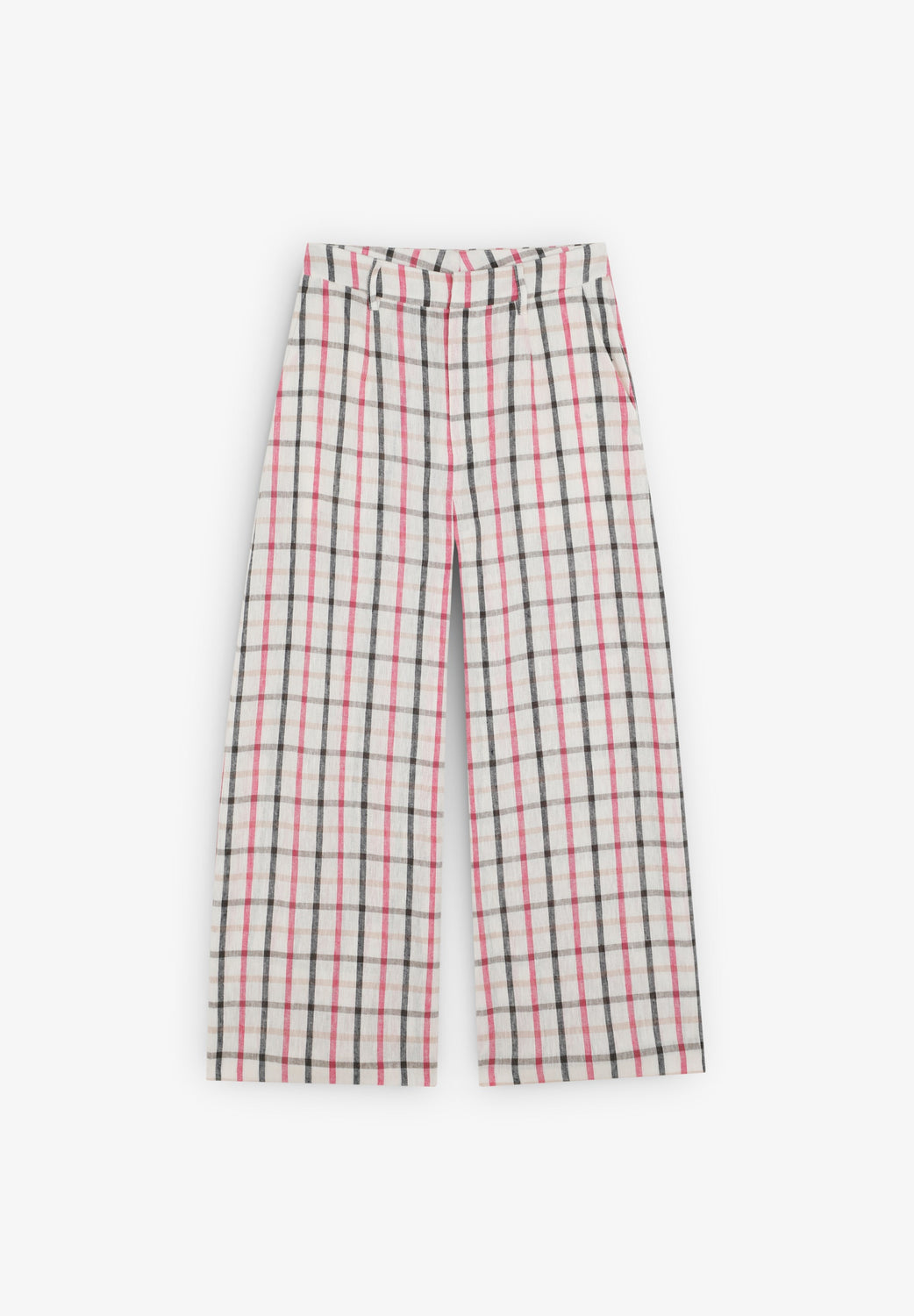 Pantalón confeccionado en Lino y Algodón Orgánico BCI. Culotte Fit. Forro interior 100% Algodón. Dos bolsillos laterales y dos posteriores. Estampado Vichy. Cierre mediante botón y cremallera ocultos en frontal.