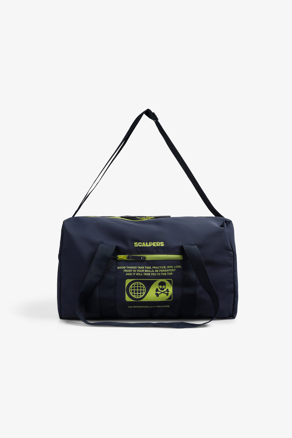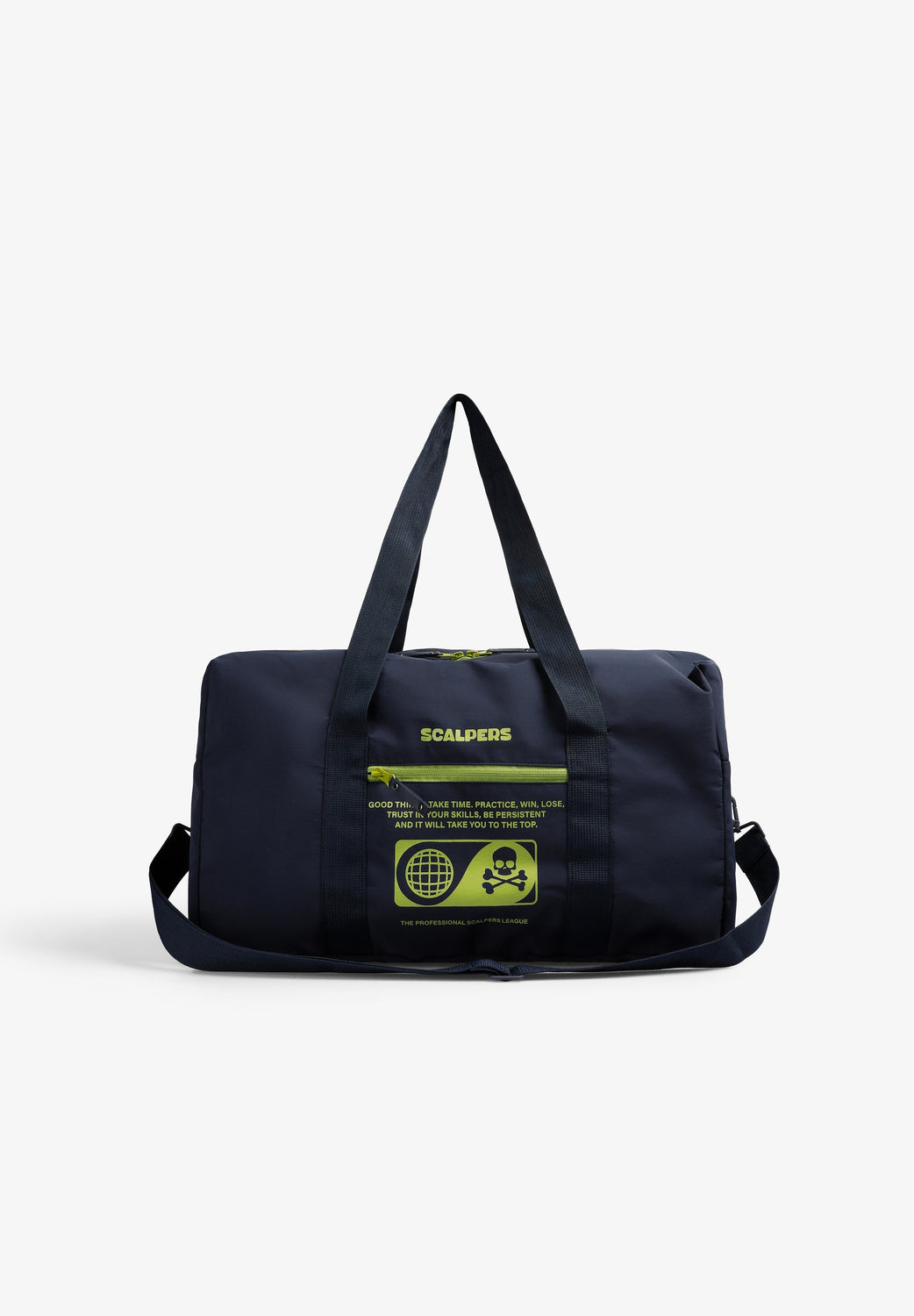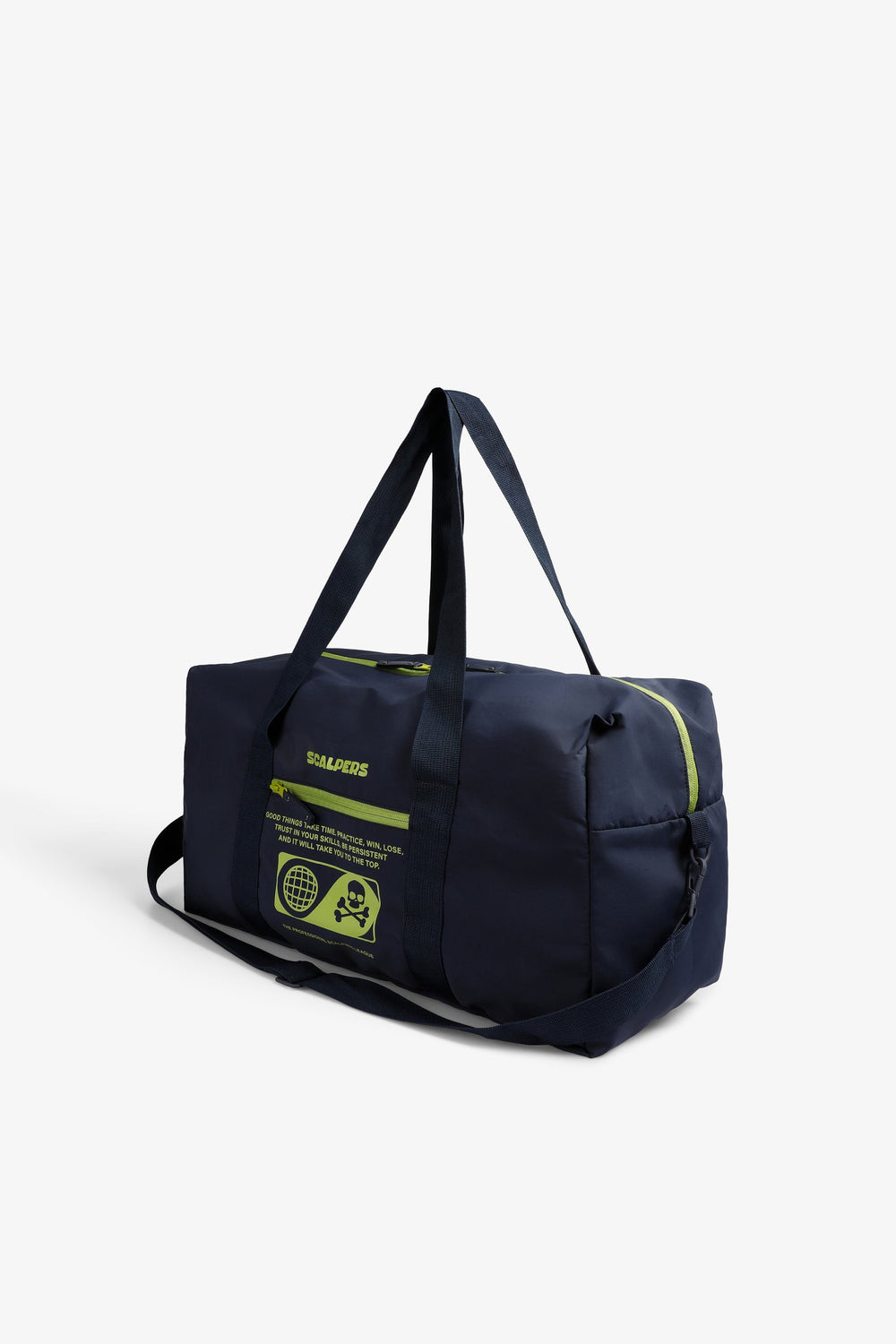 Bolsa confeccionada en tejido técnico. Compartimento principal y lateral con cierre por cremallera. Cierre con cremallera, asas cortas y asa larga desmontable. Print frontal con logo y calavera.