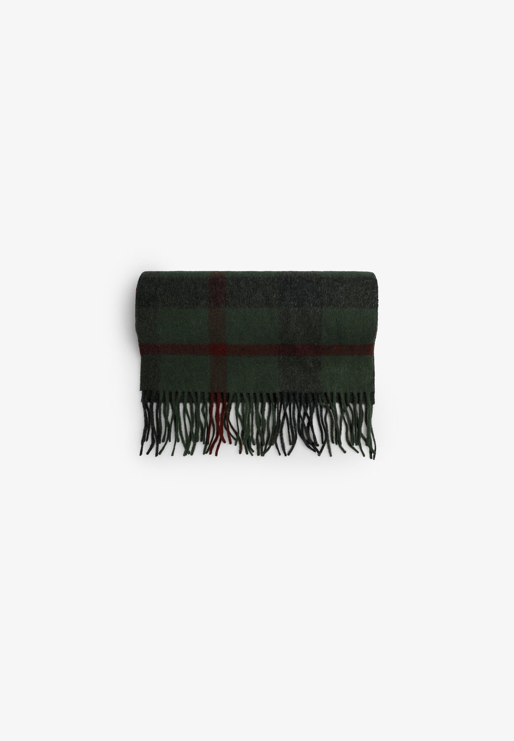 Bufanda confeccionada en mezcla de lana y cashmere. Estampado tartán. Flecos. Logotipo bordado. Detalle de etiqueta.