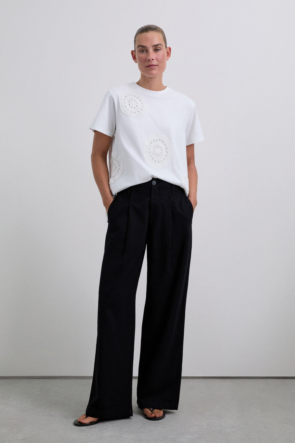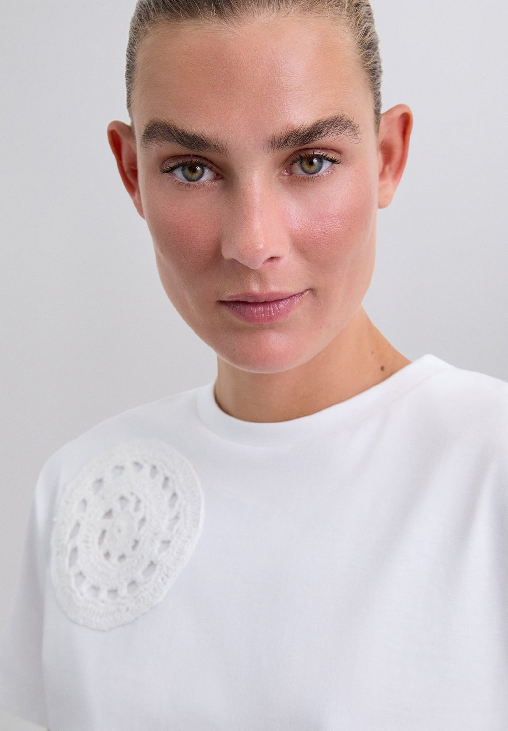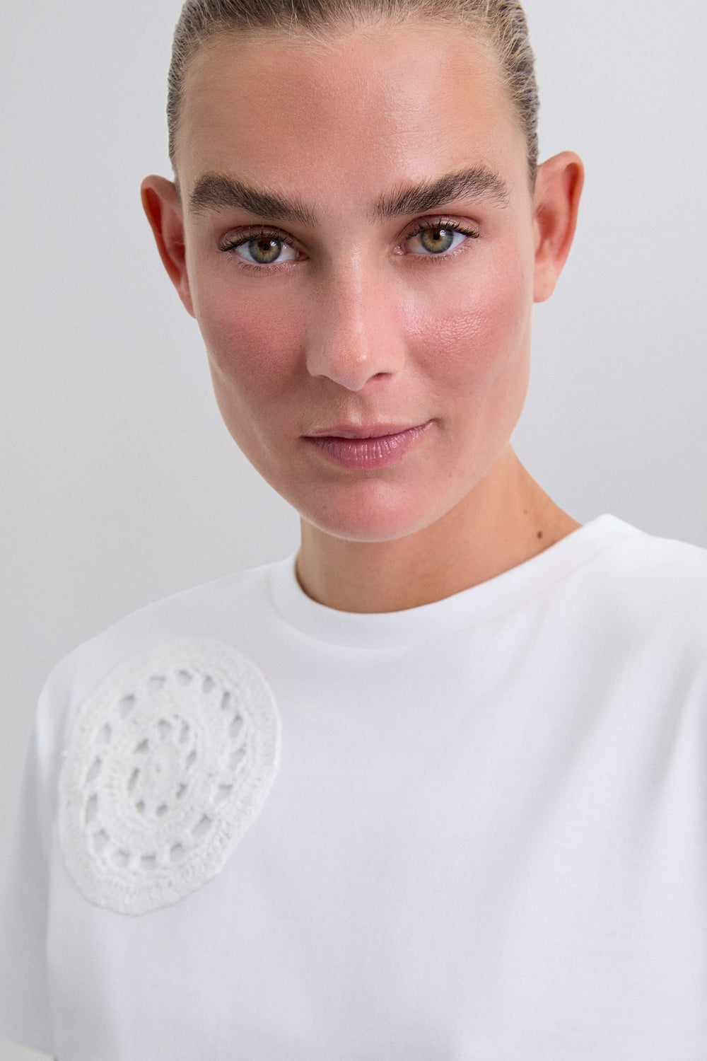 Camiseta confeccionada en algodón 100% BCI. Motivos Crochet en pecho y espalda. Corte regular fit, cuello redondo y manga corta.