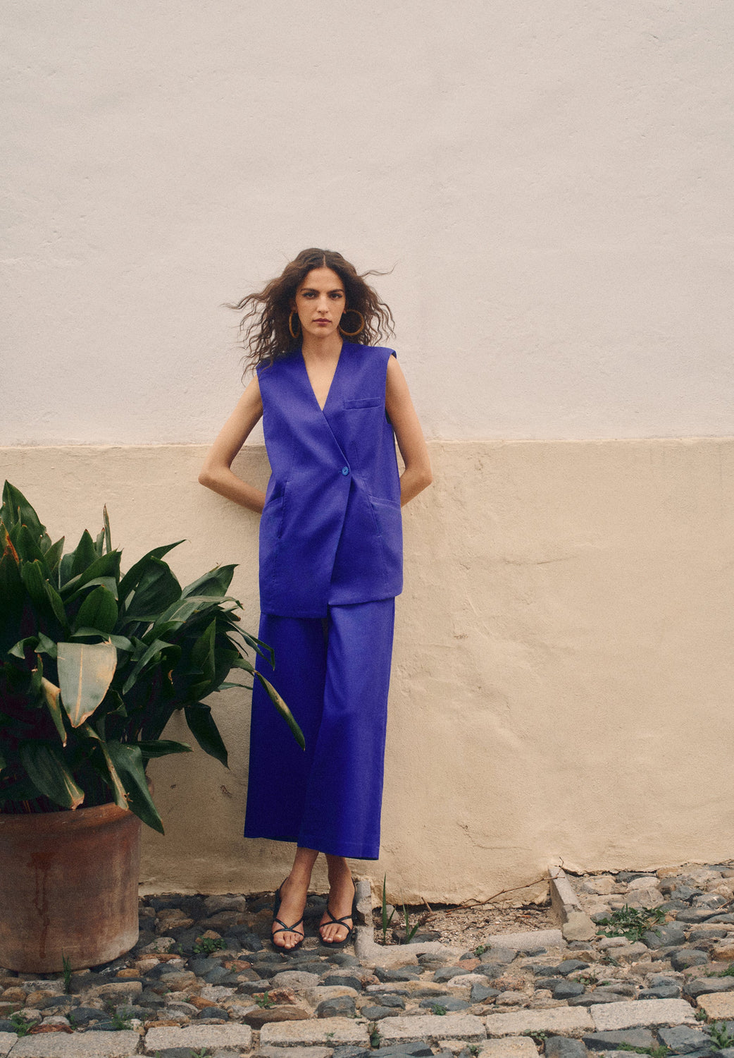 Pantalón confeccionado en Lino. Full Lenght. Dos bolsillos en laterales y dos posteriores. Cinturilla asimétrica. Cierre mediante botón y cremallera ocultos a tono.